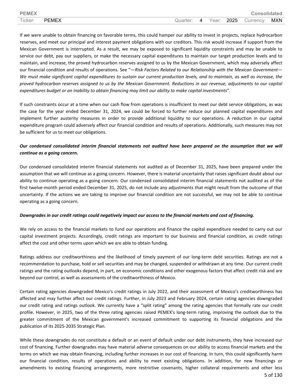 PEMEX Consolidated Ticker: PEMEX Quarter: 4 Year: 2025 Currency: MXN 5 of 130 If we were unable to obtain financing on favorable terms, this could hamper our ability to invest in projects, replace hydrocarbon reserves, and meet our principal and interest payment obligations with our creditors. This risk would increase if support from the Mexican Government is interrupted. As a result, we may be exposed to significant liquidity constraints and may be unable to service our debt, pay our suppliers, or make the necessary capital expenditures to maintain our target production levels and to maintain, and increase, the proved hydrocarbon reserves assigned to us by the Mexican Government, which may adversely affect our financial condition and results of operations. See “—Risk Factors Related to our Relationship with the Mexican Government— We must make significant capital expenditures to sustain our current production levels, and to maintain, as well as increase, the proved hydrocarbon reserves assigned to us by the Mexican Government. Reductions in our revenue, adjustments to our capital expenditures budget or an inability to obtain financing may limit our ability to make capital investments”. If such constraints occur at a time when our cash flow from operations is insufficient to meet our debt service obligations, as was the case for the year ended December 31, 2024, we could be forced to further reduce our planned capital expenditures and implement further austerity measures in order to provide additional liquidity to our operations. A reduction in our capital expenditure program could adversely affect our financial condition and results of operations. Additionally, such measures may not be sufficient for us to meet our obligations. Our condensed consolidated interim financial statements not audited have been prepared on the assumption that we will continue as a going concern. Our condensed consolidated interim financial statements not audited as of December 31, 2025, have been prepared under the assumption that we will continue as a going concern. However, there is material uncertainty that raises significant doubt about our ability to continue operating as a going concern. Our condensed consolidated interim financial statements not audited as of the first twelve-month period ended December 31, 2025, do not include any adjustments that might result from the outcome of that uncertainty. If the actions we are taking to improve our financial condition are not successful, we may not be able to continue operating as a going concern. Downgrades in our credit ratings could negatively impact our access to the financial markets and cost of financing. We rely on access to the financial markets to fund our operations and finance the capital expenditure needed to carry out our capital investment projects. Accordingly, credit ratings are important to our business and financial condition, as credit ratings affect the cost and other terms upon which we are able to obtain funding. Ratings address our creditworthiness and the likelihood of timely payment of our long-term debt securities. Ratings are not a recommendation to purchase, hold or sell securities and may be changed, suspended or withdrawn at any time. Our current credit ratings and the rating outlooks depend, in part, on economic conditions and other exogenous factors that affect credit risk and are beyond our control, as well as assessments of the creditworthiness of Mexico. Certain rating agencies downgraded Mexico’s credit ratings in July 2022, and their assessment of Mexico’s creditworthiness has affected and may further affect our credit ratings. Further, in July 2023 and February 2024, certain rating agencies downgraded our credit rating and ratings outlook. We currently have a “split rating” among the rating agencies that formally rate our credit profile. However, in 2025, two of the three rating agencies raised PEMEX's long-term rating, improving the outlook due to the greater commitment of the Mexican government's increased commitment to supporting its financial obligations and the publication of its 2025-2035 Strategic Plan. While these downgrades do not constitute a default or an event of default under our debt instruments, they have increased our cost of financing. Further downgrades may have material adverse consequences on our ability to access financial markets and the terms on which we may obtain financing, including further increases in our cost of financing. In turn, this could significantly harm our financial condition, results of operations and ability to meet existing obligations. In addition, for new financings or amendments to existing financing arrangements, more restrictive covenants, higher collateral requirements and other less