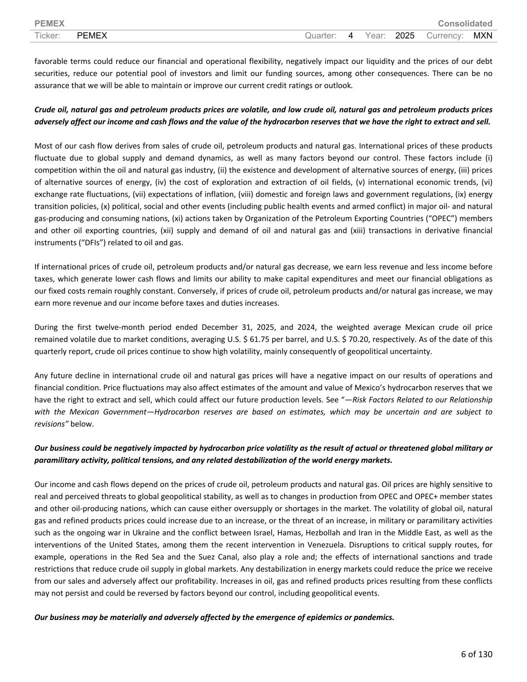 PEMEX Consolidated Ticker: PEMEX Quarter: 4 Year: 2025 Currency: MXN 6 of 130 favorable terms could reduce our financial and operational flexibility, negatively impact our liquidity and the prices of our debt securities, reduce our potential pool of investors and limit our funding sources, among other consequences. There can be no assurance that we will be able to maintain or improve our current credit ratings or outlook. Crude oil, natural gas and petroleum products prices are volatile, and low crude oil, natural gas and petroleum products prices adversely affect our income and cash flows and the value of the hydrocarbon reserves that we have the right to extract and sell. Most of our cash flow derives from sales of crude oil, petroleum products and natural gas. International prices of these products fluctuate due to global supply and demand dynamics, as well as many factors beyond our control. These factors include (i) competition within the oil and natural gas industry, (ii) the existence and development of alternative sources of energy, (iii) prices of alternative sources of energy, (iv) the cost of exploration and extraction of oil fields, (v) international economic trends, (vi) exchange rate fluctuations, (vii) expectations of inflation, (viii) domestic and foreign laws and government regulations, (ix) energy transition policies, (x) political, social and other events (including public health events and armed conflict) in major oil- and natural gas-producing and consuming nations, (xi) actions taken by Organization of the Petroleum Exporting Countries (“OPEC”) members and other oil exporting countries, (xii) supply and demand of oil and natural gas and (xiii) transactions in derivative financial instruments (“DFIs”) related to oil and gas. If international prices of crude oil, petroleum products and/or natural gas decrease, we earn less revenue and less income before taxes, which generate lower cash flows and limits our ability to make capital expenditures and meet our financial obligations as our fixed costs remain roughly constant. Conversely, if prices of crude oil, petroleum products and/or natural gas increase, we may earn more revenue and our income before taxes and duties increases. During the first twelve-month period ended December 31, 2025, and 2024, the weighted average Mexican crude oil price remained volatile due to market conditions, averaging U.S. $ 61.75 per barrel, and U.S. $ 70.20, respectively. As of the date of this quarterly report, crude oil prices continue to show high volatility, mainly consequently of geopolitical uncertainty. Any future decline in international crude oil and natural gas prices will have a negative impact on our results of operations and financial condition. Price fluctuations may also affect estimates of the amount and value of Mexico’s hydrocarbon reserves that we have the right to extract and sell, which could affect our future production levels. See “—Risk Factors Related to our Relationship with the Mexican Government—Hydrocarbon reserves are based on estimates, which may be uncertain and are subject to revisions” below. Our business could be negatively impacted by hydrocarbon price volatility as the result of actual or threatened global military or paramilitary activity, political tensions, and any related destabilization of the world energy markets. Our income and cash flows depend on the prices of crude oil, petroleum products and natural gas. Oil prices are highly sensitive to real and perceived threats to global geopolitical stability, as well as to changes in production from OPEC and OPEC+ member states and other oil-producing nations, which can cause either oversupply or shortages in the market. The volatility of global oil, natural gas and refined products prices could increase due to an increase, or the threat of an increase, in military or paramilitary activities such as the ongoing war in Ukraine and the conflict between Israel, Hamas, Hezbollah and Iran in the Middle East, as well as the interventions of the United States, among them the recent intervention in Venezuela. Disruptions to critical supply routes, for example, operations in the Red Sea and the Suez Canal, also play a role and; the effects of international sanctions and trade restrictions that reduce crude oil supply in global markets. Any destabilization in energy markets could reduce the price we receive from our sales and adversely affect our profitability. Increases in oil, gas and refined products prices resulting from these conflicts may not persist and could be reversed by factors beyond our control, including geopolitical events. Our business may be materially and adversely affected by the emergence of epidemics or pandemics.