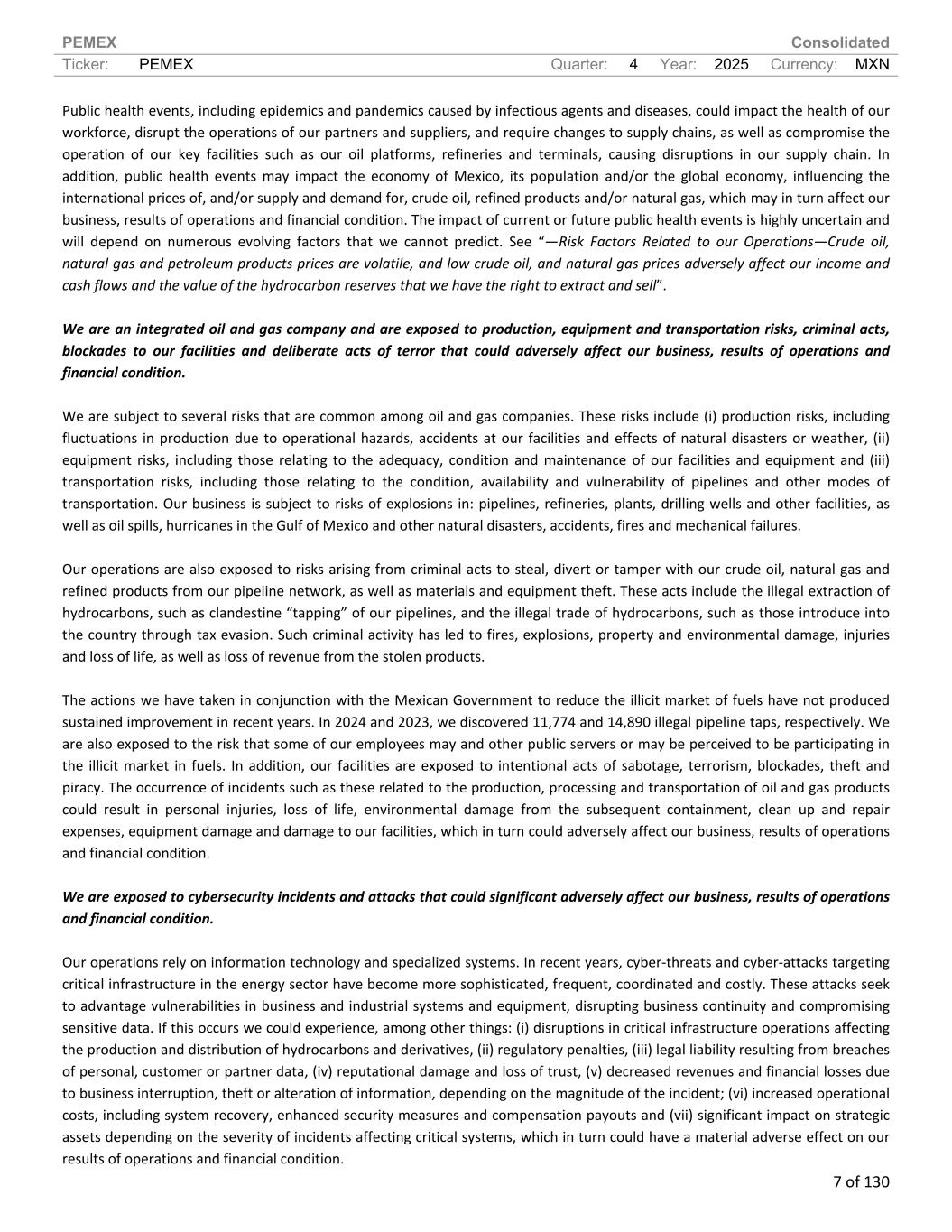 PEMEX Consolidated Ticker: PEMEX Quarter: 4 Year: 2025 Currency: MXN 7 of 130 Public health events, including epidemics and pandemics caused by infectious agents and diseases, could impact the health of our workforce, disrupt the operations of our partners and suppliers, and require changes to supply chains, as well as compromise the operation of our key facilities such as our oil platforms, refineries and terminals, causing disruptions in our supply chain. In addition, public health events may impact the economy of Mexico, its population and/or the global economy, influencing the international prices of, and/or supply and demand for, crude oil, refined products and/or natural gas, which may in turn affect our business, results of operations and financial condition. The impact of current or future public health events is highly uncertain and will depend on numerous evolving factors that we cannot predict. See “—Risk Factors Related to our Operations—Crude oil, natural gas and petroleum products prices are volatile, and low crude oil, and natural gas prices adversely affect our income and cash flows and the value of the hydrocarbon reserves that we have the right to extract and sell”. We are an integrated oil and gas company and are exposed to production, equipment and transportation risks, criminal acts, blockades to our facilities and deliberate acts of terror that could adversely affect our business, results of operations and financial condition. We are subject to several risks that are common among oil and gas companies. These risks include (i) production risks, including fluctuations in production due to operational hazards, accidents at our facilities and effects of natural disasters or weather, (ii) equipment risks, including those relating to the adequacy, condition and maintenance of our facilities and equipment and (iii) transportation risks, including those relating to the condition, availability and vulnerability of pipelines and other modes of transportation. Our business is subject to risks of explosions in: pipelines, refineries, plants, drilling wells and other facilities, as well as oil spills, hurricanes in the Gulf of Mexico and other natural disasters, accidents, fires and mechanical failures. Our operations are also exposed to risks arising from criminal acts to steal, divert or tamper with our crude oil, natural gas and refined products from our pipeline network, as well as materials and equipment theft. These acts include the illegal extraction of hydrocarbons, such as clandestine “tapping” of our pipelines, and the illegal trade of hydrocarbons, such as those introduce into the country through tax evasion. Such criminal activity has led to fires, explosions, property and environmental damage, injuries and loss of life, as well as loss of revenue from the stolen products. The actions we have taken in conjunction with the Mexican Government to reduce the illicit market of fuels have not produced sustained improvement in recent years. In 2024 and 2023, we discovered 11,774 and 14,890 illegal pipeline taps, respectively. We are also exposed to the risk that some of our employees may and other public servers or may be perceived to be participating in the illicit market in fuels. In addition, our facilities are exposed to intentional acts of sabotage, terrorism, blockades, theft and piracy. The occurrence of incidents such as these related to the production, processing and transportation of oil and gas products could result in personal injuries, loss of life, environmental damage from the subsequent containment, clean up and repair expenses, equipment damage and damage to our facilities, which in turn could adversely affect our business, results of operations and financial condition. We are exposed to cybersecurity incidents and attacks that could significant adversely affect our business, results of operations and financial condition. Our operations rely on information technology and specialized systems. In recent years, cyber-threats and cyber-attacks targeting critical infrastructure in the energy sector have become more sophisticated, frequent, coordinated and costly. These attacks seek to advantage vulnerabilities in business and industrial systems and equipment, disrupting business continuity and compromising sensitive data. If this occurs we could experience, among other things: (i) disruptions in critical infrastructure operations affecting the production and distribution of hydrocarbons and derivatives, (ii) regulatory penalties, (iii) legal liability resulting from breaches of personal, customer or partner data, (iv) reputational damage and loss of trust, (v) decreased revenues and financial losses due to business interruption, theft or alteration of information, depending on the magnitude of the incident; (vi) increased operational costs, including system recovery, enhanced security measures and compensation payouts and (vii) significant impact on strategic assets depending on the severity of incidents affecting critical systems, which in turn could have a material adverse effect on our results of operations and financial condition.