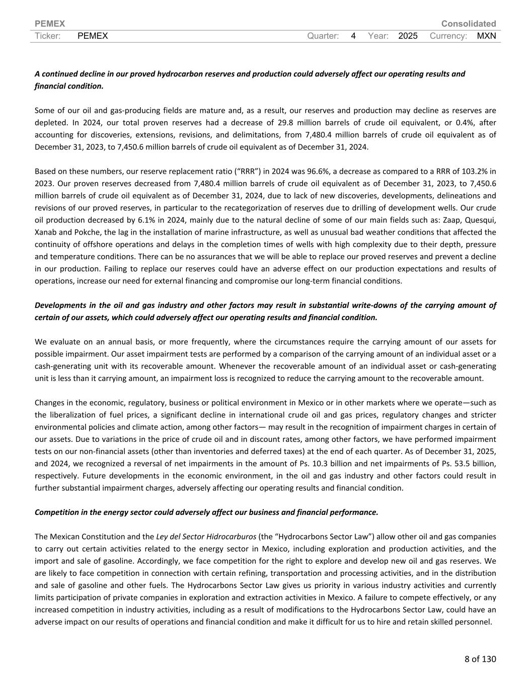 PEMEX Consolidated Ticker: PEMEX Quarter: 4 Year: 2025 Currency: MXN 8 of 130 A continued decline in our proved hydrocarbon reserves and production could adversely affect our operating results and financial condition. Some of our oil and gas-producing fields are mature and, as a result, our reserves and production may decline as reserves are depleted. In 2024, our total proven reserves had a decrease of 29.8 million barrels of crude oil equivalent, or 0.4%, after accounting for discoveries, extensions, revisions, and delimitations, from 7,480.4 million barrels of crude oil equivalent as of December 31, 2023, to 7,450.6 million barrels of crude oil equivalent as of December 31, 2024. Based on these numbers, our reserve replacement ratio (“RRR”) in 2024 was 96.6%, a decrease as compared to a RRR of 103.2% in 2023. Our proven reserves decreased from 7,480.4 million barrels of crude oil equivalent as of December 31, 2023, to 7,450.6 million barrels of crude oil equivalent as of December 31, 2024, due to lack of new discoveries, developments, delineations and revisions of our proved reserves, in particular to the recategorization of reserves due to drilling of development wells. Our crude oil production decreased by 6.1% in 2024, mainly due to the natural decline of some of our main fields such as: Zaap, Quesqui, Xanab and Pokche, the lag in the installation of marine infrastructure, as well as unusual bad weather conditions that affected the continuity of offshore operations and delays in the completion times of wells with high complexity due to their depth, pressure and temperature conditions. There can be no assurances that we will be able to replace our proved reserves and prevent a decline in our production. Failing to replace our reserves could have an adverse effect on our production expectations and results of operations, increase our need for external financing and compromise our long-term financial conditions. Developments in the oil and gas industry and other factors may result in substantial write-downs of the carrying amount of certain of our assets, which could adversely affect our operating results and financial condition. We evaluate on an annual basis, or more frequently, where the circumstances require the carrying amount of our assets for possible impairment. Our asset impairment tests are performed by a comparison of the carrying amount of an individual asset or a cash-generating unit with its recoverable amount. Whenever the recoverable amount of an individual asset or cash-generating unit is less than it carrying amount, an impairment loss is recognized to reduce the carrying amount to the recoverable amount. Changes in the economic, regulatory, business or political environment in Mexico or in other markets where we operate—such as the liberalization of fuel prices, a significant decline in international crude oil and gas prices, regulatory changes and stricter environmental policies and climate action, among other factors— may result in the recognition of impairment charges in certain of our assets. Due to variations in the price of crude oil and in discount rates, among other factors, we have performed impairment tests on our non-financial assets (other than inventories and deferred taxes) at the end of each quarter. As of December 31, 2025, and 2024, we recognized a reversal of net impairments in the amount of Ps. 10.3 billion and net impairments of Ps. 53.5 billion, respectively. Future developments in the economic environment, in the oil and gas industry and other factors could result in further substantial impairment charges, adversely affecting our operating results and financial condition. Competition in the energy sector could adversely affect our business and financial performance. The Mexican Constitution and the Ley del Sector Hidrocarburos (the “Hydrocarbons Sector Law”) allow other oil and gas companies to carry out certain activities related to the energy sector in Mexico, including exploration and production activities, and the import and sale of gasoline. Accordingly, we face competition for the right to explore and develop new oil and gas reserves. We are likely to face competition in connection with certain refining, transportation and processing activities, and in the distribution and sale of gasoline and other fuels. The Hydrocarbons Sector Law gives us priority in various industry activities and currently limits participation of private companies in exploration and extraction activities in Mexico. A failure to compete effectively, or any increased competition in industry activities, including as a result of modifications to the Hydrocarbons Sector Law, could have an adverse impact on our results of operations and financial condition and make it difficult for us to hire and retain skilled personnel.