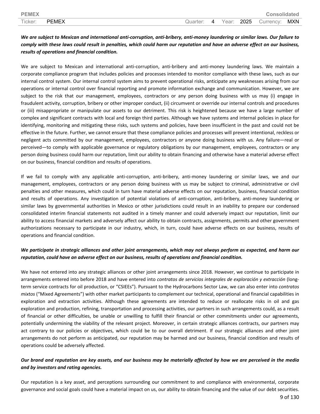 PEMEX Consolidated Ticker: PEMEX Quarter: 4 Year: 2025 Currency: MXN 9 of 130 We are subject to Mexican and international anti-corruption, anti-bribery, anti-money laundering or similar laws. Our failure to comply with these laws could result in penalties, which could harm our reputation and have an adverse effect on our business, results of operations and financial condition. We are subject to Mexican and international anti-corruption, anti-bribery and anti-money laundering laws. We maintain a corporate compliance program that includes policies and processes intended to monitor compliance with these laws, such as our internal control system. Our internal control system aims to prevent operational risks, anticipate any weaknesses arising from our operations or internal control over financial reporting and promote information exchange and communication. However, we are subject to the risk that our management, employees, contractors or any person doing business with us may (i) engage in fraudulent activity, corruption, bribery or other improper conduct, (ii) circumvent or override our internal controls and procedures or (iii) misappropriate or manipulate our assets to our detriment. This risk is heightened because we have a large number of complex and significant contracts with local and foreign third parties. Although we have systems and internal policies in place for identifying, monitoring and mitigating these risks, such systems and policies, have been insufficient in the past and could not be effective in the future. Further, we cannot ensure that these compliance policies and processes will prevent intentional, reckless or negligent acts committed by our management, employees, contractors or anyone doing business with us. Any failure—real or perceived—to comply with applicable governance or regulatory obligations by our management, employees, contractors or any person doing business could harm our reputation, limit our ability to obtain financing and otherwise have a material adverse effect on our business, financial condition and results of operations. If we fail to comply with any applicable anti-corruption, anti-bribery, anti-money laundering or similar laws, we and our management, employees, contractors or any person doing business with us may be subject to criminal, administrative or civil penalties and other measures, which could in turn have material adverse effects on our reputation, business, financial condition and results of operations. Any investigation of potential violations of anti-corruption, anti-bribery, anti-money laundering or similar laws by governmental authorities in Mexico or other jurisdictions could result in an inability to prepare our condensed consolidated interim financial statements not audited in a timely manner and could adversely impact our reputation, limit our ability to access financial markets and adversely affect our ability to obtain contracts, assignments, permits and other government authorizations necessary to participate in our industry, which, in turn, could have adverse effects on our business, results of operations and financial condition. We participate in strategic alliances and other joint arrangements, which may not always perform as expected, and harm our reputation, could have an adverse effect on our business, results of operations and financial condition. We have not entered into any strategic alliances or other joint arrangements since 2018. However, we continue to participate in arrangements entered into before 2018 and have entered into contratos de servicios integrales de exploración y extracción (long- term service contracts for oil production, or “CSIEEs”). Pursuant to the Hydrocarbons Sector Law, we can also enter into contratos mixtos (“Mixed Agreements”) with other market participants to complement our technical, operational and financial capabilities in exploration and extraction activities. Although these agreements are intended to reduce or reallocate risks in oil and gas exploration and production, refining, transportation and processing activities, our partners in such arrangements could, as a result of financial or other difficulties, be unable or unwilling to fulfill their financial or other commitments under our agreements, potentially undermining the viability of the relevant project. Moreover, in certain strategic alliances contracts, our partners may act contrary to our policies or objectives, which could be to our overall detriment. If our strategic alliances and other joint arrangements do not perform as anticipated, our reputation may be harmed and our business, financial condition and results of operations could be adversely affected. Our brand and reputation are key assets, and our business may be materially affected by how we are perceived in the media and by investors and rating agencies. Our reputation is a key asset, and perceptions surrounding our commitment to and compliance with environmental, corporate governance and social goals could have a material impact on us, our ability to obtain financing and the value of our debt securities.