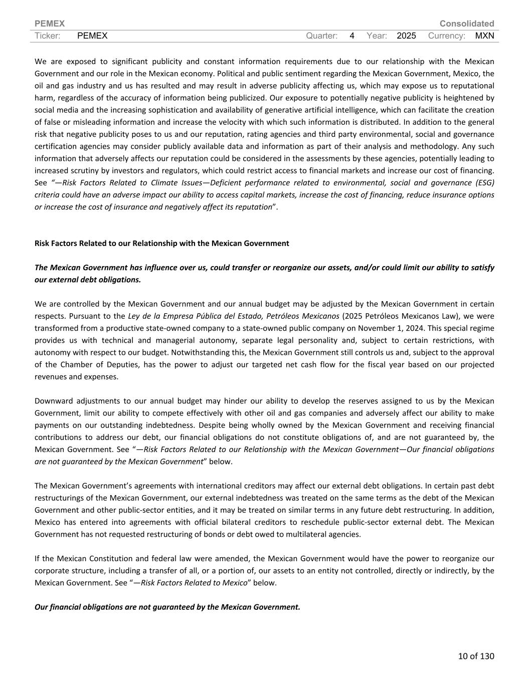 PEMEX Consolidated Ticker: PEMEX Quarter: 4 Year: 2025 Currency: MXN 10 of 130 We are exposed to significant publicity and constant information requirements due to our relationship with the Mexican Government and our role in the Mexican economy. Political and public sentiment regarding the Mexican Government, Mexico, the oil and gas industry and us has resulted and may result in adverse publicity affecting us, which may expose us to reputational harm, regardless of the accuracy of information being publicized. Our exposure to potentially negative publicity is heightened by social media and the increasing sophistication and availability of generative artificial intelligence, which can facilitate the creation of false or misleading information and increase the velocity with which such information is distributed. In addition to the general risk that negative publicity poses to us and our reputation, rating agencies and third party environmental, social and governance certification agencies may consider publicly available data and information as part of their analysis and methodology. Any such information that adversely affects our reputation could be considered in the assessments by these agencies, potentially leading to increased scrutiny by investors and regulators, which could restrict access to financial markets and increase our cost of financing. See “—Risk Factors Related to Climate Issues—Deficient performance related to environmental, social and governance (ESG) criteria could have an adverse impact our ability to access capital markets, increase the cost of financing, reduce insurance options or increase the cost of insurance and negatively affect its reputation”. Risk Factors Related to our Relationship with the Mexican Government The Mexican Government has influence over us, could transfer or reorganize our assets, and/or could limit our ability to satisfy our external debt obligations. We are controlled by the Mexican Government and our annual budget may be adjusted by the Mexican Government in certain respects. Pursuant to the Ley de la Empresa Pública del Estado, Petróleos Mexicanos (2025 Petróleos Mexicanos Law), we were transformed from a productive state-owned company to a state-owned public company on November 1, 2024. This special regime provides us with technical and managerial autonomy, separate legal personality and, subject to certain restrictions, with autonomy with respect to our budget. Notwithstanding this, the Mexican Government still controls us and, subject to the approval of the Chamber of Deputies, has the power to adjust our targeted net cash flow for the fiscal year based on our projected revenues and expenses. Downward adjustments to our annual budget may hinder our ability to develop the reserves assigned to us by the Mexican Government, limit our ability to compete effectively with other oil and gas companies and adversely affect our ability to make payments on our outstanding indebtedness. Despite being wholly owned by the Mexican Government and receiving financial contributions to address our debt, our financial obligations do not constitute obligations of, and are not guaranteed by, the Mexican Government. See “—Risk Factors Related to our Relationship with the Mexican Government—Our financial obligations are not guaranteed by the Mexican Government” below. The Mexican Government’s agreements with international creditors may affect our external debt obligations. In certain past debt restructurings of the Mexican Government, our external indebtedness was treated on the same terms as the debt of the Mexican Government and other public-sector entities, and it may be treated on similar terms in any future debt restructuring. In addition, Mexico has entered into agreements with official bilateral creditors to reschedule public-sector external debt. The Mexican Government has not requested restructuring of bonds or debt owed to multilateral agencies. If the Mexican Constitution and federal law were amended, the Mexican Government would have the power to reorganize our corporate structure, including a transfer of all, or a portion of, our assets to an entity not controlled, directly or indirectly, by the Mexican Government. See “—Risk Factors Related to Mexico” below. Our financial obligations are not guaranteed by the Mexican Government.