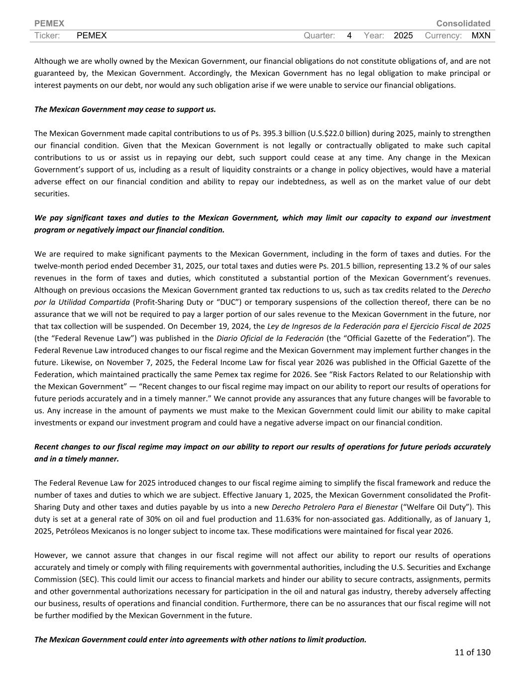 PEMEX Consolidated Ticker: PEMEX Quarter: 4 Year: 2025 Currency: MXN 11 of 130 Although we are wholly owned by the Mexican Government, our financial obligations do not constitute obligations of, and are not guaranteed by, the Mexican Government. Accordingly, the Mexican Government has no legal obligation to make principal or interest payments on our debt, nor would any such obligation arise if we were unable to service our financial obligations. The Mexican Government may cease to support us. The Mexican Government made capital contributions to us of Ps. 395.3 billion (U.S.$22.0 billion) during 2025, mainly to strengthen our financial condition. Given that the Mexican Government is not legally or contractually obligated to make such capital contributions to us or assist us in repaying our debt, such support could cease at any time. Any change in the Mexican Government’s support of us, including as a result of liquidity constraints or a change in policy objectives, would have a material adverse effect on our financial condition and ability to repay our indebtedness, as well as on the market value of our debt securities. We pay significant taxes and duties to the Mexican Government, which may limit our capacity to expand our investment program or negatively impact our financial condition. We are required to make significant payments to the Mexican Government, including in the form of taxes and duties. For the twelve-month period ended December 31, 2025, our total taxes and duties were Ps. 201.5 billion, representing 13.2 % of our sales revenues in the form of taxes and duties, which constituted a substantial portion of the Mexican Government’s revenues. Although on previous occasions the Mexican Government granted tax reductions to us, such as tax credits related to the Derecho por la Utilidad Compartida (Profit-Sharing Duty or “DUC”) or temporary suspensions of the collection thereof, there can be no assurance that we will not be required to pay a larger portion of our sales revenue to the Mexican Government in the future, nor that tax collection will be suspended. On December 19, 2024, the Ley de Ingresos de la Federación para el Ejercicio Fiscal de 2025 (the “Federal Revenue Law”) was published in the Diario Oficial de la Federación (the “Official Gazette of the Federation”). The Federal Revenue Law introduced changes to our fiscal regime and the Mexican Government may implement further changes in the future. Likewise, on November 7, 2025, the Federal Income Law for fiscal year 2026 was published in the Official Gazette of the Federation, which maintained practically the same Pemex tax regime for 2026. See “Risk Factors Related to our Relationship with the Mexican Government” — “Recent changes to our fiscal regime may impact on our ability to report our results of operations for future periods accurately and in a timely manner.” We cannot provide any assurances that any future changes will be favorable to us. Any increase in the amount of payments we must make to the Mexican Government could limit our ability to make capital investments or expand our investment program and could have a negative adverse impact on our financial condition. Recent changes to our fiscal regime may impact on our ability to report our results of operations for future periods accurately and in a timely manner. The Federal Revenue Law for 2025 introduced changes to our fiscal regime aiming to simplify the fiscal framework and reduce the number of taxes and duties to which we are subject. Effective January 1, 2025, the Mexican Government consolidated the Profit- Sharing Duty and other taxes and duties payable by us into a new Derecho Petrolero Para el Bienestar (“Welfare Oil Duty”). This duty is set at a general rate of 30% on oil and fuel production and 11.63% for non-associated gas. Additionally, as of January 1, 2025, Petróleos Mexicanos is no longer subject to income tax. These modifications were maintained for fiscal year 2026. However, we cannot assure that changes in our fiscal regime will not affect our ability to report our results of operations accurately and timely or comply with filing requirements with governmental authorities, including the U.S. Securities and Exchange Commission (SEC). This could limit our access to financial markets and hinder our ability to secure contracts, assignments, permits and other governmental authorizations necessary for participation in the oil and natural gas industry, thereby adversely affecting our business, results of operations and financial condition. Furthermore, there can be no assurances that our fiscal regime will not be further modified by the Mexican Government in the future. The Mexican Government could enter into agreements with other nations to limit production.