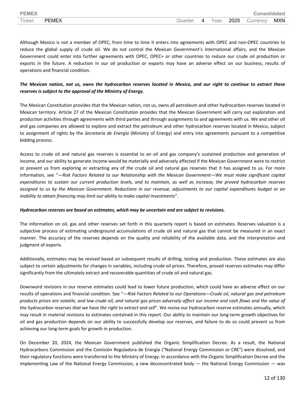 PEMEX Consolidated Ticker: PEMEX Quarter: 4 Year: 2025 Currency: MXN 12 of 130 Although Mexico is not a member of OPEC, from time to time it enters into agreements with OPEC and non-OPEC countries to reduce the global supply of crude oil. We do not control the Mexican Government’s international affairs, and the Mexican Government could enter into further agreements with OPEC, OPEC+ or other countries to reduce our crude oil production or exports in the future. A reduction in our oil production or exports may have an adverse effect on our business, results of operations and financial condition. The Mexican nation, not us, owns the hydrocarbon reserves located in Mexico, and our right to continue to extract these reserves is subject to the approval of the Ministry of Energy. The Mexican Constitution provides that the Mexican nation, not us, owns all petroleum and other hydrocarbon reserves located in Mexican territory. Article 27 of the Mexican Constitution provides that the Mexican Government will carry out exploration and production activities through agreements with third parties and through assignments to and agreements with us. We and other oil and gas companies are allowed to explore and extract the petroleum and other hydrocarbon reserves located in Mexico, subject to assignment of rights by the Secretaría de Energía (Ministry of Energy) and entry into agreements pursuant to a competitive bidding process. Access to crude oil and natural gas reserves is essential to an oil and gas company’s sustained production and generation of income, and our ability to generate income would be materially and adversely affected if the Mexican Government were to restrict or prevent us from exploring or extracting any of the crude oil and natural gas reserves that it has assigned to us. For more information, see “—Risk Factors Related to our Relationship with the Mexican Government—We must make significant capital expenditures to sustain our current production levels, and to maintain, as well as increase, the proved hydrocarbon reserves assigned to us by the Mexican Government. Reductions in our revenue, adjustments to our capital expenditures budget or an inability to obtain financing may limit our ability to make capital investments”. Hydrocarbon reserves are based on estimates, which may be uncertain and are subject to revisions. The information on oil, gas and other reserves set forth in this quarterly report is based on estimates. Reserves valuation is a subjective process of estimating underground accumulations of crude oil and natural gas that cannot be measured in an exact manner. The accuracy of the reserves depends on the quality and reliability of the available data, and the interpretation and judgment of experts. Additionally, estimates may be revised based on subsequent results of drilling, testing and production. These estimates are also subject to certain adjustments for changes in variables, including crude oil prices. Therefore, proved reserves estimates may differ significantly from the ultimately extract and recoverable quantities of crude oil and natural gas. Downward revisions in our reserve estimates could lead to lower future production, which could have an adverse effect on our results of operations and financial condition. See “—Risk Factors Related to our Operations—Crude oil, natural gas and petroleum products prices are volatile, and low crude oil, and natural gas prices adversely affect our income and cash flows and the value of the hydrocarbon reserves that we have the right to extract and sell”. We revise our hydrocarbon reserve estimates annually, which may result in material revisions to estimates contained in this report. Our ability to maintain our long-term growth objectives for oil and gas production depends on our ability to successfully develop our reserves, and failure to do so could prevent us from achieving our long-term goals for growth in production. On December 20, 2024, the Mexican Government published the Organic Simplification Decree. As a result, the National Hydrocarbons Commission and the Comisión Reguladora de Energía (“National Energy Commission or CRE”) were dissolved, and their regulatory functions were transferred to the Ministry of Energy. In accordance with the Organic Simplification Decree and the implementing Law of the National Energy Commission, a new deconcentrated body — the National Energy Commission — was