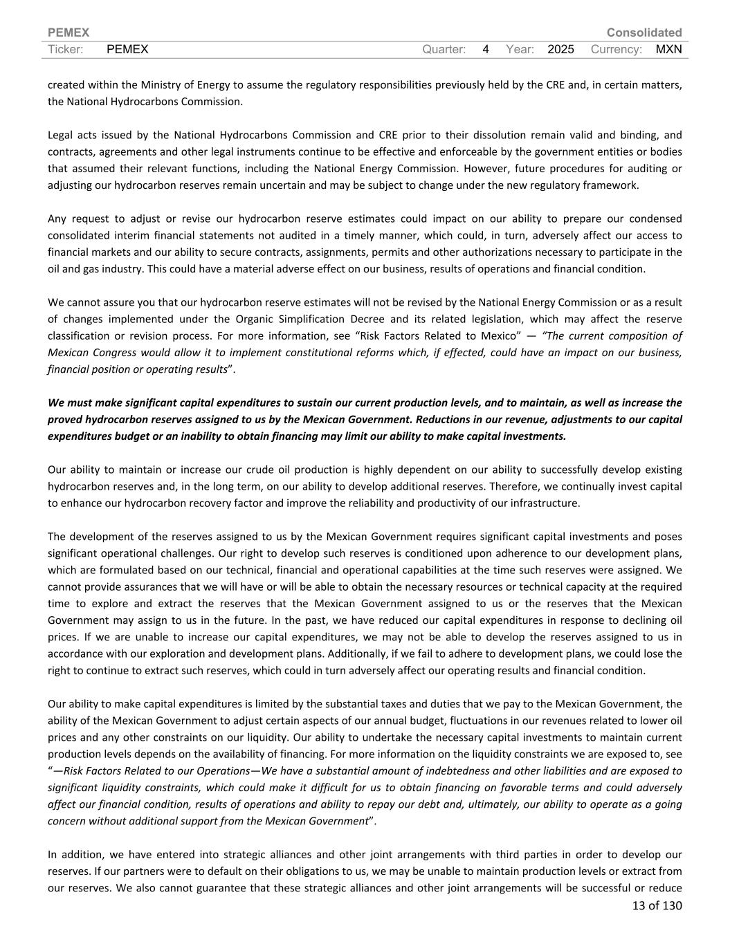 PEMEX Consolidated Ticker: PEMEX Quarter: 4 Year: 2025 Currency: MXN 13 of 130 created within the Ministry of Energy to assume the regulatory responsibilities previously held by the CRE and, in certain matters, the National Hydrocarbons Commission. Legal acts issued by the National Hydrocarbons Commission and CRE prior to their dissolution remain valid and binding, and contracts, agreements and other legal instruments continue to be effective and enforceable by the government entities or bodies that assumed their relevant functions, including the National Energy Commission. However, future procedures for auditing or adjusting our hydrocarbon reserves remain uncertain and may be subject to change under the new regulatory framework. Any request to adjust or revise our hydrocarbon reserve estimates could impact on our ability to prepare our condensed consolidated interim financial statements not audited in a timely manner, which could, in turn, adversely affect our access to financial markets and our ability to secure contracts, assignments, permits and other authorizations necessary to participate in the oil and gas industry. This could have a material adverse effect on our business, results of operations and financial condition. We cannot assure you that our hydrocarbon reserve estimates will not be revised by the National Energy Commission or as a result of changes implemented under the Organic Simplification Decree and its related legislation, which may affect the reserve classification or revision process. For more information, see “Risk Factors Related to Mexico” — “The current composition of Mexican Congress would allow it to implement constitutional reforms which, if effected, could have an impact on our business, financial position or operating results”. We must make significant capital expenditures to sustain our current production levels, and to maintain, as well as increase the proved hydrocarbon reserves assigned to us by the Mexican Government. Reductions in our revenue, adjustments to our capital expenditures budget or an inability to obtain financing may limit our ability to make capital investments. Our ability to maintain or increase our crude oil production is highly dependent on our ability to successfully develop existing hydrocarbon reserves and, in the long term, on our ability to develop additional reserves. Therefore, we continually invest capital to enhance our hydrocarbon recovery factor and improve the reliability and productivity of our infrastructure. The development of the reserves assigned to us by the Mexican Government requires significant capital investments and poses significant operational challenges. Our right to develop such reserves is conditioned upon adherence to our development plans, which are formulated based on our technical, financial and operational capabilities at the time such reserves were assigned. We cannot provide assurances that we will have or will be able to obtain the necessary resources or technical capacity at the required time to explore and extract the reserves that the Mexican Government assigned to us or the reserves that the Mexican Government may assign to us in the future. In the past, we have reduced our capital expenditures in response to declining oil prices. If we are unable to increase our capital expenditures, we may not be able to develop the reserves assigned to us in accordance with our exploration and development plans. Additionally, if we fail to adhere to development plans, we could lose the right to continue to extract such reserves, which could in turn adversely affect our operating results and financial condition. Our ability to make capital expenditures is limited by the substantial taxes and duties that we pay to the Mexican Government, the ability of the Mexican Government to adjust certain aspects of our annual budget, fluctuations in our revenues related to lower oil prices and any other constraints on our liquidity. Our ability to undertake the necessary capital investments to maintain current production levels depends on the availability of financing. For more information on the liquidity constraints we are exposed to, see “—Risk Factors Related to our Operations—We have a substantial amount of indebtedness and other liabilities and are exposed to significant liquidity constraints, which could make it difficult for us to obtain financing on favorable terms and could adversely affect our financial condition, results of operations and ability to repay our debt and, ultimately, our ability to operate as a going concern without additional support from the Mexican Government”. In addition, we have entered into strategic alliances and other joint arrangements with third parties in order to develop our reserves. If our partners were to default on their obligations to us, we may be unable to maintain production levels or extract from our reserves. We also cannot guarantee that these strategic alliances and other joint arrangements will be successful or reduce