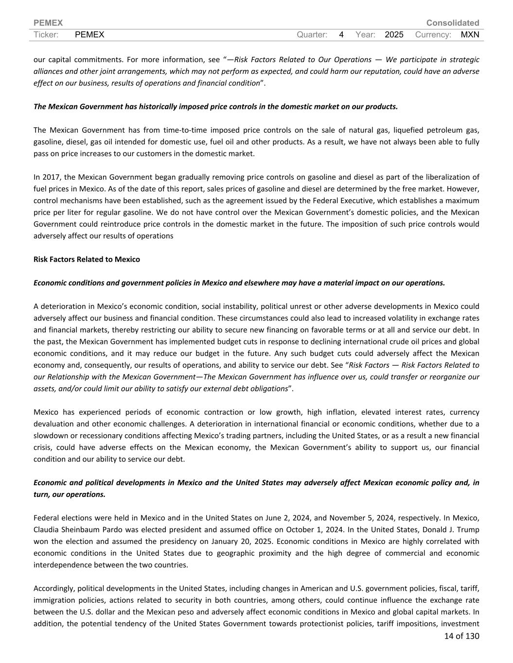 PEMEX Consolidated Ticker: PEMEX Quarter: 4 Year: 2025 Currency: MXN 14 of 130 our capital commitments. For more information, see “—Risk Factors Related to Our Operations — We participate in strategic alliances and other joint arrangements, which may not perform as expected, and could harm our reputation, could have an adverse effect on our business, results of operations and financial condition”. The Mexican Government has historically imposed price controls in the domestic market on our products. The Mexican Government has from time-to-time imposed price controls on the sale of natural gas, liquefied petroleum gas, gasoline, diesel, gas oil intended for domestic use, fuel oil and other products. As a result, we have not always been able to fully pass on price increases to our customers in the domestic market. In 2017, the Mexican Government began gradually removing price controls on gasoline and diesel as part of the liberalization of fuel prices in Mexico. As of the date of this report, sales prices of gasoline and diesel are determined by the free market. However, control mechanisms have been established, such as the agreement issued by the Federal Executive, which establishes a maximum price per liter for regular gasoline. We do not have control over the Mexican Government’s domestic policies, and the Mexican Government could reintroduce price controls in the domestic market in the future. The imposition of such price controls would adversely affect our results of operations Risk Factors Related to Mexico Economic conditions and government policies in Mexico and elsewhere may have a material impact on our operations. A deterioration in Mexico’s economic condition, social instability, political unrest or other adverse developments in Mexico could adversely affect our business and financial condition. These circumstances could also lead to increased volatility in exchange rates and financial markets, thereby restricting our ability to secure new financing on favorable terms or at all and service our debt. In the past, the Mexican Government has implemented budget cuts in response to declining international crude oil prices and global economic conditions, and it may reduce our budget in the future. Any such budget cuts could adversely affect the Mexican economy and, consequently, our results of operations, and ability to service our debt. See “Risk Factors — Risk Factors Related to our Relationship with the Mexican Government—The Mexican Government has influence over us, could transfer or reorganize our assets, and/or could limit our ability to satisfy our external debt obligations”. Mexico has experienced periods of economic contraction or low growth, high inflation, elevated interest rates, currency devaluation and other economic challenges. A deterioration in international financial or economic conditions, whether due to a slowdown or recessionary conditions affecting Mexico’s trading partners, including the United States, or as a result a new financial crisis, could have adverse effects on the Mexican economy, the Mexican Government’s ability to support us, our financial condition and our ability to service our debt. Economic and political developments in Mexico and the United States may adversely affect Mexican economic policy and, in turn, our operations. Federal elections were held in Mexico and in the United States on June 2, 2024, and November 5, 2024, respectively. In Mexico, Claudia Sheinbaum Pardo was elected president and assumed office on October 1, 2024. In the United States, Donald J. Trump won the election and assumed the presidency on January 20, 2025. Economic conditions in Mexico are highly correlated with economic conditions in the United States due to geographic proximity and the high degree of commercial and economic interdependence between the two countries. Accordingly, political developments in the United States, including changes in American and U.S. government policies, fiscal, tariff, immigration policies, actions related to security in both countries, among others, could continue influence the exchange rate between the U.S. dollar and the Mexican peso and adversely affect economic conditions in Mexico and global capital markets. In addition, the potential tendency of the United States Government towards protectionist policies, tariff impositions, investment