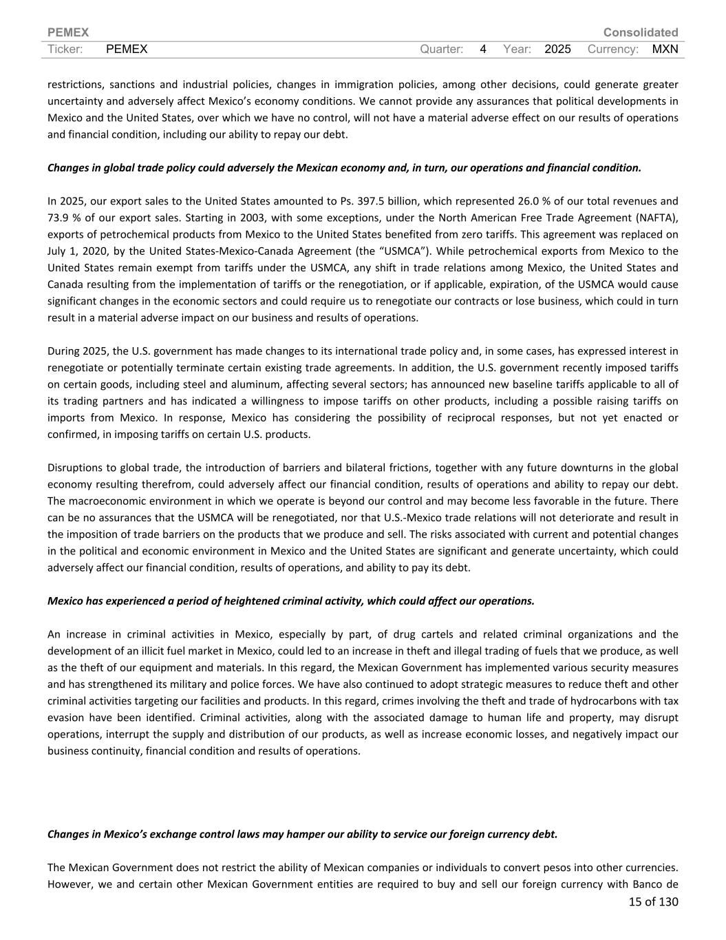 PEMEX Consolidated Ticker: PEMEX Quarter: 4 Year: 2025 Currency: MXN 15 of 130 restrictions, sanctions and industrial policies, changes in immigration policies, among other decisions, could generate greater uncertainty and adversely affect Mexico’s economy conditions. We cannot provide any assurances that political developments in Mexico and the United States, over which we have no control, will not have a material adverse effect on our results of operations and financial condition, including our ability to repay our debt. Changes in global trade policy could adversely the Mexican economy and, in turn, our operations and financial condition. In 2025, our export sales to the United States amounted to Ps. 397.5 billion, which represented 26.0 % of our total revenues and 73.9 % of our export sales. Starting in 2003, with some exceptions, under the North American Free Trade Agreement (NAFTA), exports of petrochemical products from Mexico to the United States benefited from zero tariffs. This agreement was replaced on July 1, 2020, by the United States-Mexico-Canada Agreement (the “USMCA”). While petrochemical exports from Mexico to the United States remain exempt from tariffs under the USMCA, any shift in trade relations among Mexico, the United States and Canada resulting from the implementation of tariffs or the renegotiation, or if applicable, expiration, of the USMCA would cause significant changes in the economic sectors and could require us to renegotiate our contracts or lose business, which could in turn result in a material adverse impact on our business and results of operations. During 2025, the U.S. government has made changes to its international trade policy and, in some cases, has expressed interest in renegotiate or potentially terminate certain existing trade agreements. In addition, the U.S. government recently imposed tariffs on certain goods, including steel and aluminum, affecting several sectors; has announced new baseline tariffs applicable to all of its trading partners and has indicated a willingness to impose tariffs on other products, including a possible raising tariffs on imports from Mexico. In response, Mexico has considering the possibility of reciprocal responses, but not yet enacted or confirmed, in imposing tariffs on certain U.S. products. Disruptions to global trade, the introduction of barriers and bilateral frictions, together with any future downturns in the global economy resulting therefrom, could adversely affect our financial condition, results of operations and ability to repay our debt. The macroeconomic environment in which we operate is beyond our control and may become less favorable in the future. There can be no assurances that the USMCA will be renegotiated, nor that U.S.-Mexico trade relations will not deteriorate and result in the imposition of trade barriers on the products that we produce and sell. The risks associated with current and potential changes in the political and economic environment in Mexico and the United States are significant and generate uncertainty, which could adversely affect our financial condition, results of operations, and ability to pay its debt. Mexico has experienced a period of heightened criminal activity, which could affect our operations. An increase in criminal activities in Mexico, especially by part, of drug cartels and related criminal organizations and the development of an illicit fuel market in Mexico, could led to an increase in theft and illegal trading of fuels that we produce, as well as the theft of our equipment and materials. In this regard, the Mexican Government has implemented various security measures and has strengthened its military and police forces. We have also continued to adopt strategic measures to reduce theft and other criminal activities targeting our facilities and products. In this regard, crimes involving the theft and trade of hydrocarbons with tax evasion have been identified. Criminal activities, along with the associated damage to human life and property, may disrupt operations, interrupt the supply and distribution of our products, as well as increase economic losses, and negatively impact our business continuity, financial condition and results of operations. Changes in Mexico’s exchange control laws may hamper our ability to service our foreign currency debt. The Mexican Government does not restrict the ability of Mexican companies or individuals to convert pesos into other currencies. However, we and certain other Mexican Government entities are required to buy and sell our foreign currency with Banco de