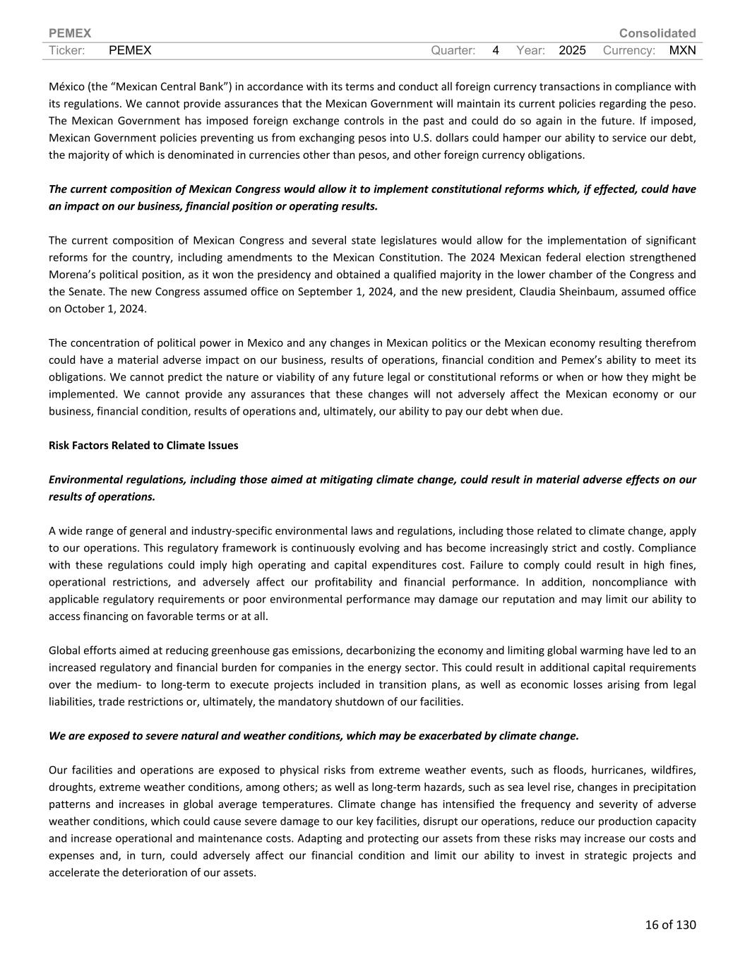 PEMEX Consolidated Ticker: PEMEX Quarter: 4 Year: 2025 Currency: MXN 16 of 130 México (the “Mexican Central Bank”) in accordance with its terms and conduct all foreign currency transactions in compliance with its regulations. We cannot provide assurances that the Mexican Government will maintain its current policies regarding the peso. The Mexican Government has imposed foreign exchange controls in the past and could do so again in the future. If imposed, Mexican Government policies preventing us from exchanging pesos into U.S. dollars could hamper our ability to service our debt, the majority of which is denominated in currencies other than pesos, and other foreign currency obligations. The current composition of Mexican Congress would allow it to implement constitutional reforms which, if effected, could have an impact on our business, financial position or operating results. The current composition of Mexican Congress and several state legislatures would allow for the implementation of significant reforms for the country, including amendments to the Mexican Constitution. The 2024 Mexican federal election strengthened Morena’s political position, as it won the presidency and obtained a qualified majority in the lower chamber of the Congress and the Senate. The new Congress assumed office on September 1, 2024, and the new president, Claudia Sheinbaum, assumed office on October 1, 2024. The concentration of political power in Mexico and any changes in Mexican politics or the Mexican economy resulting therefrom could have a material adverse impact on our business, results of operations, financial condition and Pemex’s ability to meet its obligations. We cannot predict the nature or viability of any future legal or constitutional reforms or when or how they might be implemented. We cannot provide any assurances that these changes will not adversely affect the Mexican economy or our business, financial condition, results of operations and, ultimately, our ability to pay our debt when due. Risk Factors Related to Climate Issues Environmental regulations, including those aimed at mitigating climate change, could result in material adverse effects on our results of operations. A wide range of general and industry-specific environmental laws and regulations, including those related to climate change, apply to our operations. This regulatory framework is continuously evolving and has become increasingly strict and costly. Compliance with these regulations could imply high operating and capital expenditures cost. Failure to comply could result in high fines, operational restrictions, and adversely affect our profitability and financial performance. In addition, noncompliance with applicable regulatory requirements or poor environmental performance may damage our reputation and may limit our ability to access financing on favorable terms or at all. Global efforts aimed at reducing greenhouse gas emissions, decarbonizing the economy and limiting global warming have led to an increased regulatory and financial burden for companies in the energy sector. This could result in additional capital requirements over the medium- to long-term to execute projects included in transition plans, as well as economic losses arising from legal liabilities, trade restrictions or, ultimately, the mandatory shutdown of our facilities. We are exposed to severe natural and weather conditions, which may be exacerbated by climate change. Our facilities and operations are exposed to physical risks from extreme weather events, such as floods, hurricanes, wildfires, droughts, extreme weather conditions, among others; as well as long-term hazards, such as sea level rise, changes in precipitation patterns and increases in global average temperatures. Climate change has intensified the frequency and severity of adverse weather conditions, which could cause severe damage to our key facilities, disrupt our operations, reduce our production capacity and increase operational and maintenance costs. Adapting and protecting our assets from these risks may increase our costs and expenses and, in turn, could adversely affect our financial condition and limit our ability to invest in strategic projects and accelerate the deterioration of our assets.