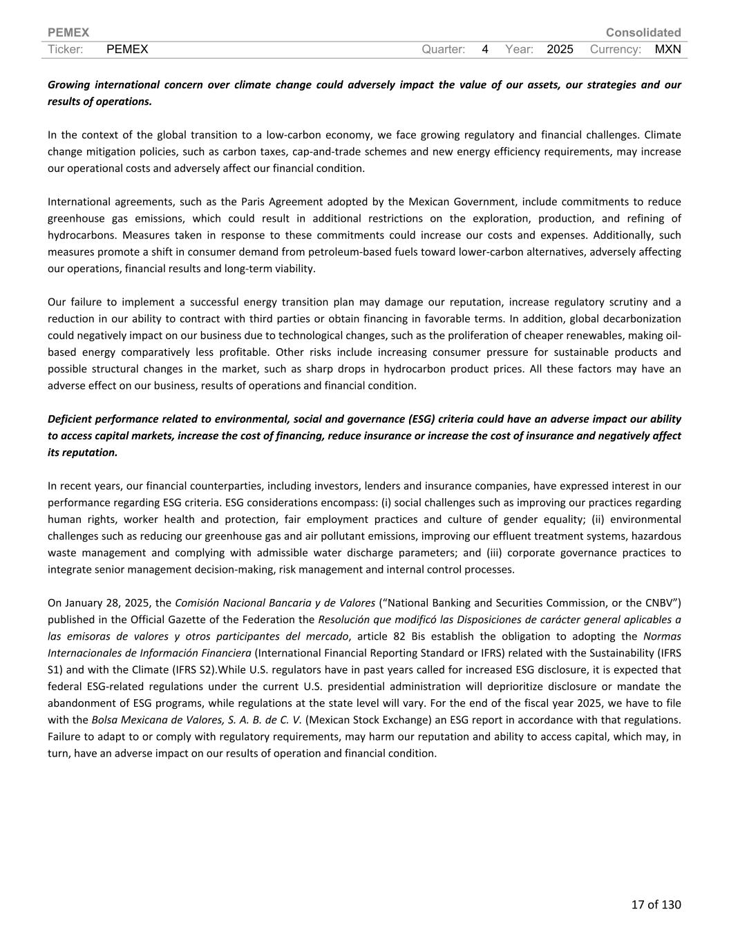 PEMEX Consolidated Ticker: PEMEX Quarter: 4 Year: 2025 Currency: MXN 17 of 130 Growing international concern over climate change could adversely impact the value of our assets, our strategies and our results of operations. In the context of the global transition to a low-carbon economy, we face growing regulatory and financial challenges. Climate change mitigation policies, such as carbon taxes, cap-and-trade schemes and new energy efficiency requirements, may increase our operational costs and adversely affect our financial condition. International agreements, such as the Paris Agreement adopted by the Mexican Government, include commitments to reduce greenhouse gas emissions, which could result in additional restrictions on the exploration, production, and refining of hydrocarbons. Measures taken in response to these commitments could increase our costs and expenses. Additionally, such measures promote a shift in consumer demand from petroleum-based fuels toward lower-carbon alternatives, adversely affecting our operations, financial results and long-term viability. Our failure to implement a successful energy transition plan may damage our reputation, increase regulatory scrutiny and a reduction in our ability to contract with third parties or obtain financing in favorable terms. In addition, global decarbonization could negatively impact on our business due to technological changes, such as the proliferation of cheaper renewables, making oil- based energy comparatively less profitable. Other risks include increasing consumer pressure for sustainable products and possible structural changes in the market, such as sharp drops in hydrocarbon product prices. All these factors may have an adverse effect on our business, results of operations and financial condition. Deficient performance related to environmental, social and governance (ESG) criteria could have an adverse impact our ability to access capital markets, increase the cost of financing, reduce insurance or increase the cost of insurance and negatively affect its reputation. In recent years, our financial counterparties, including investors, lenders and insurance companies, have expressed interest in our performance regarding ESG criteria. ESG considerations encompass: (i) social challenges such as improving our practices regarding human rights, worker health and protection, fair employment practices and culture of gender equality; (ii) environmental challenges such as reducing our greenhouse gas and air pollutant emissions, improving our effluent treatment systems, hazardous waste management and complying with admissible water discharge parameters; and (iii) corporate governance practices to integrate senior management decision-making, risk management and internal control processes. On January 28, 2025, the Comisión Nacional Bancaria y de Valores (“National Banking and Securities Commission, or the CNBV”) published in the Official Gazette of the Federation the Resolución que modificó las Disposiciones de carácter general aplicables a las emisoras de valores y otros participantes del mercado, article 82 Bis establish the obligation to adopting the Normas Internacionales de Información Financiera (International Financial Reporting Standard or IFRS) related with the Sustainability (IFRS S1) and with the Climate (IFRS S2).While U.S. regulators have in past years called for increased ESG disclosure, it is expected that federal ESG-related regulations under the current U.S. presidential administration will deprioritize disclosure or mandate the abandonment of ESG programs, while regulations at the state level will vary. For the end of the fiscal year 2025, we have to file with the Bolsa Mexicana de Valores, S. A. B. de C. V. (Mexican Stock Exchange) an ESG report in accordance with that regulations. Failure to adapt to or comply with regulatory requirements, may harm our reputation and ability to access capital, which may, in turn, have an adverse impact on our results of operation and financial condition.