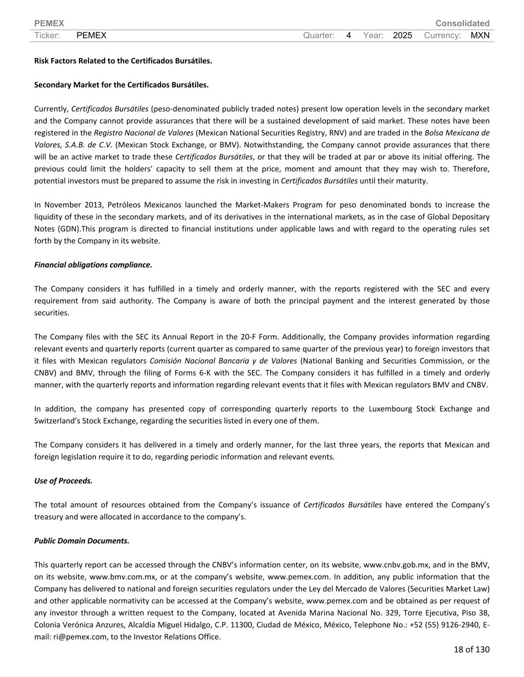 PEMEX Consolidated Ticker: PEMEX Quarter: 4 Year: 2025 Currency: MXN 18 of 130 Risk Factors Related to the Certificados Bursátiles. Secondary Market for the Certificados Bursátiles. Currently, Certificados Bursátiles (peso-denominated publicly traded notes) present low operation levels in the secondary market and the Company cannot provide assurances that there will be a sustained development of said market. These notes have been registered in the Registro Nacional de Valores (Mexican National Securities Registry, RNV) and are traded in the Bolsa Mexicana de Valores, S.A.B. de C.V. (Mexican Stock Exchange, or BMV). Notwithstanding, the Company cannot provide assurances that there will be an active market to trade these Certificados Bursátiles, or that they will be traded at par or above its initial offering. The previous could limit the holders’ capacity to sell them at the price, moment and amount that they may wish to. Therefore, potential investors must be prepared to assume the risk in investing in Certificados Bursátiles until their maturity. In November 2013, Petróleos Mexicanos launched the Market-Makers Program for peso denominated bonds to increase the liquidity of these in the secondary markets, and of its derivatives in the international markets, as in the case of Global Depositary Notes (GDN).This program is directed to financial institutions under applicable laws and with regard to the operating rules set forth by the Company in its website. Financial obligations compliance. The Company considers it has fulfilled in a timely and orderly manner, with the reports registered with the SEC and every requirement from said authority. The Company is aware of both the principal payment and the interest generated by those securities. The Company files with the SEC its Annual Report in the 20-F Form. Additionally, the Company provides information regarding relevant events and quarterly reports (current quarter as compared to same quarter of the previous year) to foreign investors that it files with Mexican regulators Comisión Nacional Bancaria y de Valores (National Banking and Securities Commission, or the CNBV) and BMV, through the filing of Forms 6-K with the SEC. The Company considers it has fulfilled in a timely and orderly manner, with the quarterly reports and information regarding relevant events that it files with Mexican regulators BMV and CNBV. In addition, the company has presented copy of corresponding quarterly reports to the Luxembourg Stock Exchange and Switzerland’s Stock Exchange, regarding the securities listed in every one of them. The Company considers it has delivered in a timely and orderly manner, for the last three years, the reports that Mexican and foreign legislation require it to do, regarding periodic information and relevant events. Use of Proceeds. The total amount of resources obtained from the Company’s issuance of Certificados Bursátiles have entered the Company’s treasury and were allocated in accordance to the company’s. Public Domain Documents. This quarterly report can be accessed through the CNBV’s information center, on its website, www.cnbv.gob.mx, and in the BMV, on its website, www.bmv.com.mx, or at the company’s website, www.pemex.com. In addition, any public information that the Company has delivered to national and foreign securities regulators under the Ley del Mercado de Valores (Securities Market Law) and other applicable normativity can be accessed at the Company’s website, www.pemex.com and be obtained as per request of any investor through a written request to the Company, located at Avenida Marina Nacional No. 329, Torre Ejecutiva, Piso 38, Colonia Verónica Anzures, Alcaldía Miguel Hidalgo, C.P. 11300, Ciudad de México, México, Telephone No.: +52 (55) 9126-2940, E- mail: ri@pemex.com, to the Investor Relations Office.