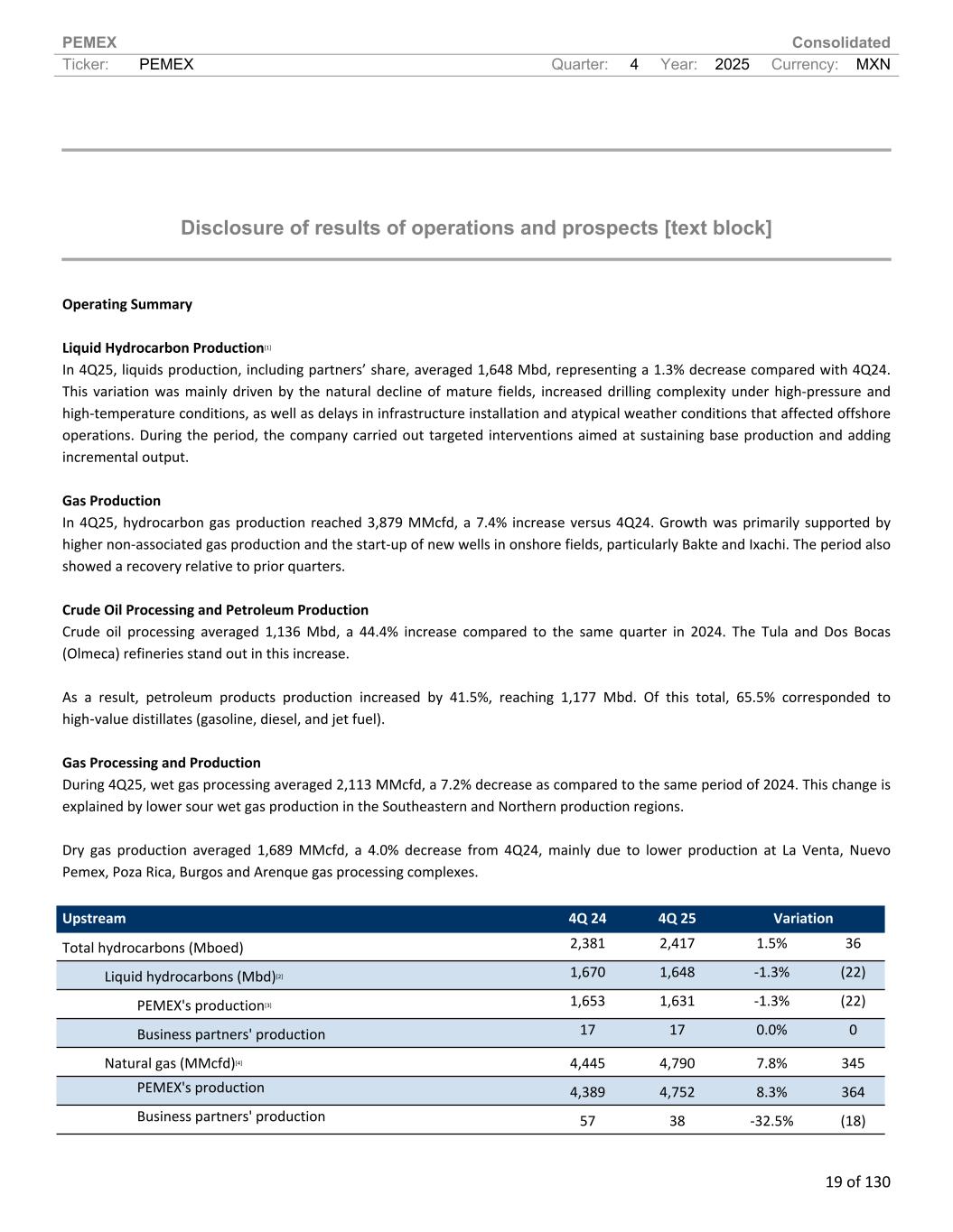 PEMEX Consolidated Ticker: PEMEX Quarter: 4 Year: 2025 Currency: MXN 19 of 130 Disclosure of results of operations and prospects [text block] Operating Summary Liquid Hydrocarbon Production[1] In 4Q25, liquids production, including partners’ share, averaged 1,648 Mbd, representing a 1.3% decrease compared with 4Q24. This variation was mainly driven by the natural decline of mature fields, increased drilling complexity under high-pressure and high-temperature conditions, as well as delays in infrastructure installation and atypical weather conditions that affected offshore operations. During the period, the company carried out targeted interventions aimed at sustaining base production and adding incremental output. Gas Production In 4Q25, hydrocarbon gas production reached 3,879 MMcfd, a 7.4% increase versus 4Q24. Growth was primarily supported by higher non-associated gas production and the start-up of new wells in onshore fields, particularly Bakte and Ixachi. The period also showed a recovery relative to prior quarters. Crude Oil Processing and Petroleum Production Crude oil processing averaged 1,136 Mbd, a 44.4% increase compared to the same quarter in 2024. The Tula and Dos Bocas (Olmeca) refineries stand out in this increase. As a result, petroleum products production increased by 41.5%, reaching 1,177 Mbd. Of this total, 65.5% corresponded to high-value distillates (gasoline, diesel, and jet fuel). Gas Processing and Production During 4Q25, wet gas processing averaged 2,113 MMcfd, a 7.2% decrease as compared to the same period of 2024. This change is explained by lower sour wet gas production in the Southeastern and Northern production regions. Dry gas production averaged 1,689 MMcfd, a 4.0% decrease from 4Q24, mainly due to lower production at La Venta, Nuevo Pemex, Poza Rica, Burgos and Arenque gas processing complexes. Upstream 4Q 24 4Q 25 Variation Total hydrocarbons (Mboed) 2,381 2,417 1.5% 36 Liquid hydrocarbons (Mbd)[2] 1,670 1,648 -1.3% (22) PEMEX's production[3] 1,653 1,631 -1.3% (22) Business partners' production 17 17 0.0% 0 Natural gas (MMcfd)[4] 4,445 4,790 7.8% 345 PEMEX's production 4,389 4,752 8.3% 364 Business partners' production 57 38 -32.5% (18)