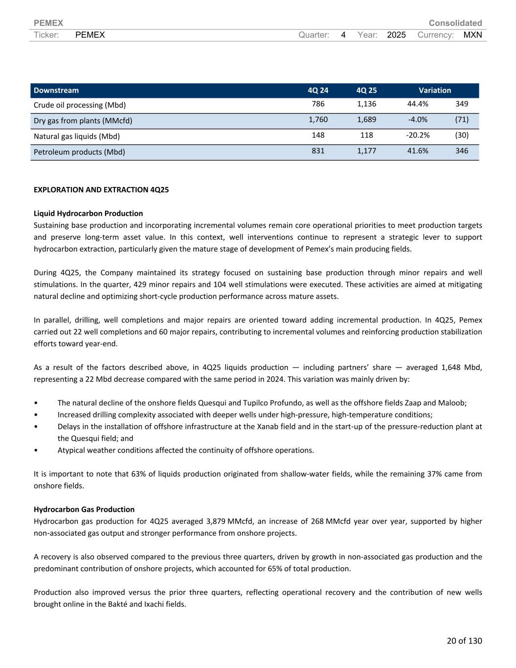 PEMEX Consolidated Ticker: PEMEX Quarter: 4 Year: 2025 Currency: MXN 20 of 130 EXPLORATION AND EXTRACTION 4Q25 Liquid Hydrocarbon Production Sustaining base production and incorporating incremental volumes remain core operational priorities to meet production targets and preserve long-term asset value. In this context, well interventions continue to represent a strategic lever to support hydrocarbon extraction, particularly given the mature stage of development of Pemex’s main producing fields. During 4Q25, the Company maintained its strategy focused on sustaining base production through minor repairs and well stimulations. In the quarter, 429 minor repairs and 104 well stimulations were executed. These activities are aimed at mitigating natural decline and optimizing short-cycle production performance across mature assets. In parallel, drilling, well completions and major repairs are oriented toward adding incremental production. In 4Q25, Pemex carried out 22 well completions and 60 major repairs, contributing to incremental volumes and reinforcing production stabilization efforts toward year-end. As a result of the factors described above, in 4Q25 liquids production — including partners’ share — averaged 1,648 Mbd, representing a 22 Mbd decrease compared with the same period in 2024. This variation was mainly driven by: • The natural decline of the onshore fields Quesqui and Tupilco Profundo, as well as the offshore fields Zaap and Maloob; • Increased drilling complexity associated with deeper wells under high-pressure, high-temperature conditions; • Delays in the installation of offshore infrastructure at the Xanab field and in the start-up of the pressure-reduction plant at the Quesqui field; and • Atypical weather conditions affected the continuity of offshore operations. It is important to note that 63% of liquids production originated from shallow-water fields, while the remaining 37% came from onshore fields. Hydrocarbon Gas Production Hydrocarbon gas production for 4Q25 averaged 3,879 MMcfd, an increase of 268 MMcfd year over year, supported by higher non-associated gas output and stronger performance from onshore projects. A recovery is also observed compared to the previous three quarters, driven by growth in non-associated gas production and the predominant contribution of onshore projects, which accounted for 65% of total production. Production also improved versus the prior three quarters, reflecting operational recovery and the contribution of new wells brought online in the Bakté and Ixachi fields. Downstream 4Q 24 4Q 25 Variation Crude oil processing (Mbd) 786 1,136 44.4% 349 Dry gas from plants (MMcfd) 1,760 1,689 -4.0% (71) Natural gas liquids (Mbd) 148 118 -20.2% (30) Petroleum products (Mbd) 831 1,177 41.6% 346