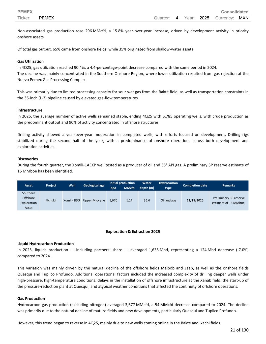 PEMEX Consolidated Ticker: PEMEX Quarter: 4 Year: 2025 Currency: MXN 21 of 130 Non-associated gas production rose 296 MMcfd, a 15.8% year-over-year increase, driven by development activity in priority onshore assets. Of total gas output, 65% came from onshore fields, while 35% originated from shallow-water assets Gas Utilization In 4Q25, gas utilization reached 90.4%, a 4.4-percentage-point decrease compared with the same period in 2024. The decline was mainly concentrated in the Southern Onshore Region, where lower utilization resulted from gas rejection at the Nuevo Pemex Gas Processing Complex. This was primarily due to limited processing capacity for sour wet gas from the Bakté field, as well as transportation constraints in the 36-inch (L-3) pipeline caused by elevated gas-flow temperatures. Infrastructure In 2025, the average number of active wells remained stable, ending 4Q25 with 5,785 operating wells, with crude production as the predominant output and 90% of activity concentrated in offshore structures. Drilling activity showed a year-over-year moderation in completed wells, with efforts focused on development. Drilling rigs stabilized during the second half of the year, with a predominance of onshore operations across both development and exploration activities. Discoveries During the fourth quarter, the Xomili-1AEXP well tested as a producer of oil and 35° API gas. A preliminary 3P reserve estimate of 16 MMboe has been identified. Initial production Asset Project Well Geological age bpd MMcfd Water depth (m) Hydrocarbon type Completion date Remarks Southern Offshore Exploration Asset Uchukil Xomili-1EXP Upper Miocene 1,670 1.17 35.6 Oil and gas 11/18/2025 Preliminary 3P reserve estimate of 16 MMboe. Exploration & Extraction 2025 Liquid Hydrocarbon Production In 2025, liquids production — including partners’ share — averaged 1,635 Mbd, representing a 124 Mbd decrease (-7.0%) compared to 2024. This variation was mainly driven by the natural decline of the offshore fields Maloob and Zaap, as well as the onshore fields Quesqui and Tupilco Profundo. Additional operational factors included the increased complexity of drilling deeper wells under high-pressure, high-temperature conditions; delays in the installation of offshore infrastructure at the Xanab field; the start-up of the pressure-reduction plant at Quesqui; and atypical weather conditions that affected the continuity of offshore operations. Gas Production Hydrocarbon gas production (excluding nitrogen) averaged 3,677 MMcfd, a 54 MMcfd decrease compared to 2024. The decline was primarily due to the natural decline of mature fields and new developments, particularly Quesqui and Tupilco Profundo. However, this trend began to reverse in 4Q25, mainly due to new wells coming online in the Bakté and Ixachi fields.