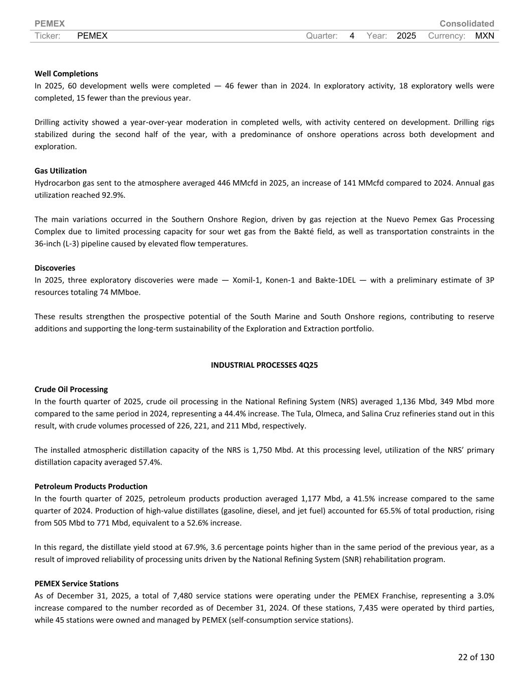 PEMEX Consolidated Ticker: PEMEX Quarter: 4 Year: 2025 Currency: MXN 22 of 130 Well Completions In 2025, 60 development wells were completed — 46 fewer than in 2024. In exploratory activity, 18 exploratory wells were completed, 15 fewer than the previous year. Drilling activity showed a year-over-year moderation in completed wells, with activity centered on development. Drilling rigs stabilized during the second half of the year, with a predominance of onshore operations across both development and exploration. Gas Utilization Hydrocarbon gas sent to the atmosphere averaged 446 MMcfd in 2025, an increase of 141 MMcfd compared to 2024. Annual gas utilization reached 92.9%. The main variations occurred in the Southern Onshore Region, driven by gas rejection at the Nuevo Pemex Gas Processing Complex due to limited processing capacity for sour wet gas from the Bakté field, as well as transportation constraints in the 36-inch (L-3) pipeline caused by elevated flow temperatures. Discoveries In 2025, three exploratory discoveries were made — Xomil-1, Konen-1 and Bakte-1DEL — with a preliminary estimate of 3P resources totaling 74 MMboe. These results strengthen the prospective potential of the South Marine and South Onshore regions, contributing to reserve additions and supporting the long-term sustainability of the Exploration and Extraction portfolio. INDUSTRIAL PROCESSES 4Q25 Crude Oil Processing In the fourth quarter of 2025, crude oil processing in the National Refining System (NRS) averaged 1,136 Mbd, 349 Mbd more compared to the same period in 2024, representing a 44.4% increase. The Tula, Olmeca, and Salina Cruz refineries stand out in this result, with crude volumes processed of 226, 221, and 211 Mbd, respectively. The installed atmospheric distillation capacity of the NRS is 1,750 Mbd. At this processing level, utilization of the NRS’ primary distillation capacity averaged 57.4%. Petroleum Products Production In the fourth quarter of 2025, petroleum products production averaged 1,177 Mbd, a 41.5% increase compared to the same quarter of 2024. Production of high-value distillates (gasoline, diesel, and jet fuel) accounted for 65.5% of total production, rising from 505 Mbd to 771 Mbd, equivalent to a 52.6% increase. In this regard, the distillate yield stood at 67.9%, 3.6 percentage points higher than in the same period of the previous year, as a result of improved reliability of processing units driven by the National Refining System (SNR) rehabilitation program. PEMEX Service Stations As of December 31, 2025, a total of 7,480 service stations were operating under the PEMEX Franchise, representing a 3.0% increase compared to the number recorded as of December 31, 2024. Of these stations, 7,435 were operated by third parties, while 45 stations were owned and managed by PEMEX (self-consumption service stations).