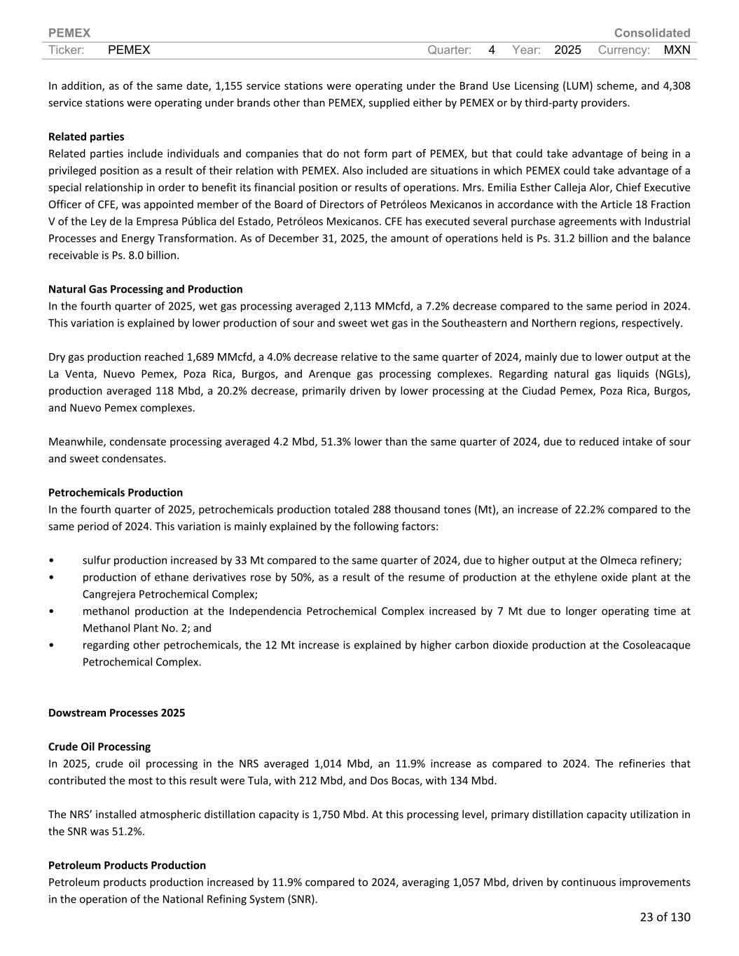 PEMEX Consolidated Ticker: PEMEX Quarter: 4 Year: 2025 Currency: MXN 23 of 130 In addition, as of the same date, 1,155 service stations were operating under the Brand Use Licensing (LUM) scheme, and 4,308 service stations were operating under brands other than PEMEX, supplied either by PEMEX or by third-party providers. Related parties Related parties include individuals and companies that do not form part of PEMEX, but that could take advantage of being in a privileged position as a result of their relation with PEMEX. Also included are situations in which PEMEX could take advantage of a special relationship in order to benefit its financial position or results of operations. Mrs. Emilia Esther Calleja Alor, Chief Executive Officer of CFE, was appointed member of the Board of Directors of Petróleos Mexicanos in accordance with the Article 18 Fraction V of the Ley de la Empresa Pública del Estado, Petróleos Mexicanos. CFE has executed several purchase agreements with Industrial Processes and Energy Transformation. As of December 31, 2025, the amount of operations held is Ps. 31.2 billion and the balance receivable is Ps. 8.0 billion. Natural Gas Processing and Production In the fourth quarter of 2025, wet gas processing averaged 2,113 MMcfd, a 7.2% decrease compared to the same period in 2024. This variation is explained by lower production of sour and sweet wet gas in the Southeastern and Northern regions, respectively. Dry gas production reached 1,689 MMcfd, a 4.0% decrease relative to the same quarter of 2024, mainly due to lower output at the La Venta, Nuevo Pemex, Poza Rica, Burgos, and Arenque gas processing complexes. Regarding natural gas liquids (NGLs), production averaged 118 Mbd, a 20.2% decrease, primarily driven by lower processing at the Ciudad Pemex, Poza Rica, Burgos, and Nuevo Pemex complexes. Meanwhile, condensate processing averaged 4.2 Mbd, 51.3% lower than the same quarter of 2024, due to reduced intake of sour and sweet condensates. Petrochemicals Production In the fourth quarter of 2025, petrochemicals production totaled 288 thousand tones (Mt), an increase of 22.2% compared to the same period of 2024. This variation is mainly explained by the following factors: • sulfur production increased by 33 Mt compared to the same quarter of 2024, due to higher output at the Olmeca refinery; • production of ethane derivatives rose by 50%, as a result of the resume of production at the ethylene oxide plant at the Cangrejera Petrochemical Complex; • methanol production at the Independencia Petrochemical Complex increased by 7 Mt due to longer operating time at Methanol Plant No. 2; and • regarding other petrochemicals, the 12 Mt increase is explained by higher carbon dioxide production at the Cosoleacaque Petrochemical Complex. Dowstream Processes 2025 Crude Oil Processing In 2025, crude oil processing in the NRS averaged 1,014 Mbd, an 11.9% increase as compared to 2024. The refineries that contributed the most to this result were Tula, with 212 Mbd, and Dos Bocas, with 134 Mbd. The NRS’ installed atmospheric distillation capacity is 1,750 Mbd. At this processing level, primary distillation capacity utilization in the SNR was 51.2%. Petroleum Products Production Petroleum products production increased by 11.9% compared to 2024, averaging 1,057 Mbd, driven by continuous improvements in the operation of the National Refining System (SNR).