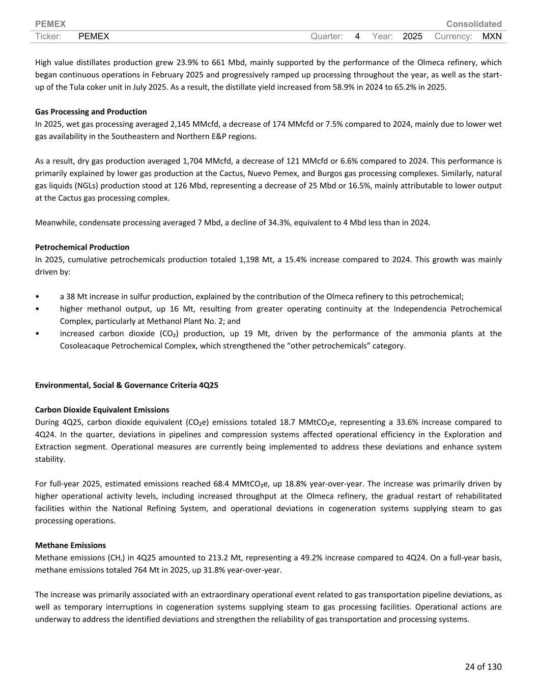 PEMEX Consolidated Ticker: PEMEX Quarter: 4 Year: 2025 Currency: MXN 24 of 130 High value distillates production grew 23.9% to 661 Mbd, mainly supported by the performance of the Olmeca refinery, which began continuous operations in February 2025 and progressively ramped up processing throughout the year, as well as the start- up of the Tula coker unit in July 2025. As a result, the distillate yield increased from 58.9% in 2024 to 65.2% in 2025. Gas Processing and Production In 2025, wet gas processing averaged 2,145 MMcfd, a decrease of 174 MMcfd or 7.5% compared to 2024, mainly due to lower wet gas availability in the Southeastern and Northern E&P regions. As a result, dry gas production averaged 1,704 MMcfd, a decrease of 121 MMcfd or 6.6% compared to 2024. This performance is primarily explained by lower gas production at the Cactus, Nuevo Pemex, and Burgos gas processing complexes. Similarly, natural gas liquids (NGLs) production stood at 126 Mbd, representing a decrease of 25 Mbd or 16.5%, mainly attributable to lower output at the Cactus gas processing complex. Meanwhile, condensate processing averaged 7 Mbd, a decline of 34.3%, equivalent to 4 Mbd less than in 2024. Petrochemical Production In 2025, cumulative petrochemicals production totaled 1,198 Mt, a 15.4% increase compared to 2024. This growth was mainly driven by: • a 38 Mt increase in sulfur production, explained by the contribution of the Olmeca refinery to this petrochemical; • higher methanol output, up 16 Mt, resulting from greater operating continuity at the Independencia Petrochemical Complex, particularly at Methanol Plant No. 2; and • increased carbon dioxide (CO₂) production, up 19 Mt, driven by the performance of the ammonia plants at the Cosoleacaque Petrochemical Complex, which strengthened the “other petrochemicals” category. Environmental, Social & Governance Criteria 4Q25 Carbon Dioxide Equivalent Emissions During 4Q25, carbon dioxide equivalent (CO₂e) emissions totaled 18.7 MMtCO₂e, representing a 33.6% increase compared to 4Q24. In the quarter, deviations in pipelines and compression systems affected operational efficiency in the Exploration and Extraction segment. Operational measures are currently being implemented to address these deviations and enhance system stability. For full-year 2025, estimated emissions reached 68.4 MMtCO₂e, up 18.8% year-over-year. The increase was primarily driven by higher operational activity levels, including increased throughput at the Olmeca refinery, the gradual restart of rehabilitated facilities within the National Refining System, and operational deviations in cogeneration systems supplying steam to gas processing operations. Methane Emissions Methane emissions (CH4) in 4Q25 amounted to 213.2 Mt, representing a 49.2% increase compared to 4Q24. On a full-year basis, methane emissions totaled 764 Mt in 2025, up 31.8% year-over-year. The increase was primarily associated with an extraordinary operational event related to gas transportation pipeline deviations, as well as temporary interruptions in cogeneration systems supplying steam to gas processing facilities. Operational actions are underway to address the identified deviations and strengthen the reliability of gas transportation and processing systems.