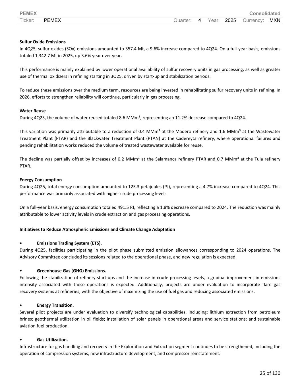 PEMEX Consolidated Ticker: PEMEX Quarter: 4 Year: 2025 Currency: MXN 25 of 130 Sulfur Oxide Emissions In 4Q25, sulfur oxides (SOx) emissions amounted to 357.4 Mt, a 9.6% increase compared to 4Q24. On a full-year basis, emissions totaled 1,342.7 Mt in 2025, up 3.6% year over year. This performance is mainly explained by lower operational availability of sulfur recovery units in gas processing, as well as greater use of thermal oxidizers in refining starting in 3Q25, driven by start-up and stabilization periods. To reduce these emissions over the medium term, resources are being invested in rehabilitating sulfur recovery units in refining. In 2026, efforts to strengthen reliability will continue, particularly in gas processing. Water Reuse During 4Q25, the volume of water reused totaled 8.6 MMm³, representing an 11.2% decrease compared to 4Q24. This variation was primarily attributable to a reduction of 0.4 MMm³ at the Madero refinery and 1.6 MMm³ at the Wastewater Treatment Plant (PTAR) and the Blackwater Treatment Plant (PTAN) at the Cadereyta refinery, where operational failures and pending rehabilitation works reduced the volume of treated wastewater available for reuse. The decline was partially offset by increases of 0.2 MMm³ at the Salamanca refinery PTAR and 0.7 MMm³ at the Tula refinery PTAR. Energy Consumption During 4Q25, total energy consumption amounted to 125.3 petajoules (PJ), representing a 4.7% increase compared to 4Q24. This performance was primarily associated with higher crude processing levels. On a full-year basis, energy consumption totaled 491.5 PJ, reflecting a 1.8% decrease compared to 2024. The reduction was mainly attributable to lower activity levels in crude extraction and gas processing operations. Initiatives to Reduce Atmospheric Emissions and Climate Change Adaptation • Emissions Trading System (ETS). During 4Q25, facilities participating in the pilot phase submitted emission allowances corresponding to 2024 operations. The Advisory Committee concluded its sessions related to the operational phase, and new regulation is expected. • Greenhouse Gas (GHG) Emissions. Following the stabilization of refinery start-ups and the increase in crude processing levels, a gradual improvement in emissions intensity associated with these operations is expected. Additionally, projects are under evaluation to incorporate flare gas recovery systems at refineries, with the objective of maximizing the use of fuel gas and reducing associated emissions. • Energy Transition. Several pilot projects are under evaluation to diversify technological capabilities, including: lithium extraction from petroleum brines; geothermal utilization in oil fields; installation of solar panels in operational areas and service stations; and sustainable aviation fuel production. • Gas Utilization. Infrastructure for gas handling and recovery in the Exploration and Extraction segment continues to be strengthened, including the operation of compression systems, new infrastructure development, and compressor reinstatement.