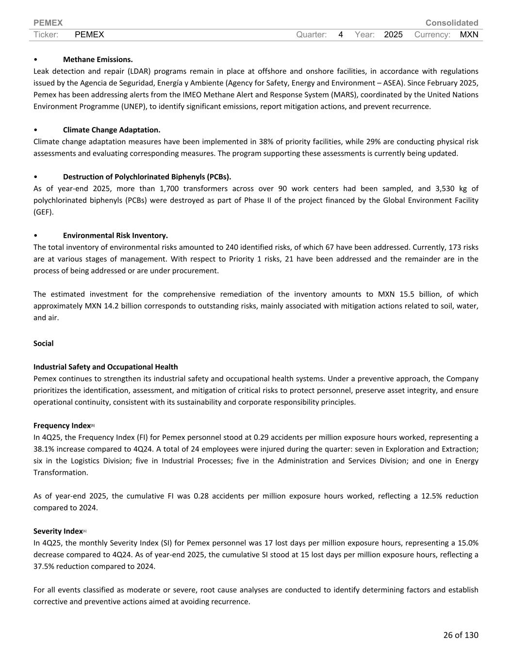 PEMEX Consolidated Ticker: PEMEX Quarter: 4 Year: 2025 Currency: MXN 26 of 130 • Methane Emissions. Leak detection and repair (LDAR) programs remain in place at offshore and onshore facilities, in accordance with regulations issued by the Agencia de Seguridad, Energía y Ambiente (Agency for Safety, Energy and Environment – ASEA). Since February 2025, Pemex has been addressing alerts from the IMEO Methane Alert and Response System (MARS), coordinated by the United Nations Environment Programme (UNEP), to identify significant emissions, report mitigation actions, and prevent recurrence. • Climate Change Adaptation. Climate change adaptation measures have been implemented in 38% of priority facilities, while 29% are conducting physical risk assessments and evaluating corresponding measures. The program supporting these assessments is currently being updated. • Destruction of Polychlorinated Biphenyls (PCBs). As of year-end 2025, more than 1,700 transformers across over 90 work centers had been sampled, and 3,530 kg of polychlorinated biphenyls (PCBs) were destroyed as part of Phase II of the project financed by the Global Environment Facility (GEF). • Environmental Risk Inventory. The total inventory of environmental risks amounted to 240 identified risks, of which 67 have been addressed. Currently, 173 risks are at various stages of management. With respect to Priority 1 risks, 21 have been addressed and the remainder are in the process of being addressed or are under procurement. The estimated investment for the comprehensive remediation of the inventory amounts to MXN 15.5 billion, of which approximately MXN 14.2 billion corresponds to outstanding risks, mainly associated with mitigation actions related to soil, water, and air. Social Industrial Safety and Occupational Health Pemex continues to strengthen its industrial safety and occupational health systems. Under a preventive approach, the Company prioritizes the identification, assessment, and mitigation of critical risks to protect personnel, preserve asset integrity, and ensure operational continuity, consistent with its sustainability and corporate responsibility principles. Frequency Index[5] In 4Q25, the Frequency Index (FI) for Pemex personnel stood at 0.29 accidents per million exposure hours worked, representing a 38.1% increase compared to 4Q24. A total of 24 employees were injured during the quarter: seven in Exploration and Extraction; six in the Logistics Division; five in Industrial Processes; five in the Administration and Services Division; and one in Energy Transformation. As of year-end 2025, the cumulative FI was 0.28 accidents per million exposure hours worked, reflecting a 12.5% reduction compared to 2024. Severity Index[6] In 4Q25, the monthly Severity Index (SI) for Pemex personnel was 17 lost days per million exposure hours, representing a 15.0% decrease compared to 4Q24. As of year-end 2025, the cumulative SI stood at 15 lost days per million exposure hours, reflecting a 37.5% reduction compared to 2024. For all events classified as moderate or severe, root cause analyses are conducted to identify determining factors and establish corrective and preventive actions aimed at avoiding recurrence.