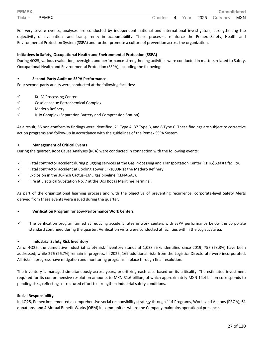 PEMEX Consolidated Ticker: PEMEX Quarter: 4 Year: 2025 Currency: MXN 27 of 130 For very severe events, analyses are conducted by independent national and international investigators, strengthening the objectivity of evaluations and transparency in accountability. These processes reinforce the Pemex Safety, Health and Environmental Protection System (SSPA) and further promote a culture of prevention across the organization. Initiatives in Safety, Occupational Health and Environmental Protection (SSPA) During 4Q25, various evaluation, oversight, and performance-strengthening activities were conducted in matters related to Safety, Occupational Health and Environmental Protection (SSPA), including the following: • Second-Party Audit on SSPA Performance Four second-party audits were conducted at the following facilities: Ku-M Processing Center Cosoleacaque Petrochemical Complex Madero Refinery JuJo Complex (Separation Battery and Compression Station) As a result, 66 non-conformity findings were identified: 21 Type A, 37 Type B, and 8 Type C. These findings are subject to corrective action programs and follow-up in accordance with the guidelines of the Pemex SSPA System. • Management of Critical Events During the quarter, Root Cause Analyses (RCA) were conducted in connection with the following events: Fatal contractor accident during plugging services at the Gas Processing and Transportation Center (CPTG) Atasta facility. Fatal contractor accident at Cooling Tower CT-1000N at the Madero Refinery. Explosion in the 36-inch Cactus–EMC gas pipeline (CENAGAS). Fire at Electrical Substation No. 7 at the Dos Bocas Maritime Terminal. As part of the organizational learning process and with the objective of preventing recurrence, corporate-level Safety Alerts derived from these events were issued during the quarter. • Verification Program for Low-Performance Work Centers The verification program aimed at reducing accident rates in work centers with SSPA performance below the corporate standard continued during the quarter. Verification visits were conducted at facilities within the Logistics area. • Industrial Safety Risk Inventory As of 4Q25, the cumulative industrial safety risk inventory stands at 1,033 risks identified since 2019; 757 (73.3%) have been addressed, while 276 (26.7%) remain in progress. In 2025, 169 additional risks from the Logistics Directorate were incorporated. All risks in progress have mitigation and monitoring programs in place through final resolution. The inventory is managed simultaneously across years, prioritizing each case based on its criticality. The estimated investment required for its comprehensive resolution amounts to MXN 31.6 billion, of which approximately MXN 14.4 billion corresponds to pending risks, reflecting a structured effort to strengthen industrial safety conditions. Social Responsibility In 4Q25, Pemex implemented a comprehensive social responsibility strategy through 114 Programs, Works and Actions (PROA), 61 donations, and 4 Mutual Benefit Works (OBM) in communities where the Company maintains operational presence.