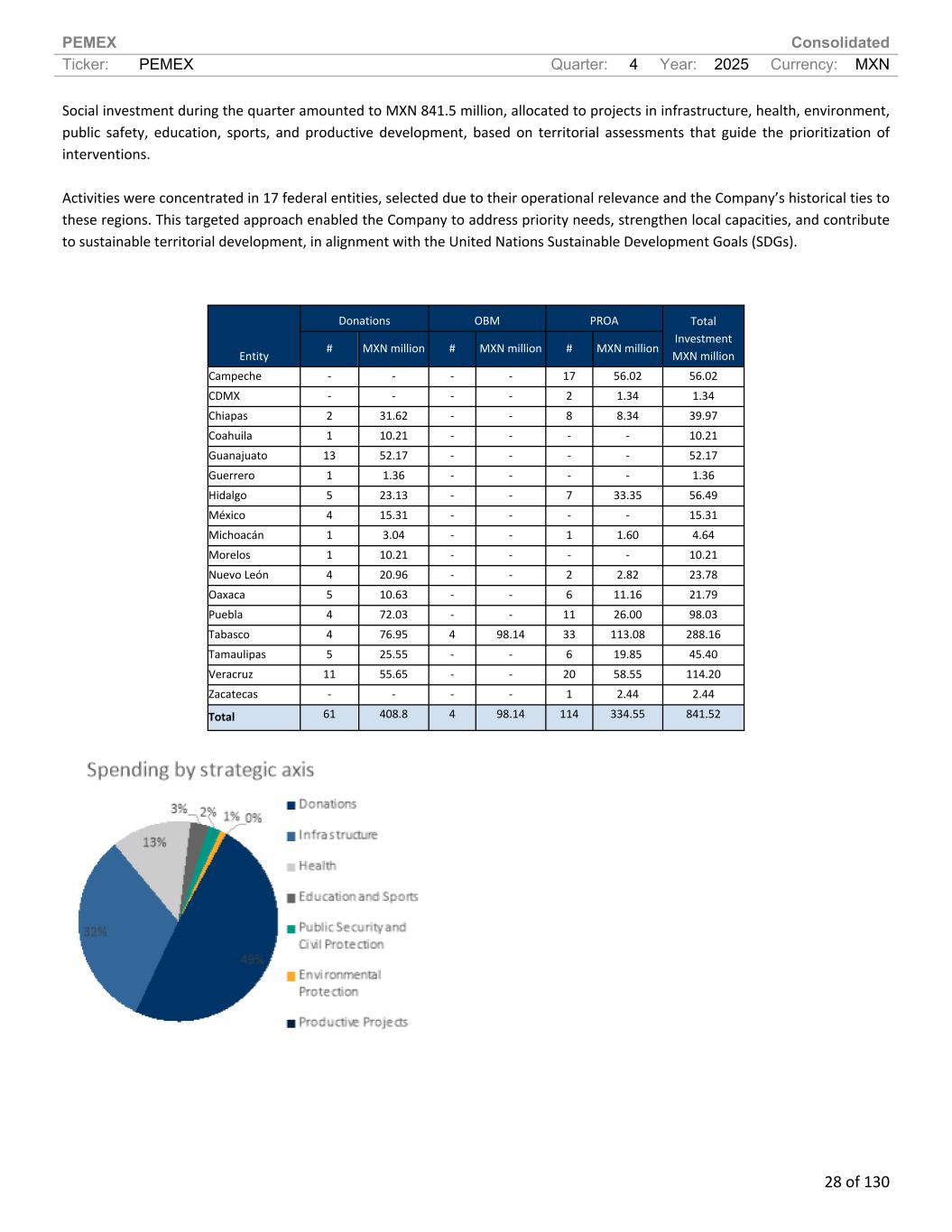 PEMEX Consolidated Ticker: PEMEX Quarter: 4 Year: 2025 Currency: MXN 28 of 130 Social investment during the quarter amounted to MXN 841.5 million, allocated to projects in infrastructure, health, environment, public safety, education, sports, and productive development, based on territorial assessments that guide the prioritization of interventions. Activities were concentrated in 17 federal entities, selected due to their operational relevance and the Company’s historical ties to these regions. This targeted approach enabled the Company to address priority needs, strengthen local capacities, and contribute to sustainable territorial development, in alignment with the United Nations Sustainable Development Goals (SDGs). Donations OBM PROA Entity # MXN million # MXN million # MXN million Total Investment MXN million Campeche - - - - 17 56.02 56.02 CDMX - - - - 2 1.34 1.34 Chiapas 2 31.62 - - 8 8.34 39.97 Coahuila 1 10.21 - - - - 10.21 Guanajuato 13 52.17 - - - - 52.17 Guerrero 1 1.36 - - - - 1.36 Hidalgo 5 23.13 - - 7 33.35 56.49 México 4 15.31 - - - - 15.31 Michoacán 1 3.04 - - 1 1.60 4.64 Morelos 1 10.21 - - - - 10.21 Nuevo León 4 20.96 - - 2 2.82 23.78 Oaxaca 5 10.63 - - 6 11.16 21.79 Puebla 4 72.03 - - 11 26.00 98.03 Tabasco 4 76.95 4 98.14 33 113.08 288.16 Tamaulipas 5 25.55 - - 6 19.85 45.40 Veracruz 11 55.65 - - 20 58.55 114.20 Zacatecas - - - - 1 2.44 2.44 Total 61 408.8 4 98.14 114 334.55 841.52