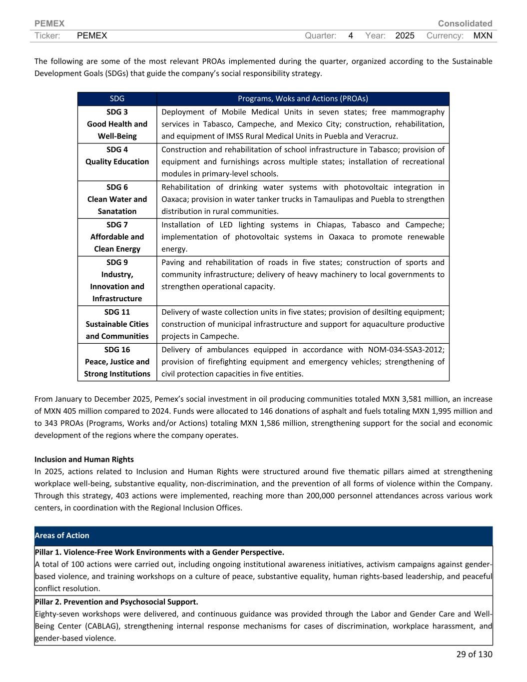 PEMEX Consolidated Ticker: PEMEX Quarter: 4 Year: 2025 Currency: MXN 29 of 130 The following are some of the most relevant PROAs implemented during the quarter, organized according to the Sustainable Development Goals (SDGs) that guide the company’s social responsibility strategy. SDG Programs, Woks and Actions (PROAs) SDG 3 Good Health and Well-Being Deployment of Mobile Medical Units in seven states; free mammography services in Tabasco, Campeche, and Mexico City; construction, rehabilitation, and equipment of IMSS Rural Medical Units in Puebla and Veracruz. SDG 4 Quality Education Construction and rehabilitation of school infrastructure in Tabasco; provision of equipment and furnishings across multiple states; installation of recreational modules in primary-level schools. SDG 6 Clean Water and Sanatation Rehabilitation of drinking water systems with photovoltaic integration in Oaxaca; provision in water tanker trucks in Tamaulipas and Puebla to strengthen distribution in rural communities. SDG 7 Affordable and Clean Energy Installation of LED lighting systems in Chiapas, Tabasco and Campeche; implementation of photovoltaic systems in Oaxaca to promote renewable energy. SDG 9 Industry, Innovation and Infrastructure Paving and rehabilitation of roads in five states; construction of sports and community infrastructure; delivery of heavy machinery to local governments to strengthen operational capacity. SDG 11 Sustainable Cities and Communities Delivery of waste collection units in five states; provision of desilting equipment; construction of municipal infrastructure and support for aquaculture productive projects in Campeche. SDG 16 Peace, Justice and Strong Institutions Delivery of ambulances equipped in accordance with NOM-034-SSA3-2012; provision of firefighting equipment and emergency vehicles; strengthening of civil protection capacities in five entities. From January to December 2025, Pemex’s social investment in oil producing communities totaled MXN 3,581 million, an increase of MXN 405 million compared to 2024. Funds were allocated to 146 donations of asphalt and fuels totaling MXN 1,995 million and to 343 PROAs (Programs, Works and/or Actions) totaling MXN 1,586 million, strengthening support for the social and economic development of the regions where the company operates. Inclusion and Human Rights In 2025, actions related to Inclusion and Human Rights were structured around five thematic pillars aimed at strengthening workplace well-being, substantive equality, non-discrimination, and the prevention of all forms of violence within the Company. Through this strategy, 403 actions were implemented, reaching more than 200,000 personnel attendances across various work centers, in coordination with the Regional Inclusion Offices. Areas of Action Pillar 1. Violence-Free Work Environments with a Gender Perspective. A total of 100 actions were carried out, including ongoing institutional awareness initiatives, activism campaigns against gender- based violence, and training workshops on a culture of peace, substantive equality, human rights-based leadership, and peaceful conflict resolution. Pillar 2. Prevention and Psychosocial Support. Eighty-seven workshops were delivered, and continuous guidance was provided through the Labor and Gender Care and Well- Being Center (CABLAG), strengthening internal response mechanisms for cases of discrimination, workplace harassment, and gender-based violence.