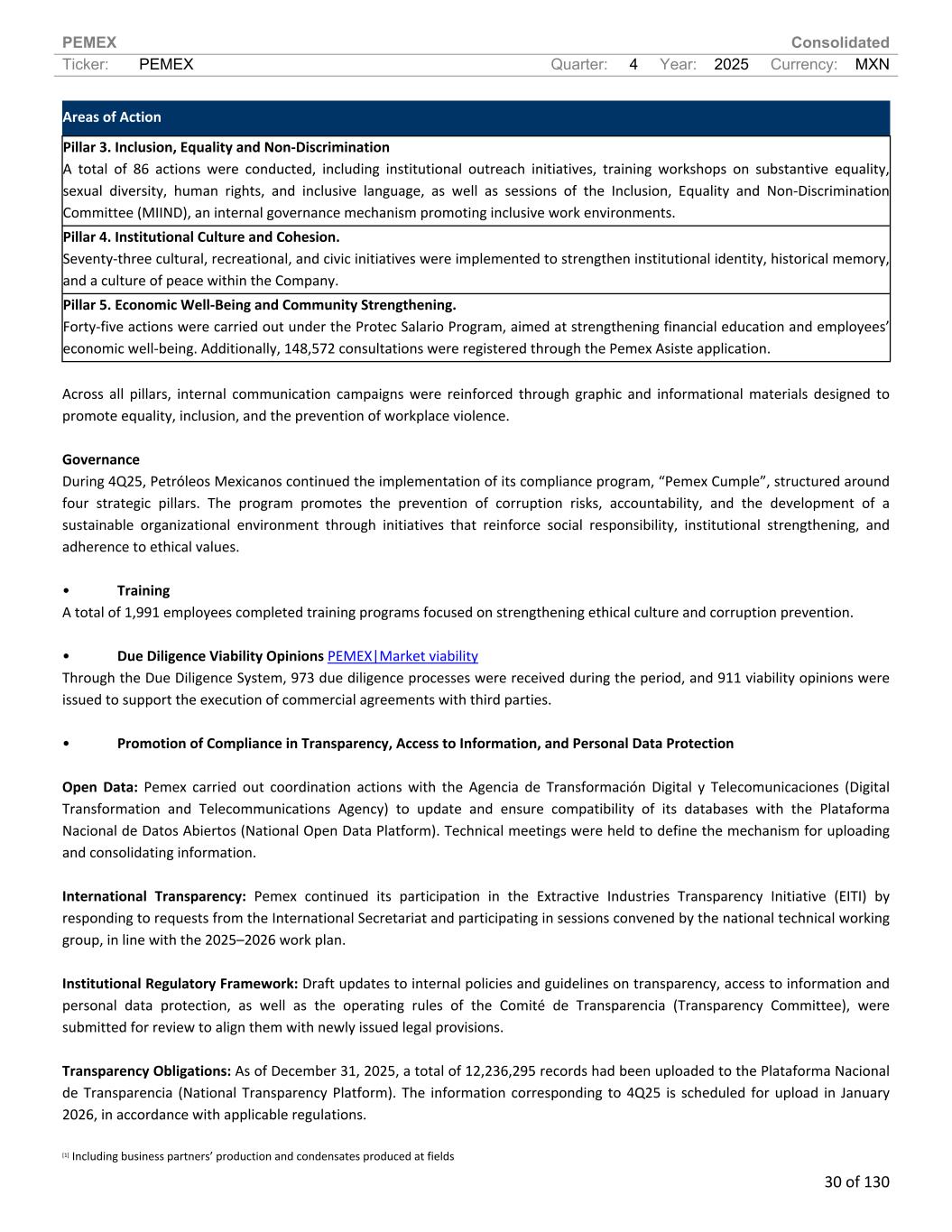 PEMEX Consolidated Ticker: PEMEX Quarter: 4 Year: 2025 Currency: MXN 30 of 130 Areas of Action Pillar 3. Inclusion, Equality and Non-Discrimination A total of 86 actions were conducted, including institutional outreach initiatives, training workshops on substantive equality, sexual diversity, human rights, and inclusive language, as well as sessions of the Inclusion, Equality and Non-Discrimination Committee (MIIND), an internal governance mechanism promoting inclusive work environments. Pillar 4. Institutional Culture and Cohesion. Seventy-three cultural, recreational, and civic initiatives were implemented to strengthen institutional identity, historical memory, and a culture of peace within the Company. Pillar 5. Economic Well-Being and Community Strengthening. Forty-five actions were carried out under the Protec Salario Program, aimed at strengthening financial education and employees’ economic well-being. Additionally, 148,572 consultations were registered through the Pemex Asiste application. Across all pillars, internal communication campaigns were reinforced through graphic and informational materials designed to promote equality, inclusion, and the prevention of workplace violence. Governance During 4Q25, Petróleos Mexicanos continued the implementation of its compliance program, “Pemex Cumple”, structured around four strategic pillars. The program promotes the prevention of corruption risks, accountability, and the development of a sustainable organizational environment through initiatives that reinforce social responsibility, institutional strengthening, and adherence to ethical values. • Training A total of 1,991 employees completed training programs focused on strengthening ethical culture and corruption prevention. • Due Diligence Viability Opinions PEMEX|Market viability Through the Due Diligence System, 973 due diligence processes were received during the period, and 911 viability opinions were issued to support the execution of commercial agreements with third parties. • Promotion of Compliance in Transparency, Access to Information, and Personal Data Protection Open Data: Pemex carried out coordination actions with the Agencia de Transformación Digital y Telecomunicaciones (Digital Transformation and Telecommunications Agency) to update and ensure compatibility of its databases with the Plataforma Nacional de Datos Abiertos (National Open Data Platform). Technical meetings were held to define the mechanism for uploading and consolidating information. International Transparency: Pemex continued its participation in the Extractive Industries Transparency Initiative (EITI) by responding to requests from the International Secretariat and participating in sessions convened by the national technical working group, in line with the 2025–2026 work plan. Institutional Regulatory Framework: Draft updates to internal policies and guidelines on transparency, access to information and personal data protection, as well as the operating rules of the Comité de Transparencia (Transparency Committee), were submitted for review to align them with newly issued legal provisions. Transparency Obligations: As of December 31, 2025, a total of 12,236,295 records had been uploaded to the Plataforma Nacional de Transparencia (National Transparency Platform). The information corresponding to 4Q25 is scheduled for upload in January 2026, in accordance with applicable regulations. [1] Including business partners’ production and condensates produced at fields