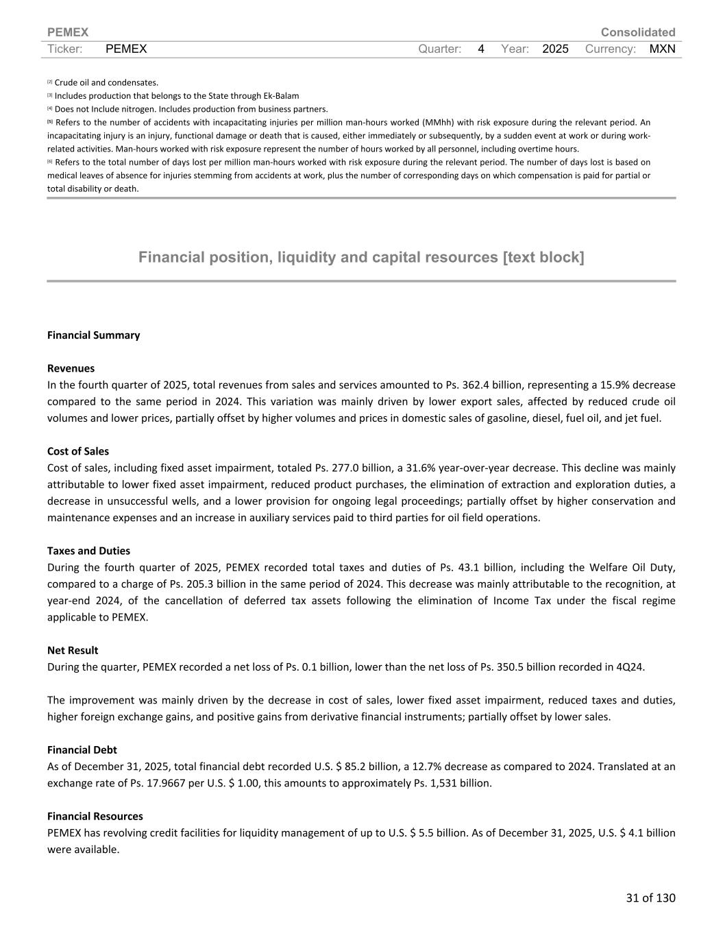 PEMEX Consolidated Ticker: PEMEX Quarter: 4 Year: 2025 Currency: MXN 31 of 130 [2] Crude oil and condensates. [3] Includes production that belongs to the State through Ek-Balam [4] Does not Include nitrogen. Includes production from business partners. [5] Refers to the number of accidents with incapacitating injuries per million man-hours worked (MMhh) with risk exposure during the relevant period. An incapacitating injury is an injury, functional damage or death that is caused, either immediately or subsequently, by a sudden event at work or during work- related activities. Man-hours worked with risk exposure represent the number of hours worked by all personnel, including overtime hours. [6] Refers to the total number of days lost per million man-hours worked with risk exposure during the relevant period. The number of days lost is based on medical leaves of absence for injuries stemming from accidents at work, plus the number of corresponding days on which compensation is paid for partial or total disability or death. Financial position, liquidity and capital resources [text block] Financial Summary Revenues In the fourth quarter of 2025, total revenues from sales and services amounted to Ps. 362.4 billion, representing a 15.9% decrease compared to the same period in 2024. This variation was mainly driven by lower export sales, affected by reduced crude oil volumes and lower prices, partially offset by higher volumes and prices in domestic sales of gasoline, diesel, fuel oil, and jet fuel. Cost of Sales Cost of sales, including fixed asset impairment, totaled Ps. 277.0 billion, a 31.6% year-over-year decrease. This decline was mainly attributable to lower fixed asset impairment, reduced product purchases, the elimination of extraction and exploration duties, a decrease in unsuccessful wells, and a lower provision for ongoing legal proceedings; partially offset by higher conservation and maintenance expenses and an increase in auxiliary services paid to third parties for oil field operations. Taxes and Duties During the fourth quarter of 2025, PEMEX recorded total taxes and duties of Ps. 43.1 billion, including the Welfare Oil Duty, compared to a charge of Ps. 205.3 billion in the same period of 2024. This decrease was mainly attributable to the recognition, at year-end 2024, of the cancellation of deferred tax assets following the elimination of Income Tax under the fiscal regime applicable to PEMEX. Net Result During the quarter, PEMEX recorded a net loss of Ps. 0.1 billion, lower than the net loss of Ps. 350.5 billion recorded in 4Q24. The improvement was mainly driven by the decrease in cost of sales, lower fixed asset impairment, reduced taxes and duties, higher foreign exchange gains, and positive gains from derivative financial instruments; partially offset by lower sales. Financial Debt As of December 31, 2025, total financial debt recorded U.S. $ 85.2 billion, a 12.7% decrease as compared to 2024. Translated at an exchange rate of Ps. 17.9667 per U.S. $ 1.00, this amounts to approximately Ps. 1,531 billion. Financial Resources PEMEX has revolving credit facilities for liquidity management of up to U.S. $ 5.5 billion. As of December 31, 2025, U.S. $ 4.1 billion were available.