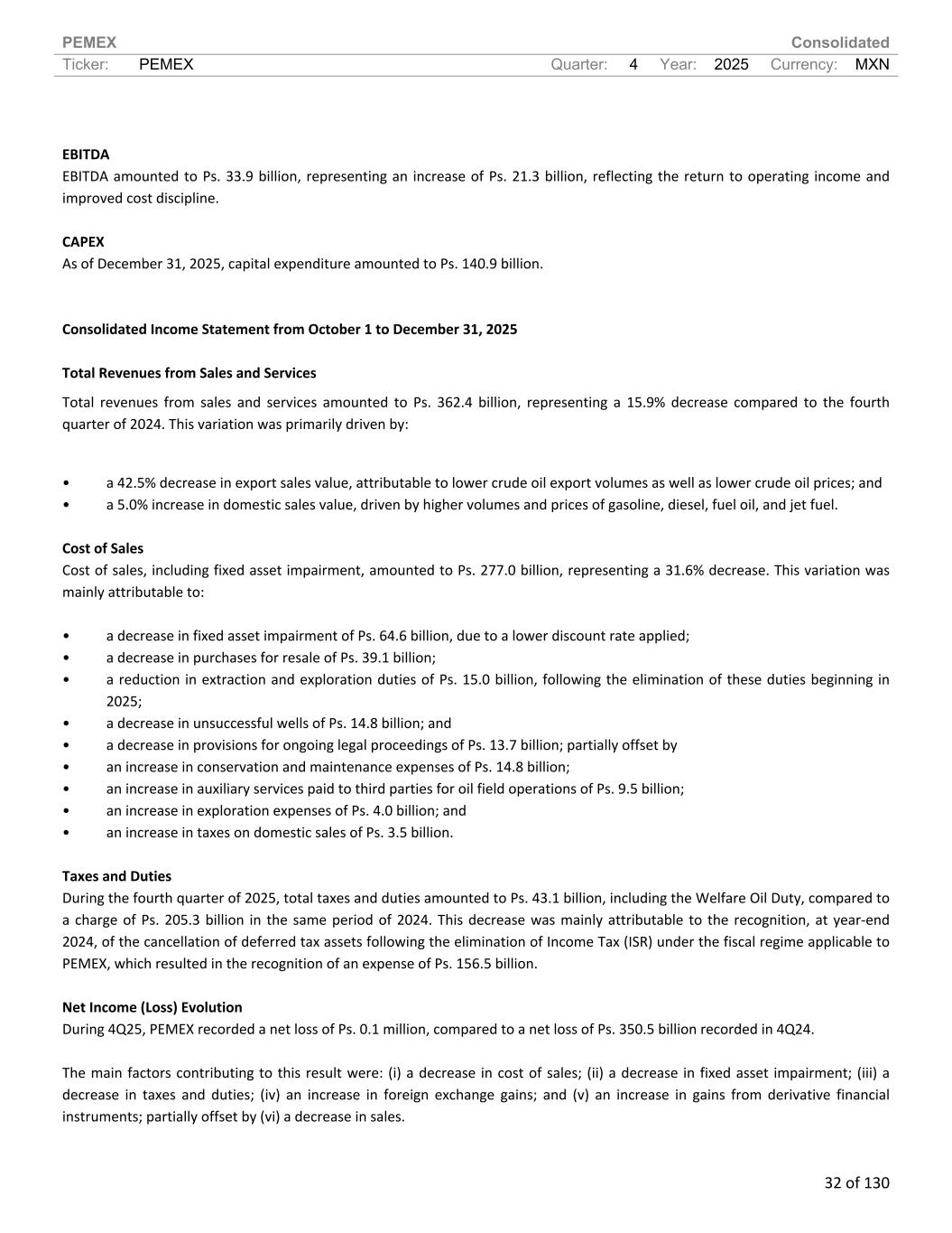 PEMEX Consolidated Ticker: PEMEX Quarter: 4 Year: 2025 Currency: MXN 32 of 130 EBITDA EBITDA amounted to Ps. 33.9 billion, representing an increase of Ps. 21.3 billion, reflecting the return to operating income and improved cost discipline. CAPEX As of December 31, 2025, capital expenditure amounted to Ps. 140.9 billion. Consolidated Income Statement from October 1 to December 31, 2025 Total Revenues from Sales and Services Total revenues from sales and services amounted to Ps. 362.4 billion, representing a 15.9% decrease compared to the fourth quarter of 2024. This variation was primarily driven by: • a 42.5% decrease in export sales value, attributable to lower crude oil export volumes as well as lower crude oil prices; and • a 5.0% increase in domestic sales value, driven by higher volumes and prices of gasoline, diesel, fuel oil, and jet fuel. Cost of Sales Cost of sales, including fixed asset impairment, amounted to Ps. 277.0 billion, representing a 31.6% decrease. This variation was mainly attributable to: • a decrease in fixed asset impairment of Ps. 64.6 billion, due to a lower discount rate applied; • a decrease in purchases for resale of Ps. 39.1 billion; • a reduction in extraction and exploration duties of Ps. 15.0 billion, following the elimination of these duties beginning in 2025; • a decrease in unsuccessful wells of Ps. 14.8 billion; and • a decrease in provisions for ongoing legal proceedings of Ps. 13.7 billion; partially offset by • an increase in conservation and maintenance expenses of Ps. 14.8 billion; • an increase in auxiliary services paid to third parties for oil field operations of Ps. 9.5 billion; • an increase in exploration expenses of Ps. 4.0 billion; and • an increase in taxes on domestic sales of Ps. 3.5 billion. Taxes and Duties During the fourth quarter of 2025, total taxes and duties amounted to Ps. 43.1 billion, including the Welfare Oil Duty, compared to a charge of Ps. 205.3 billion in the same period of 2024. This decrease was mainly attributable to the recognition, at year-end 2024, of the cancellation of deferred tax assets following the elimination of Income Tax (ISR) under the fiscal regime applicable to PEMEX, which resulted in the recognition of an expense of Ps. 156.5 billion. Net Income (Loss) Evolution During 4Q25, PEMEX recorded a net loss of Ps. 0.1 million, compared to a net loss of Ps. 350.5 billion recorded in 4Q24. The main factors contributing to this result were: (i) a decrease in cost of sales; (ii) a decrease in fixed asset impairment; (iii) a decrease in taxes and duties; (iv) an increase in foreign exchange gains; and (v) an increase in gains from derivative financial instruments; partially offset by (vi) a decrease in sales.