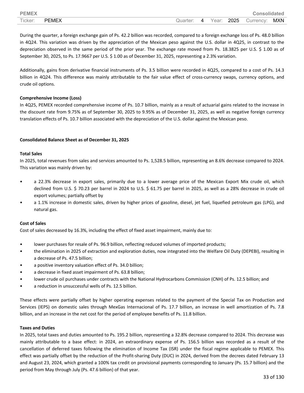 PEMEX Consolidated Ticker: PEMEX Quarter: 4 Year: 2025 Currency: MXN 33 of 130 During the quarter, a foreign exchange gain of Ps. 42.2 billion was recorded, compared to a foreign exchange loss of Ps. 48.0 billion in 4Q24. This variation was driven by the appreciation of the Mexican peso against the U.S. dollar in 4Q25, in contrast to the depreciation observed in the same period of the prior year. The exchange rate moved from Ps. 18.3825 per U.S. $ 1.00 as of September 30, 2025, to Ps. 17.9667 per U.S. $ 1.00 as of December 31, 2025, representing a 2.3% variation. Additionally, gains from derivative financial instruments of Ps. 3.5 billion were recorded in 4Q25, compared to a cost of Ps. 14.3 billion in 4Q24. This difference was mainly attributable to the fair value effect of cross-currency swaps, currency options, and crude oil options. Comprehensive Income (Loss) In 4Q25, PEMEX recorded comprehensive income of Ps. 10.7 billion, mainly as a result of actuarial gains related to the increase in the discount rate from 9.75% as of September 30, 2025 to 9.95% as of December 31, 2025, as well as negative foreign currency translation effects of Ps. 10.7 billion associated with the depreciation of the U.S. dollar against the Mexican peso. Consolidated Balance Sheet as of December 31, 2025 Total Sales In 2025, total revenues from sales and services amounted to Ps. 1,528.5 billion, representing an 8.6% decrease compared to 2024. This variation was mainly driven by: • a 22.3% decrease in export sales, primarily due to a lower average price of the Mexican Export Mix crude oil, which declined from U.S. $ 70.23 per barrel in 2024 to U.S. $ 61.75 per barrel in 2025, as well as a 28% decrease in crude oil export volumes; partially offset by • a 1.1% increase in domestic sales, driven by higher prices of gasoline, diesel, jet fuel, liquefied petroleum gas (LPG), and natural gas. Cost of Sales Cost of sales decreased by 16.3%, including the effect of fixed asset impairment, mainly due to: • lower purchases for resale of Ps. 96.9 billion, reflecting reduced volumes of imported products; • the elimination in 2025 of extraction and exploration duties, now integrated into the Welfare Oil Duty (DEPEBI), resulting in a decrease of Ps. 47.5 billion; • a positive inventory valuation effect of Ps. 34.0 billion; • a decrease in fixed asset impairment of Ps. 63.8 billion; • lower crude oil purchases under contracts with the National Hydrocarbons Commission (CNH) of Ps. 12.5 billion; and • a reduction in unsuccessful wells of Ps. 12.5 billion. These effects were partially offset by higher operating expenses related to the payment of the Special Tax on Production and Services (IEPS) on domestic sales through MexGas Internacional of Ps. 17.7 billion, an increase in well amortization of Ps. 7.8 billion, and an increase in the net cost for the period of employee benefits of Ps. 11.8 billion. Taxes and Duties In 2025, total taxes and duties amounted to Ps. 195.2 billion, representing a 32.8% decrease compared to 2024. This decrease was mainly attributable to a base effect: in 2024, an extraordinary expense of Ps. 156.5 billion was recorded as a result of the cancellation of deferred taxes following the elimination of Income Tax (ISR) under the fiscal regime applicable to PEMEX. This effect was partially offset by the reduction of the Profit-sharing Duty (DUC) in 2024, derived from the decrees dated February 13 and August 23, 2024, which granted a 100% tax credit on provisional payments corresponding to January (Ps. 15.7 billion) and the period from May through July (Ps. 47.6 billion) of that year.
