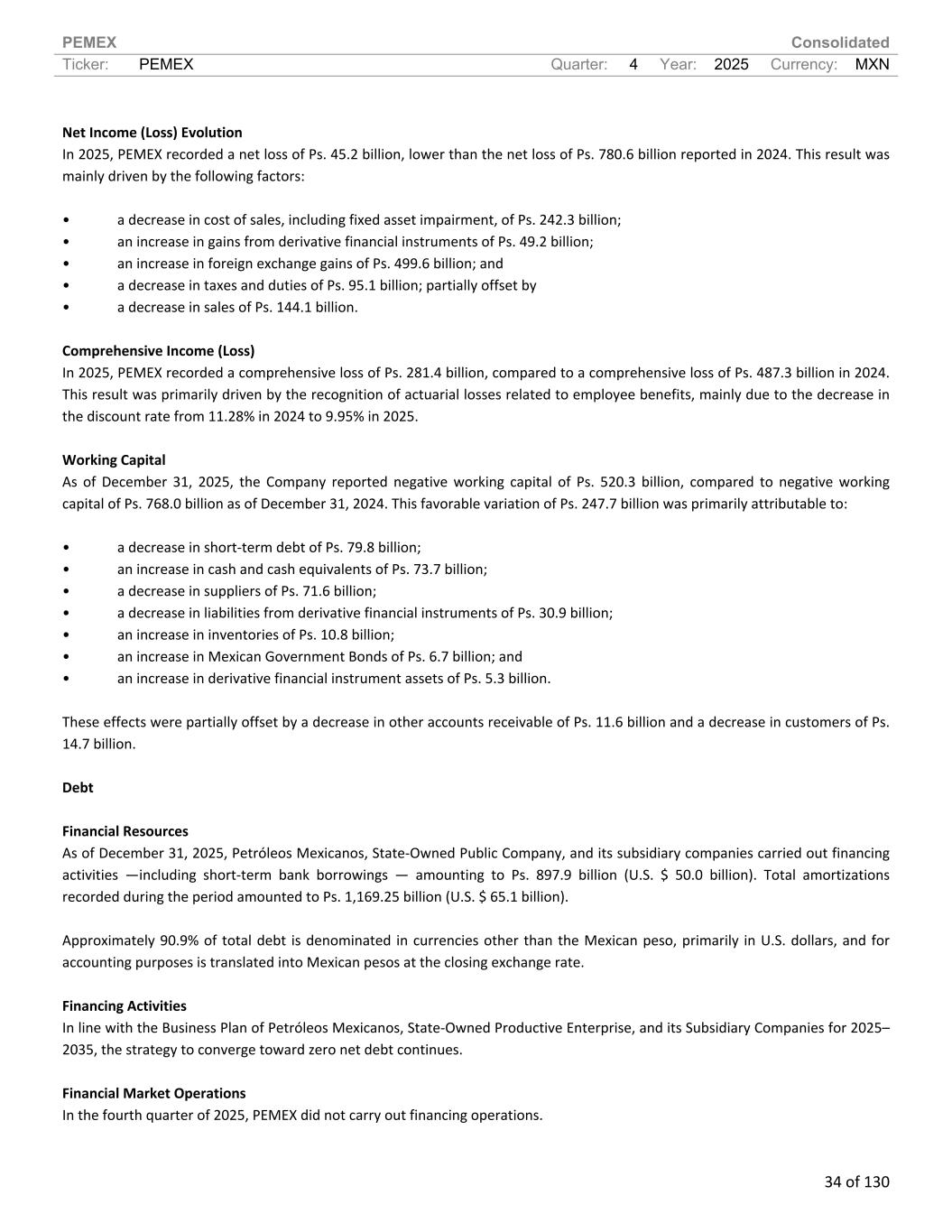 PEMEX Consolidated Ticker: PEMEX Quarter: 4 Year: 2025 Currency: MXN 34 of 130 Net Income (Loss) Evolution In 2025, PEMEX recorded a net loss of Ps. 45.2 billion, lower than the net loss of Ps. 780.6 billion reported in 2024. This result was mainly driven by the following factors: • a decrease in cost of sales, including fixed asset impairment, of Ps. 242.3 billion; • an increase in gains from derivative financial instruments of Ps. 49.2 billion; • an increase in foreign exchange gains of Ps. 499.6 billion; and • a decrease in taxes and duties of Ps. 95.1 billion; partially offset by • a decrease in sales of Ps. 144.1 billion. Comprehensive Income (Loss) In 2025, PEMEX recorded a comprehensive loss of Ps. 281.4 billion, compared to a comprehensive loss of Ps. 487.3 billion in 2024. This result was primarily driven by the recognition of actuarial losses related to employee benefits, mainly due to the decrease in the discount rate from 11.28% in 2024 to 9.95% in 2025. Working Capital As of December 31, 2025, the Company reported negative working capital of Ps. 520.3 billion, compared to negative working capital of Ps. 768.0 billion as of December 31, 2024. This favorable variation of Ps. 247.7 billion was primarily attributable to: • a decrease in short-term debt of Ps. 79.8 billion; • an increase in cash and cash equivalents of Ps. 73.7 billion; • a decrease in suppliers of Ps. 71.6 billion; • a decrease in liabilities from derivative financial instruments of Ps. 30.9 billion; • an increase in inventories of Ps. 10.8 billion; • an increase in Mexican Government Bonds of Ps. 6.7 billion; and • an increase in derivative financial instrument assets of Ps. 5.3 billion. These effects were partially offset by a decrease in other accounts receivable of Ps. 11.6 billion and a decrease in customers of Ps. 14.7 billion. Debt Financial Resources As of December 31, 2025, Petróleos Mexicanos, State-Owned Public Company, and its subsidiary companies carried out financing activities —including short-term bank borrowings — amounting to Ps. 897.9 billion (U.S. $ 50.0 billion). Total amortizations recorded during the period amounted to Ps. 1,169.25 billion (U.S. $ 65.1 billion). Approximately 90.9% of total debt is denominated in currencies other than the Mexican peso, primarily in U.S. dollars, and for accounting purposes is translated into Mexican pesos at the closing exchange rate. Financing Activities In line with the Business Plan of Petróleos Mexicanos, State-Owned Productive Enterprise, and its Subsidiary Companies for 2025– 2035, the strategy to converge toward zero net debt continues. Financial Market Operations In the fourth quarter of 2025, PEMEX did not carry out financing operations.