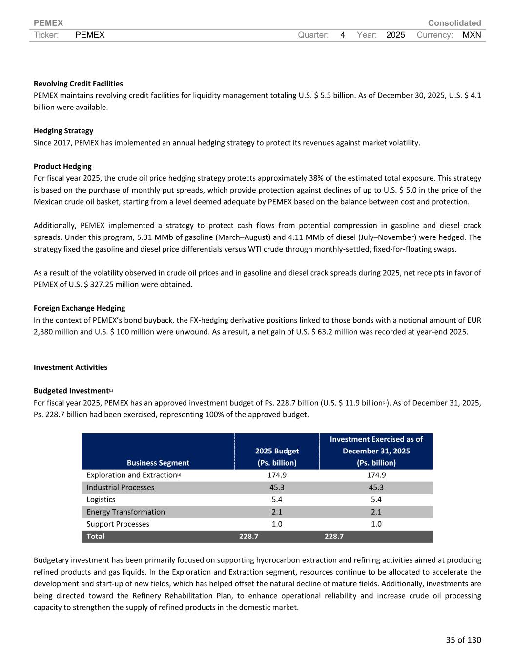PEMEX Consolidated Ticker: PEMEX Quarter: 4 Year: 2025 Currency: MXN 35 of 130 Revolving Credit Facilities PEMEX maintains revolving credit facilities for liquidity management totaling U.S. $ 5.5 billion. As of December 30, 2025, U.S. $ 4.1 billion were available. Hedging Strategy Since 2017, PEMEX has implemented an annual hedging strategy to protect its revenues against market volatility. Product Hedging For fiscal year 2025, the crude oil price hedging strategy protects approximately 38% of the estimated total exposure. This strategy is based on the purchase of monthly put spreads, which provide protection against declines of up to U.S. $ 5.0 in the price of the Mexican crude oil basket, starting from a level deemed adequate by PEMEX based on the balance between cost and protection. Additionally, PEMEX implemented a strategy to protect cash flows from potential compression in gasoline and diesel crack spreads. Under this program, 5.31 MMb of gasoline (March–August) and 4.11 MMb of diesel (July–November) were hedged. The strategy fixed the gasoline and diesel price differentials versus WTI crude through monthly-settled, fixed-for-floating swaps. As a result of the volatility observed in crude oil prices and in gasoline and diesel crack spreads during 2025, net receipts in favor of PEMEX of U.S. $ 327.25 million were obtained. Foreign Exchange Hedging In the context of PEMEX’s bond buyback, the FX-hedging derivative positions linked to those bonds with a notional amount of EUR 2,380 million and U.S. $ 100 million were unwound. As a result, a net gain of U.S. $ 63.2 million was recorded at year-end 2025. Investment Activities Budgeted Investment[1] For fiscal year 2025, PEMEX has an approved investment budget of Ps. 228.7 billion (U.S. $ 11.9 billion[2]). As of December 31, 2025, Ps. 228.7 billion had been exercised, representing 100% of the approved budget. Business Segment 2025 Budget (Ps. billion) Investment Exercised as of December 31, 2025 (Ps. billion) Exploration and Extraction[3] 174.9 174.9 Industrial Processes 45.3 45.3 Logistics 5.4 5.4 Energy Transformation 2.1 2.1 Support Processes 1.0 1.0 Total 228.7 228.7 Budgetary investment has been primarily focused on supporting hydrocarbon extraction and refining activities aimed at producing refined products and gas liquids. In the Exploration and Extraction segment, resources continue to be allocated to accelerate the development and start-up of new fields, which has helped offset the natural decline of mature fields. Additionally, investments are being directed toward the Refinery Rehabilitation Plan, to enhance operational reliability and increase crude oil processing capacity to strengthen the supply of refined products in the domestic market.