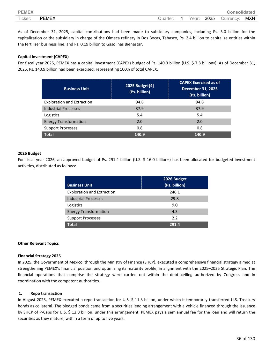 PEMEX Consolidated Ticker: PEMEX Quarter: 4 Year: 2025 Currency: MXN 36 of 130 As of December 31, 2025, capital contributions had been made to subsidiary companies, including Ps. 5.0 billion for the capitalization or the subsidiary in charge of the Olmeca refinery in Dos Bocas, Tabasco, Ps. 2.4 billion to capitalize entities within the fertilizer business line, and Ps. 0.19 billion to Gasolinas Bienestar. Capital Investment (CAPEX) For fiscal year 2025, PEMEX has a capital investment (CAPEX) budget of Ps. 140.9 billion (U.S. $ 7.3 billion12). As of December 31, 2025, Ps. 140.9 billion had been exercised, representing 100% of total CAPEX. Business Unit 2025 Budget[4] (Ps. billion) CAPEX Exercised as of December 31, 2025 (Ps. billion) Exploration and Extraction 94.8 94.8 Industrial Processes 37.9 37.9 Logistics 5.4 5.4 Energy Transformation 2.0 2.0 Support Processes 0.8 0.8 Total 140.9 140.9 2026 Budget For fiscal year 2026, an approved budget of Ps. 291.4 billion (U.S. $ 16.0 billion[5]) has been allocated for budgeted investment activities, distributed as follows: Business Unit 2026 Budget (Ps. billion) Exploration and Extraction 246.1 Industrial Processes 29.8 Logistics 9.0 Energy Transformation 4.3 Support Processes 2.2 Total 291.4 Other Relevant Topics Financial Strategy 2025 In 2025, the Government of Mexico, through the Ministry of Finance (SHCP), executed a comprehensive financial strategy aimed at strengthening PEMEX’s financial position and optimizing its maturity profile, in alignment with the 2025–2035 Strategic Plan. The financial operations that comprise the strategy were carried out within the debt ceiling authorized by Congress and in coordination with the competent authorities. 1. Repo transaction In August 2025, PEMEX executed a repo transaction for U.S. $ 11.3 billion, under which it temporarily transferred U.S. Treasury bonds as collateral. The pledged bonds came from a securities lending arrangement with a vehicle financed through the issuance by SHCP of P-Caps for U.S. $ 12.0 billion; under this arrangement, PEMEX pays a semiannual fee for the loan and will return the securities as they mature, within a term of up to five years.