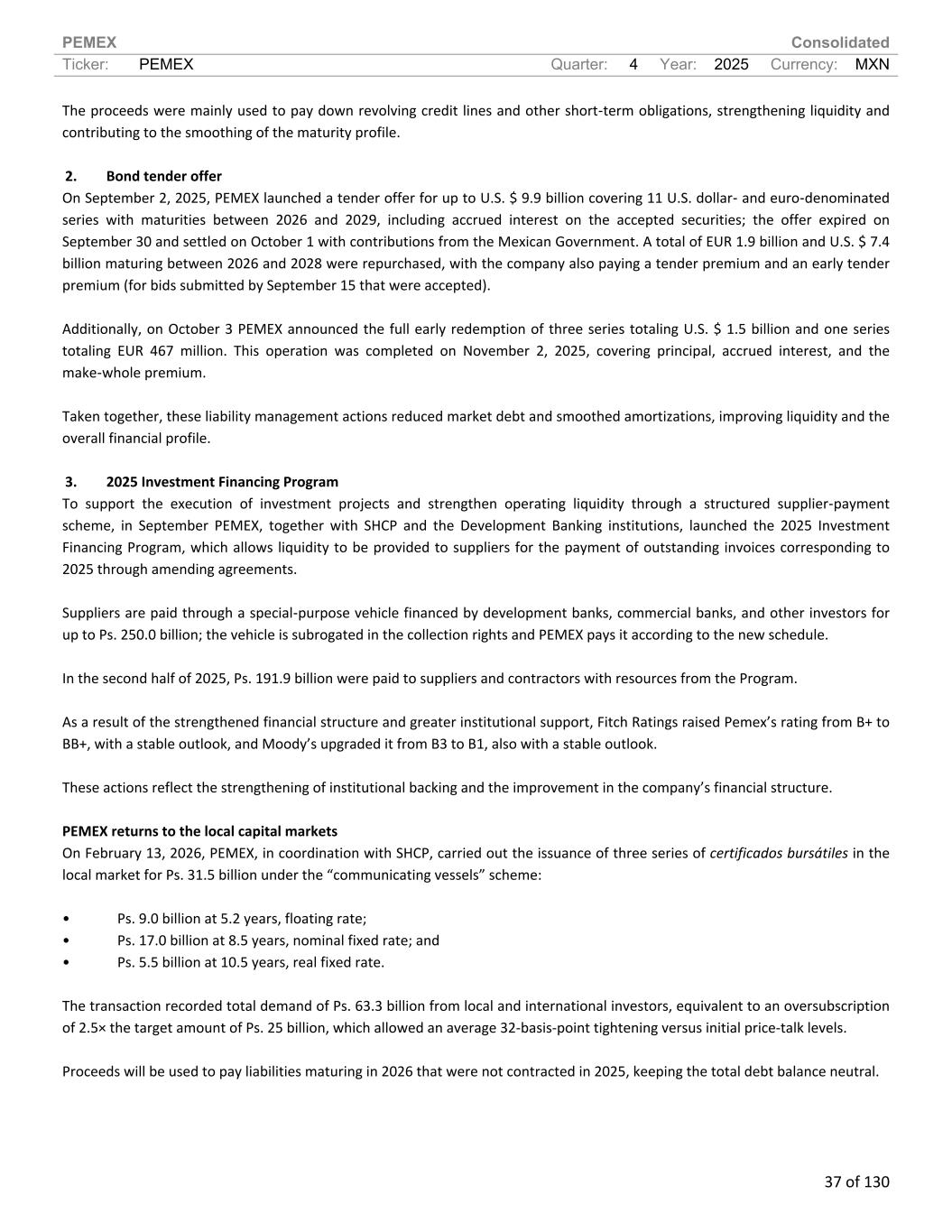 PEMEX Consolidated Ticker: PEMEX Quarter: 4 Year: 2025 Currency: MXN 37 of 130 The proceeds were mainly used to pay down revolving credit lines and other short-term obligations, strengthening liquidity and contributing to the smoothing of the maturity profile. 2. Bond tender offer On September 2, 2025, PEMEX launched a tender offer for up to U.S. $ 9.9 billion covering 11 U.S. dollar- and euro-denominated series with maturities between 2026 and 2029, including accrued interest on the accepted securities; the offer expired on September 30 and settled on October 1 with contributions from the Mexican Government. A total of EUR 1.9 billion and U.S. $ 7.4 billion maturing between 2026 and 2028 were repurchased, with the company also paying a tender premium and an early tender premium (for bids submitted by September 15 that were accepted). Additionally, on October 3 PEMEX announced the full early redemption of three series totaling U.S. $ 1.5 billion and one series totaling EUR 467 million. This operation was completed on November 2, 2025, covering principal, accrued interest, and the make-whole premium. Taken together, these liability management actions reduced market debt and smoothed amortizations, improving liquidity and the overall financial profile. 3. 2025 Investment Financing Program To support the execution of investment projects and strengthen operating liquidity through a structured supplier-payment scheme, in September PEMEX, together with SHCP and the Development Banking institutions, launched the 2025 Investment Financing Program, which allows liquidity to be provided to suppliers for the payment of outstanding invoices corresponding to 2025 through amending agreements. Suppliers are paid through a special-purpose vehicle financed by development banks, commercial banks, and other investors for up to Ps. 250.0 billion; the vehicle is subrogated in the collection rights and PEMEX pays it according to the new schedule. In the second half of 2025, Ps. 191.9 billion were paid to suppliers and contractors with resources from the Program. As a result of the strengthened financial structure and greater institutional support, Fitch Ratings raised Pemex’s rating from B+ to BB+, with a stable outlook, and Moody’s upgraded it from B3 to B1, also with a stable outlook. These actions reflect the strengthening of institutional backing and the improvement in the company’s financial structure. PEMEX returns to the local capital markets On February 13, 2026, PEMEX, in coordination with SHCP, carried out the issuance of three series of certificados bursátiles in the local market for Ps. 31.5 billion under the “communicating vessels” scheme: • Ps. 9.0 billion at 5.2 years, floating rate; • Ps. 17.0 billion at 8.5 years, nominal fixed rate; and • Ps. 5.5 billion at 10.5 years, real fixed rate. The transaction recorded total demand of Ps. 63.3 billion from local and international investors, equivalent to an oversubscription of 2.5× the target amount of Ps. 25 billion, which allowed an average 32-basis-point tightening versus initial price-talk levels. Proceeds will be used to pay liabilities maturing in 2026 that were not contracted in 2025, keeping the total debt balance neutral.
