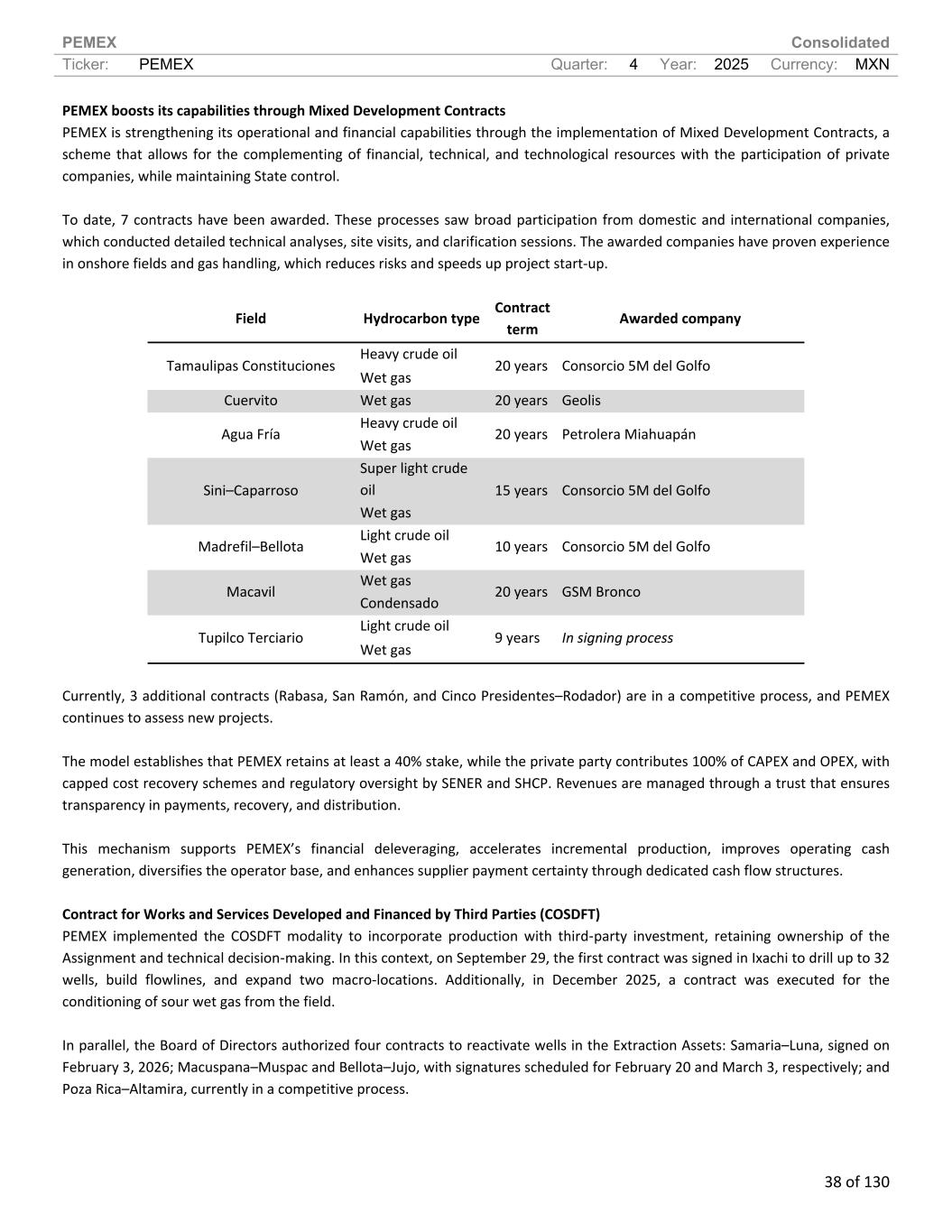 PEMEX Consolidated Ticker: PEMEX Quarter: 4 Year: 2025 Currency: MXN 38 of 130 PEMEX boosts its capabilities through Mixed Development Contracts PEMEX is strengthening its operational and financial capabilities through the implementation of Mixed Development Contracts, a scheme that allows for the complementing of financial, technical, and technological resources with the participation of private companies, while maintaining State control. To date, 7 contracts have been awarded. These processes saw broad participation from domestic and international companies, which conducted detailed technical analyses, site visits, and clarification sessions. The awarded companies have proven experience in onshore fields and gas handling, which reduces risks and speeds up project start-up. Field Hydrocarbon type Contract term Awarded company Heavy crude oil Tamaulipas Constituciones Wet gas 20 years Consorcio 5M del Golfo Cuervito Wet gas 20 years Geolis Heavy crude oil Agua Fría Wet gas 20 years Petrolera Miahuapán Super light crude oilSini–Caparroso Wet gas 15 years Consorcio 5M del Golfo Light crude oil Madrefil–Bellota Wet gas 10 years Consorcio 5M del Golfo Wet gas Macavil Condensado 20 years GSM Bronco Light crude oil Tupilco Terciario Wet gas 9 years In signing process Currently, 3 additional contracts (Rabasa, San Ramón, and Cinco Presidentes–Rodador) are in a competitive process, and PEMEX continues to assess new projects. The model establishes that PEMEX retains at least a 40% stake, while the private party contributes 100% of CAPEX and OPEX, with capped cost recovery schemes and regulatory oversight by SENER and SHCP. Revenues are managed through a trust that ensures transparency in payments, recovery, and distribution. This mechanism supports PEMEX’s financial deleveraging, accelerates incremental production, improves operating cash generation, diversifies the operator base, and enhances supplier payment certainty through dedicated cash flow structures. Contract for Works and Services Developed and Financed by Third Parties (COSDFT) PEMEX implemented the COSDFT modality to incorporate production with third-party investment, retaining ownership of the Assignment and technical decision-making. In this context, on September 29, the first contract was signed in Ixachi to drill up to 32 wells, build flowlines, and expand two macro-locations. Additionally, in December 2025, a contract was executed for the conditioning of sour wet gas from the field. In parallel, the Board of Directors authorized four contracts to reactivate wells in the Extraction Assets: Samaria–Luna, signed on February 3, 2026; Macuspana–Muspac and Bellota–Jujo, with signatures scheduled for February 20 and March 3, respectively; and Poza Rica–Altamira, currently in a competitive process.