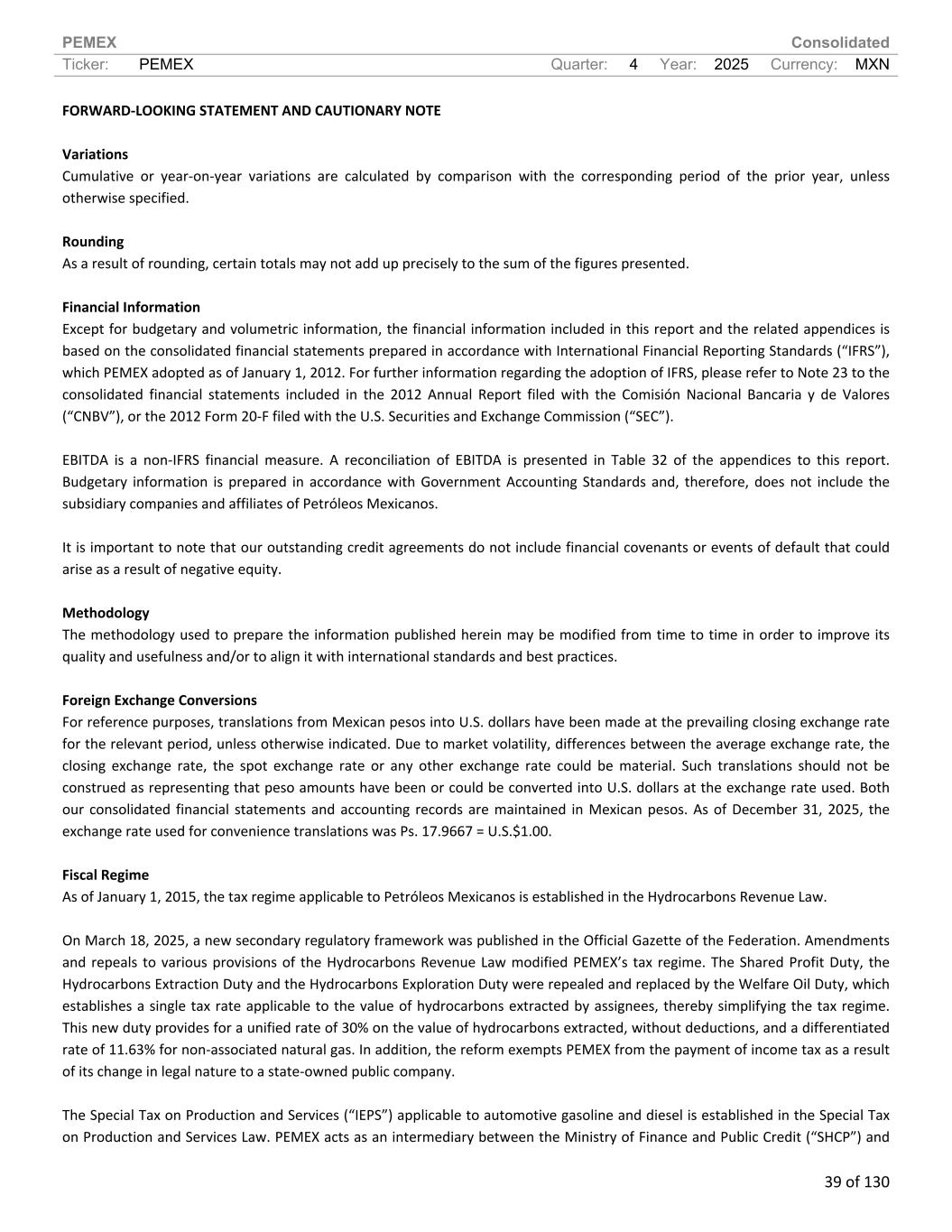 PEMEX Consolidated Ticker: PEMEX Quarter: 4 Year: 2025 Currency: MXN 39 of 130 FORWARD-LOOKING STATEMENT AND CAUTIONARY NOTE Variations Cumulative or year-on-year variations are calculated by comparison with the corresponding period of the prior year, unless otherwise specified. Rounding As a result of rounding, certain totals may not add up precisely to the sum of the figures presented. Financial Information Except for budgetary and volumetric information, the financial information included in this report and the related appendices is based on the consolidated financial statements prepared in accordance with International Financial Reporting Standards (“IFRS”), which PEMEX adopted as of January 1, 2012. For further information regarding the adoption of IFRS, please refer to Note 23 to the consolidated financial statements included in the 2012 Annual Report filed with the Comisión Nacional Bancaria y de Valores (“CNBV”), or the 2012 Form 20-F filed with the U.S. Securities and Exchange Commission (“SEC”). EBITDA is a non-IFRS financial measure. A reconciliation of EBITDA is presented in Table 32 of the appendices to this report. Budgetary information is prepared in accordance with Government Accounting Standards and, therefore, does not include the subsidiary companies and affiliates of Petróleos Mexicanos. It is important to note that our outstanding credit agreements do not include financial covenants or events of default that could arise as a result of negative equity. Methodology The methodology used to prepare the information published herein may be modified from time to time in order to improve its quality and usefulness and/or to align it with international standards and best practices. Foreign Exchange Conversions For reference purposes, translations from Mexican pesos into U.S. dollars have been made at the prevailing closing exchange rate for the relevant period, unless otherwise indicated. Due to market volatility, differences between the average exchange rate, the closing exchange rate, the spot exchange rate or any other exchange rate could be material. Such translations should not be construed as representing that peso amounts have been or could be converted into U.S. dollars at the exchange rate used. Both our consolidated financial statements and accounting records are maintained in Mexican pesos. As of December 31, 2025, the exchange rate used for convenience translations was Ps. 17.9667 = U.S.$1.00. Fiscal Regime As of January 1, 2015, the tax regime applicable to Petróleos Mexicanos is established in the Hydrocarbons Revenue Law. On March 18, 2025, a new secondary regulatory framework was published in the Official Gazette of the Federation. Amendments and repeals to various provisions of the Hydrocarbons Revenue Law modified PEMEX’s tax regime. The Shared Profit Duty, the Hydrocarbons Extraction Duty and the Hydrocarbons Exploration Duty were repealed and replaced by the Welfare Oil Duty, which establishes a single tax rate applicable to the value of hydrocarbons extracted by assignees, thereby simplifying the tax regime. This new duty provides for a unified rate of 30% on the value of hydrocarbons extracted, without deductions, and a differentiated rate of 11.63% for non-associated natural gas. In addition, the reform exempts PEMEX from the payment of income tax as a result of its change in legal nature to a state-owned public company. The Special Tax on Production and Services (“IEPS”) applicable to automotive gasoline and diesel is established in the Special Tax on Production and Services Law. PEMEX acts as an intermediary between the Ministry of Finance and Public Credit (“SHCP”) and