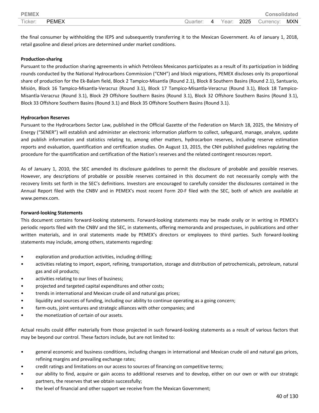 PEMEX Consolidated Ticker: PEMEX Quarter: 4 Year: 2025 Currency: MXN 40 of 130 the final consumer by withholding the IEPS and subsequently transferring it to the Mexican Government. As of January 1, 2018, retail gasoline and diesel prices are determined under market conditions. Production-sharing Pursuant to the production sharing agreements in which Petróleos Mexicanos participates as a result of its participation in bidding rounds conducted by the National Hydrocarbons Commission (“CNH”) and block migrations, PEMEX discloses only its proportional share of production for the Ek-Balam field, Block 2 Tampico-Misantla (Round 2.1), Block 8 Southern Basins (Round 2.1), Santuario, Misión, Block 16 Tampico-Misantla-Veracruz (Round 3.1), Block 17 Tampico-Misantla-Veracruz (Round 3.1), Block 18 Tampico- Misantla-Veracruz (Round 3.1), Block 29 Offshore Southern Basins (Round 3.1), Block 32 Offshore Southern Basins (Round 3.1), Block 33 Offshore Southern Basins (Round 3.1) and Block 35 Offshore Southern Basins (Round 3.1). Hydrocarbon Reserves Pursuant to the Hydrocarbons Sector Law, published in the Official Gazette of the Federation on March 18, 2025, the Ministry of Energy (“SENER”) will establish and administer an electronic information platform to collect, safeguard, manage, analyze, update and publish information and statistics relating to, among other matters, hydrocarbon reserves, including reserve estimation reports and evaluation, quantification and certification studies. On August 13, 2015, the CNH published guidelines regulating the procedure for the quantification and certification of the Nation’s reserves and the related contingent resources report. As of January 1, 2010, the SEC amended its disclosure guidelines to permit the disclosure of probable and possible reserves. However, any descriptions of probable or possible reserves contained in this document do not necessarily comply with the recovery limits set forth in the SEC’s definitions. Investors are encouraged to carefully consider the disclosures contained in the Annual Report filed with the CNBV and in PEMEX’s most recent Form 20-F filed with the SEC, both of which are available at www.pemex.com. Forward-looking Statements This document contains forward-looking statements. Forward-looking statements may be made orally or in writing in PEMEX’s periodic reports filed with the CNBV and the SEC, in statements, offering memoranda and prospectuses, in publications and other written materials, and in oral statements made by PEMEX’s directors or employees to third parties. Such forward-looking statements may include, among others, statements regarding: • exploration and production activities, including drilling; • activities relating to import, export, refining, transportation, storage and distribution of petrochemicals, petroleum, natural gas and oil products; • activities relating to our lines of business; • projected and targeted capital expenditures and other costs; • trends in international and Mexican crude oil and natural gas prices; • liquidity and sources of funding, including our ability to continue operating as a going concern; • farm-outs, joint ventures and strategic alliances with other companies; and • the monetization of certain of our assets. Actual results could differ materially from those projected in such forward-looking statements as a result of various factors that may be beyond our control. These factors include, but are not limited to: • general economic and business conditions, including changes in international and Mexican crude oil and natural gas prices, refining margins and prevailing exchange rates; • credit ratings and limitations on our access to sources of financing on competitive terms; • our ability to find, acquire or gain access to additional reserves and to develop, either on our own or with our strategic partners, the reserves that we obtain successfully; • the level of financial and other support we receive from the Mexican Government;