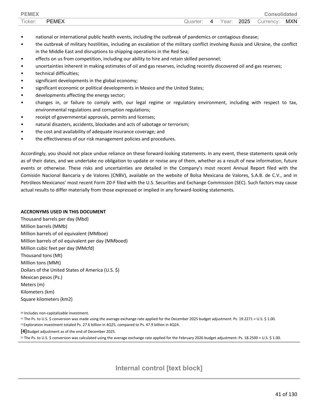 PEMEX Consolidated Ticker: PEMEX Quarter: 4 Year: 2025 Currency: MXN 41 of 130 • national or international public health events, including the outbreak of pandemics or contagious disease; • the outbreak of military hostilities, including an escalation of the military conflict involving Russia and Ukraine, the conflict in the Middle East and disruptions to shipping operations in the Red Sea; • effects on us from competition, including our ability to hire and retain skilled personnel; • uncertainties inherent in making estimates of oil and gas reserves, including recently discovered oil and gas reserves; • technical difficulties; • significant developments in the global economy; • significant economic or political developments in Mexico and the United States; • developments affecting the energy sector; • changes in, or failure to comply with, our legal regime or regulatory environment, including with respect to tax, environmental regulations and corruption regulations; • receipt of governmental approvals, permits and licenses; • natural disasters, accidents, blockades and acts of sabotage or terrorism; • the cost and availability of adequate insurance coverage; and • the effectiveness of our risk management policies and procedures. Accordingly, you should not place undue reliance on these forward-looking statements. In any event, these statements speak only as of their dates, and we undertake no obligation to update or revise any of them, whether as a result of new information, future events or otherwise. These risks and uncertainties are detailed in the Company’s most recent Annual Report filed with the Comisión Nacional Bancaria y de Valores (CNBV), available on the website of Bolsa Mexicana de Valores, S.A.B. de C.V., and in Petróleos Mexicanos’ most recent Form 20-F filed with the U.S. Securities and Exchange Commission (SEC). Such factors may cause actual results to differ materially from those expressed or implied in any forward-looking statements. ACCRONYMS USED IN THIS DOCUMENT Thousand barrels per day (Mbd) Million barrels (MMb) Million barrels of oil equivalent (MMboe) Million barrels of oil equivalent per day (MMboed) Million cubic feet per day (MMcfd) Thousand tons (Mt) Million tons (MMt) Dollars of the United States of America (U.S. $) Mexican pesos (Ps.) Meters (m) Kilometers (km) Square kilometers (km2) [1] Includes non-capitalizable investment. [2] The Ps. to U.S. $ conversion was made using the average exchange rate applied for the December 2025 budget adjustment: Ps. 19.2271 = U.S. $ 1.00. [3] Exploration investment totaled Ps. 27.6 billion in 4Q25, compared to Ps. 47.9 billion in 4Q24. [4] Budget adjustment as of the end of December 2025. [5] The Ps. to U.S. $ conversion was calculated using the average exchange rate applied for the February 2026 budget adjustment: Ps. 18.2500 = U.S. $ 1.00. Internal control [text block]