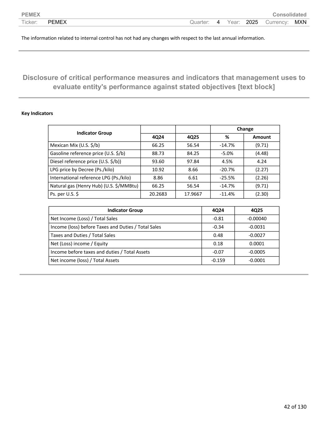 PEMEX Consolidated Ticker: PEMEX Quarter: 4 Year: 2025 Currency: MXN 42 of 130 The information related to internal control has not had any changes with respect to the last annual information. Disclosure of critical performance measures and indicators that management uses to evaluate entity's performance against stated objectives [text block] Key Indicators Change Indicator Group 4Q24 4Q25 % Amount Mexican Mix (U.S. $/b) 66.25 56.54 -14.7% (9.71) Gasoline reference price (U.S. $/b) 88.73 84.25 -5.0% (4.48) Diesel reference price (U.S. $/b)) 93.60 97.84 4.5% 4.24 LPG price by Decree (Ps./kilo) 10.92 8.66 -20.7% (2.27) International reference LPG (Ps./kilo) 8.86 6.61 -25.5% (2.26) Natural gas (Henry Hub) (U.S. $/MMBtu) 66.25 56.54 -14.7% (9.71) Ps. per U.S. $ 20.2683 17.9667 -11.4% (2.30) Indicator Group 4Q24 4Q25 Net Income (Loss) / Total Sales -0.81 -0.00040 Income (loss) before Taxes and Duties / Total Sales -0.34 -0.0031 Taxes and Duties / Total Sales 0.48 -0.0027 Net (Loss) income / Equity 0.18 0.0001 Income before taxes and duties / Total Assets -0.07 -0.0005 Net income (loss) / Total Assets -0.159 -0.0001