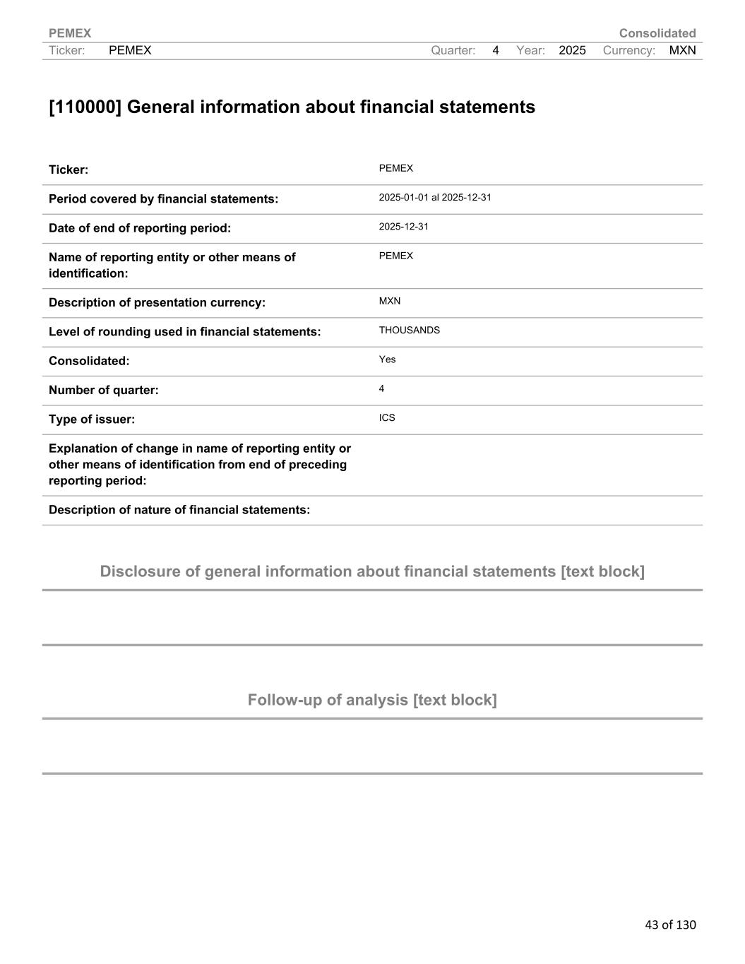 PEMEX Consolidated Ticker: PEMEX Quarter: 4 Year: 2025 Currency: MXN 43 of 130 [110000] General information about financial statements Ticker: PEMEX Period covered by financial statements: 2025-01-01 al 2025-12-31 Date of end of reporting period: 2025-12-31 Name of reporting entity or other means of identification: PEMEX Description of presentation currency: MXN Level of rounding used in financial statements: THOUSANDS Consolidated: Yes Number of quarter: 4 Type of issuer: ICS Explanation of change in name of reporting entity or other means of identification from end of preceding reporting period: Description of nature of financial statements: Disclosure of general information about financial statements [text block] Follow-up of analysis [text block]