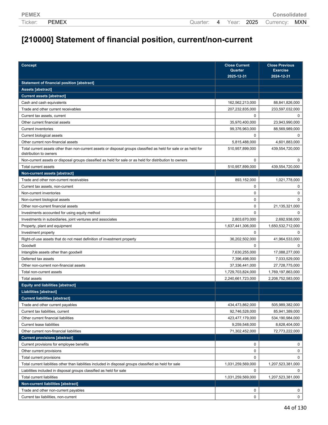 PEMEX Consolidated Ticker: PEMEX Quarter: 4 Year: 2025 Currency: MXN 44 of 130 [210000] Statement of financial position, current/non-current Concept Close Current Quarter 2025-12-31 Close Previous Exercise 2024-12-31 Statement of financial position [abstract] Assets [abstract] Current assets [abstract] Cash and cash equivalents 162,562,213,000 88,841,826,000 Trade and other current receivables 207,232,835,000 233,597,032,000 Current tax assets, current 0 0 Other current financial assets 35,970,400,000 23,943,990,000 Current inventories 99,376,963,000 88,569,989,000 Current biological assets 0 0 Other current non-financial assets 5,815,488,000 4,601,883,000 Total current assets other than non-current assets or disposal groups classified as held for sale or as held for distribution to owners 510,957,899,000 439,554,720,000 Non-current assets or disposal groups classified as held for sale or as held for distribution to owners 0 0 Total current assets 510,957,899,000 439,554,720,000 Non-current assets [abstract] Trade and other non-current receivables 893,152,000 1,021,778,000 Current tax assets, non-current 0 0 Non-current inventories 0 0 Non-current biological assets 0 0 Other non-current financial assets 0 21,135,321,000 Investments accounted for using equity method 0 0 Investments in subsidiaries, joint ventures and associates 2,803,670,000 2,692,938,000 Property, plant and equipment 1,637,441,306,000 1,650,532,712,000 Investment property 0 0 Right-of-use assets that do not meet definition of investment property 36,202,502,000 41,964,533,000 Goodwill 0 0 Intangible assets other than goodwill 7,630,255,000 17,088,277,000 Deferred tax assets 7,396,498,000 7,033,529,000 Other non-current non-financial assets 37,336,441,000 27,728,775,000 Total non-current assets 1,729,703,824,000 1,769,197,863,000 Total assets 2,240,661,723,000 2,208,752,583,000 Equity and liabilities [abstract] Liabilities [abstract] Current liabilities [abstract] Trade and other current payables 434,473,862,000 505,989,382,000 Current tax liabilities, current 92,746,528,000 85,941,389,000 Other current financial liabilities 423,477,179,000 534,190,984,000 Current lease liabilities 9,259,548,000 8,628,404,000 Other current non-financial liabilities 71,302,452,000 72,773,222,000 Current provisions [abstract] Current provisions for employee benefits 0 0 Other current provisions 0 0 Total current provisions 0 0 Total current liabilities other than liabilities included in disposal groups classified as held for sale 1,031,259,569,000 1,207,523,381,000 Liabilities included in disposal groups classified as held for sale 0 0 Total current liabilities 1,031,259,569,000 1,207,523,381,000 Non-current liabilities [abstract] Trade and other non-current payables 0 0 Current tax liabilities, non-current 0 0