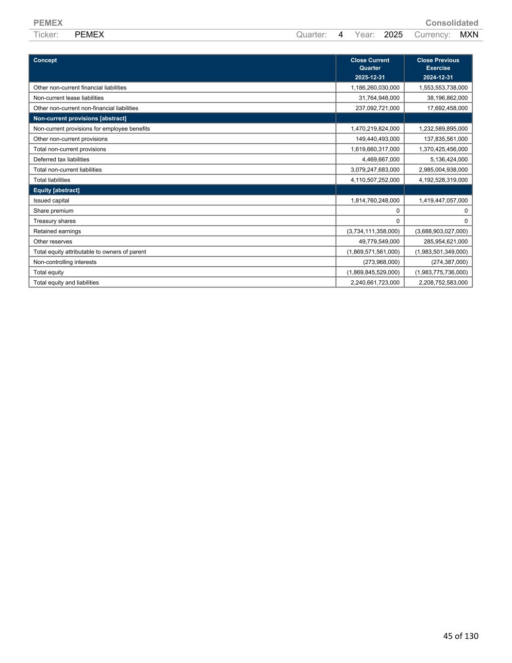 PEMEX Consolidated Ticker: PEMEX Quarter: 4 Year: 2025 Currency: MXN 45 of 130 Concept Close Current Quarter 2025-12-31 Close Previous Exercise 2024-12-31 Other non-current financial liabilities 1,186,260,030,000 1,553,553,738,000 Non-current lease liabilities 31,764,948,000 38,196,862,000 Other non-current non-financial liabilities 237,092,721,000 17,692,458,000 Non-current provisions [abstract] Non-current provisions for employee benefits 1,470,219,824,000 1,232,589,895,000 Other non-current provisions 149,440,493,000 137,835,561,000 Total non-current provisions 1,619,660,317,000 1,370,425,456,000 Deferred tax liabilities 4,469,667,000 5,136,424,000 Total non-current liabilities 3,079,247,683,000 2,985,004,938,000 Total liabilities 4,110,507,252,000 4,192,528,319,000 Equity [abstract] Issued capital 1,814,760,248,000 1,419,447,057,000 Share premium 0 0 Treasury shares 0 0 Retained earnings (3,734,111,358,000) (3,688,903,027,000) Other reserves 49,779,549,000 285,954,621,000 Total equity attributable to owners of parent (1,869,571,561,000) (1,983,501,349,000) Non-controlling interests (273,968,000) (274,387,000) Total equity (1,869,845,529,000) (1,983,775,736,000) Total equity and liabilities 2,240,661,723,000 2,208,752,583,000