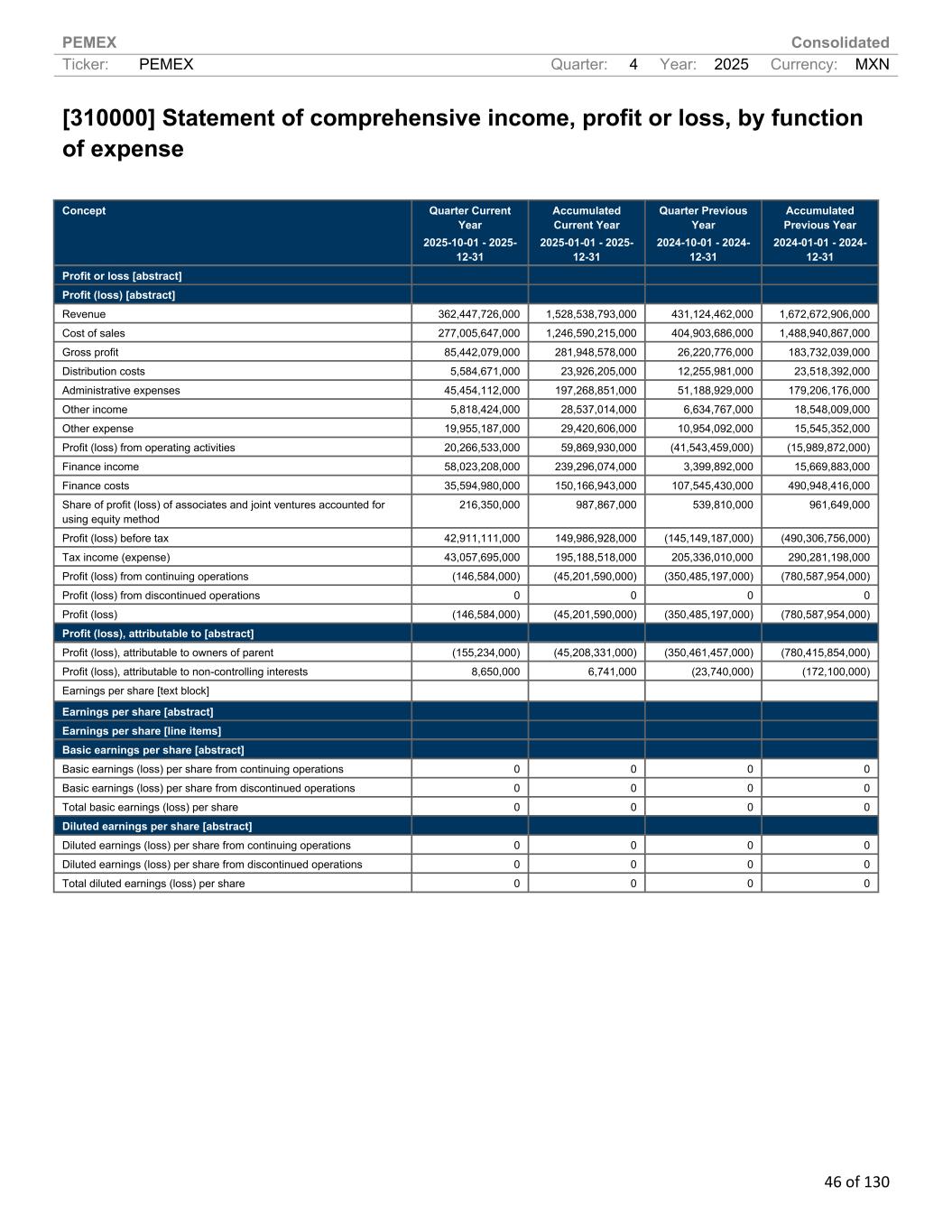PEMEX Consolidated Ticker: PEMEX Quarter: 4 Year: 2025 Currency: MXN 46 of 130 [310000] Statement of comprehensive income, profit or loss, by function of expense Concept Quarter Current Year 2025-10-01 - 2025- 12-31 Accumulated Current Year 2025-01-01 - 2025- 12-31 Quarter Previous Year 2024-10-01 - 2024- 12-31 Accumulated Previous Year 2024-01-01 - 2024- 12-31 Profit or loss [abstract] Profit (loss) [abstract] Revenue 362,447,726,000 1,528,538,793,000 431,124,462,000 1,672,672,906,000 Cost of sales 277,005,647,000 1,246,590,215,000 404,903,686,000 1,488,940,867,000 Gross profit 85,442,079,000 281,948,578,000 26,220,776,000 183,732,039,000 Distribution costs 5,584,671,000 23,926,205,000 12,255,981,000 23,518,392,000 Administrative expenses 45,454,112,000 197,268,851,000 51,188,929,000 179,206,176,000 Other income 5,818,424,000 28,537,014,000 6,634,767,000 18,548,009,000 Other expense 19,955,187,000 29,420,606,000 10,954,092,000 15,545,352,000 Profit (loss) from operating activities 20,266,533,000 59,869,930,000 (41,543,459,000) (15,989,872,000) Finance income 58,023,208,000 239,296,074,000 3,399,892,000 15,669,883,000 Finance costs 35,594,980,000 150,166,943,000 107,545,430,000 490,948,416,000 Share of profit (loss) of associates and joint ventures accounted for using equity method 216,350,000 987,867,000 539,810,000 961,649,000 Profit (loss) before tax 42,911,111,000 149,986,928,000 (145,149,187,000) (490,306,756,000) Tax income (expense) 43,057,695,000 195,188,518,000 205,336,010,000 290,281,198,000 Profit (loss) from continuing operations (146,584,000) (45,201,590,000) (350,485,197,000) (780,587,954,000) Profit (loss) from discontinued operations 0 0 0 0 Profit (loss) (146,584,000) (45,201,590,000) (350,485,197,000) (780,587,954,000) Profit (loss), attributable to [abstract] Profit (loss), attributable to owners of parent (155,234,000) (45,208,331,000) (350,461,457,000) (780,415,854,000) Profit (loss), attributable to non-controlling interests 8,650,000 6,741,000 (23,740,000) (172,100,000) Earnings per share [text block] Earnings per share [abstract] Earnings per share [line items] Basic earnings per share [abstract] Basic earnings (loss) per share from continuing operations 0 0 0 0 Basic earnings (loss) per share from discontinued operations 0 0 0 0 Total basic earnings (loss) per share 0 0 0 0 Diluted earnings per share [abstract] Diluted earnings (loss) per share from continuing operations 0 0 0 0 Diluted earnings (loss) per share from discontinued operations 0 0 0 0 Total diluted earnings (loss) per share 0 0 0 0