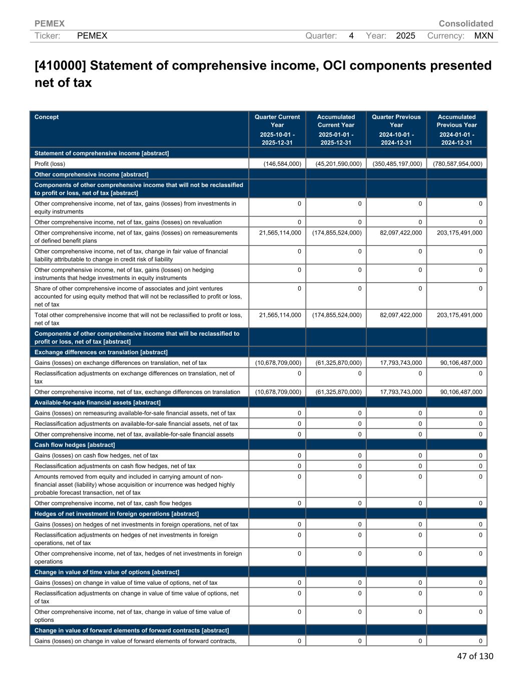 PEMEX Consolidated Ticker: PEMEX Quarter: 4 Year: 2025 Currency: MXN 47 of 130 [410000] Statement of comprehensive income, OCI components presented net of tax Concept Quarter Current Year 2025-10-01 - 2025-12-31 Accumulated Current Year 2025-01-01 - 2025-12-31 Quarter Previous Year 2024-10-01 - 2024-12-31 Accumulated Previous Year 2024-01-01 - 2024-12-31 Statement of comprehensive income [abstract] Profit (loss) (146,584,000) (45,201,590,000) (350,485,197,000) (780,587,954,000) Other comprehensive income [abstract] Components of other comprehensive income that will not be reclassified to profit or loss, net of tax [abstract] Other comprehensive income, net of tax, gains (losses) from investments in equity instruments 0 0 0 0 Other comprehensive income, net of tax, gains (losses) on revaluation 0 0 0 0 Other comprehensive income, net of tax, gains (losses) on remeasurements of defined benefit plans 21,565,114,000 (174,855,524,000) 82,097,422,000 203,175,491,000 Other comprehensive income, net of tax, change in fair value of financial liability attributable to change in credit risk of liability 0 0 0 0 Other comprehensive income, net of tax, gains (losses) on hedging instruments that hedge investments in equity instruments 0 0 0 0 Share of other comprehensive income of associates and joint ventures accounted for using equity method that will not be reclassified to profit or loss, net of tax 0 0 0 0 Total other comprehensive income that will not be reclassified to profit or loss, net of tax 21,565,114,000 (174,855,524,000) 82,097,422,000 203,175,491,000 Components of other comprehensive income that will be reclassified to profit or loss, net of tax [abstract] Exchange differences on translation [abstract] Gains (losses) on exchange differences on translation, net of tax (10,678,709,000) (61,325,870,000) 17,793,743,000 90,106,487,000 Reclassification adjustments on exchange differences on translation, net of tax 0 0 0 0 Other comprehensive income, net of tax, exchange differences on translation (10,678,709,000) (61,325,870,000) 17,793,743,000 90,106,487,000 Available-for-sale financial assets [abstract] Gains (losses) on remeasuring available-for-sale financial assets, net of tax 0 0 0 0 Reclassification adjustments on available-for-sale financial assets, net of tax 0 0 0 0 Other comprehensive income, net of tax, available-for-sale financial assets 0 0 0 0 Cash flow hedges [abstract] Gains (losses) on cash flow hedges, net of tax 0 0 0 0 Reclassification adjustments on cash flow hedges, net of tax 0 0 0 0 Amounts removed from equity and included in carrying amount of non- financial asset (liability) whose acquisition or incurrence was hedged highly probable forecast transaction, net of tax 0 0 0 0 Other comprehensive income, net of tax, cash flow hedges 0 0 0 0 Hedges of net investment in foreign operations [abstract] Gains (losses) on hedges of net investments in foreign operations, net of tax 0 0 0 0 Reclassification adjustments on hedges of net investments in foreign operations, net of tax 0 0 0 0 Other comprehensive income, net of tax, hedges of net investments in foreign operations 0 0 0 0 Change in value of time value of options [abstract] Gains (losses) on change in value of time value of options, net of tax 0 0 0 0 Reclassification adjustments on change in value of time value of options, net of tax 0 0 0 0 Other comprehensive income, net of tax, change in value of time value of options 0 0 0 0 Change in value of forward elements of forward contracts [abstract] Gains (losses) on change in value of forward elements of forward contracts, 0 0 0 0