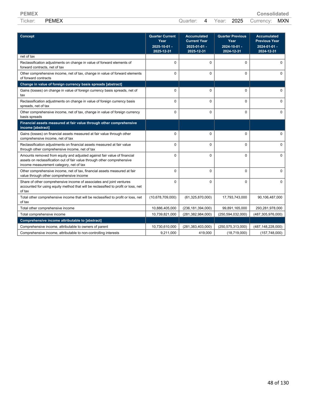 PEMEX Consolidated Ticker: PEMEX Quarter: 4 Year: 2025 Currency: MXN 48 of 130 Concept Quarter Current Year 2025-10-01 - 2025-12-31 Accumulated Current Year 2025-01-01 - 2025-12-31 Quarter Previous Year 2024-10-01 - 2024-12-31 Accumulated Previous Year 2024-01-01 - 2024-12-31 net of tax Reclassification adjustments on change in value of forward elements of forward contracts, net of tax 0 0 0 0 Other comprehensive income, net of tax, change in value of forward elements of forward contracts 0 0 0 0 Change in value of foreign currency basis spreads [abstract] Gains (losses) on change in value of foreign currency basis spreads, net of tax 0 0 0 0 Reclassification adjustments on change in value of foreign currency basis spreads, net of tax 0 0 0 0 Other comprehensive income, net of tax, change in value of foreign currency basis spreads 0 0 0 0 Financial assets measured at fair value through other comprehensive income [abstract] Gains (losses) on financial assets measured at fair value through other comprehensive income, net of tax 0 0 0 0 Reclassification adjustments on financial assets measured at fair value through other comprehensive income, net of tax 0 0 0 0 Amounts removed from equity and adjusted against fair value of financial assets on reclassification out of fair value through other comprehensive income measurement category, net of tax 0 0 0 0 Other comprehensive income, net of tax, financial assets measured at fair value through other comprehensive income 0 0 0 0 Share of other comprehensive income of associates and joint ventures accounted for using equity method that will be reclassified to profit or loss, net of tax 0 0 0 0 Total other comprehensive income that will be reclassified to profit or loss, net of tax (10,678,709,000) (61,325,870,000) 17,793,743,000 90,106,487,000 Total other comprehensive income 10,886,405,000 (236,181,394,000) 99,891,165,000 293,281,978,000 Total comprehensive income 10,739,821,000 (281,382,984,000) (250,594,032,000) (487,305,976,000) Comprehensive income attributable to [abstract] Comprehensive income, attributable to owners of parent 10,730,610,000 (281,383,403,000) (250,575,313,000) (487,148,228,000) Comprehensive income, attributable to non-controlling interests 9,211,000 419,000 (18,719,000) (157,748,000)