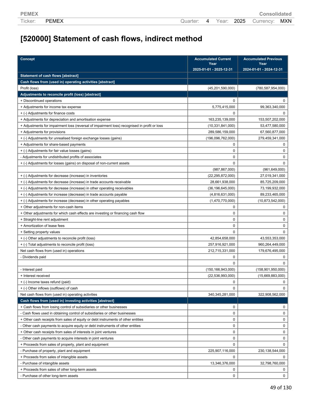 PEMEX Consolidated Ticker: PEMEX Quarter: 4 Year: 2025 Currency: MXN 49 of 130 [520000] Statement of cash flows, indirect method Concept Accumulated Current Year 2025-01-01 - 2025-12-31 Accumulated Previous Year 2024-01-01 - 2024-12-31 Statement of cash flows [abstract] Cash flows from (used in) operating activities [abstract] Profit (loss) (45,201,590,000) (780,587,954,000) Adjustments to reconcile profit (loss) [abstract] + Discontinued operations 0 0 + Adjustments for income tax expense 5,775,415,000 99,363,340,000 + (-) Adjustments for finance costs 0 0 + Adjustments for depreciation and amortisation expense 163,235,139,000 153,507,202,000 + Adjustments for impairment loss (reversal of impairment loss) recognised in profit or loss (10,331,841,000) 53,477,580,000 + Adjustments for provisions 289,586,159,000 67,560,877,000 + (-) Adjustments for unrealised foreign exchange losses (gains) (196,096,762,000) 279,459,341,000 + Adjustments for share-based payments 0 0 + (-) Adjustments for fair value losses (gains) 0 0 - Adjustments for undistributed profits of associates 0 0 + (-) Adjustments for losses (gains) on disposal of non-current assets 0 0 (987,867,000) (961,649,000) + (-) Adjustments for decrease (increase) in inventories (22,295,872,000) 27,019,341,000 + (-) Adjustments for decrease (increase) in trade accounts receivable 28,661,938,000 85,725,209,000 + (-) Adjustments for decrease (increase) in other operating receivables (36,196,645,000) 73,199,932,000 + (-) Adjustments for increase (decrease) in trade accounts payable (4,816,631,000) 89,233,465,000 + (-) Adjustments for increase (decrease) in other operating payables (1,470,770,000) (10,873,542,000) + Other adjustments for non-cash items 0 0 + Other adjustments for which cash effects are investing or financing cash flow 0 0 + Straight-line rent adjustment 0 0 + Amortization of lease fees 0 0 + Setting property values 0 0 + (-) Other adjustments to reconcile profit (loss) 42,854,658,000 43,553,353,000 + (-) Total adjustments to reconcile profit (loss) 257,916,921,000 960,264,449,000 Net cash flows from (used in) operations 212,715,331,000 179,676,495,000 - Dividends paid 0 0 0 0 - Interest paid (150,166,943,000) (158,901,950,000) + Interest received (22,536,993,000) (15,669,883,000) + (-) Income taxes refund (paid) 0 0 + (-) Other inflows (outflows) of cash 0 0 Net cash flows from (used in) operating activities 340,345,281,000 322,908,562,000 Cash flows from (used in) investing activities [abstract] + Cash flows from losing control of subsidiaries or other businesses 0 0 - Cash flows used in obtaining control of subsidiaries or other businesses 0 0 + Other cash receipts from sales of equity or debt instruments of other entities 0 0 - Other cash payments to acquire equity or debt instruments of other entities 0 0 + Other cash receipts from sales of interests in joint ventures 0 0 - Other cash payments to acquire interests in joint ventures 0 0 + Proceeds from sales of property, plant and equipment 0 0 - Purchase of property, plant and equipment 225,907,116,000 230,138,544,000 + Proceeds from sales of intangible assets 0 0 - Purchase of intangible assets 13,346,376,000 32,798,760,000 + Proceeds from sales of other long-term assets 0 0 - Purchase of other long-term assets 0 0