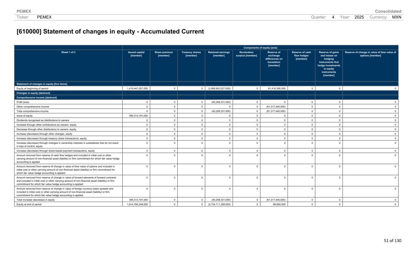 PEMEX Consolidated Ticker: PEMEX Quarter: 4 Year: 2025 Currency: MXN 51 of 130 [610000] Statement of changes in equity - Accumulated Current Components of equity [axis] Sheet 1 of 3 Issued capital [member] Share premium [member] Treasury shares [member] Retained earnings [member] Revaluation surplus [member] Reserve of exchange differences on translation [member] Reserve of cash flow hedges [member] Reserve of gains and losses on hedging instruments that hedge investments in equity instruments [member] Reserve of change in value of time value of options [member] Statement of changes in equity [line items] Equity at beginning of period 1,419,447,057,000 0 0 (3,688,903,027,000) 0 61,416,390,000 0 0 0 Changes in equity [abstract] Comprehensive income [abstract] Profit (loss) 0 0 0 (45,208,331,000) 0 0 0 0 0 Other comprehensive income 0 0 0 0 0 (61,317,440,000) 0 0 0 Total comprehensive income 0 0 0 (45,208,331,000) 0 (61,317,440,000) 0 0 0 Issue of equity 395,313,191,000 0 0 0 0 0 0 0 0 Dividends recognised as distributions to owners 0 0 0 0 0 0 0 0 0 Increase through other contributions by owners, equity 0 0 0 0 0 0 0 0 0 Decrease through other distributions to owners, equity 0 0 0 0 0 0 0 0 0 Increase (decrease) through other changes, equity 0 0 0 0 0 0 0 0 0 Increase (decrease) through treasury share transactions, equity 0 0 0 0 0 0 0 0 0 Increase (decrease) through changes in ownership interests in subsidiaries that do not result in loss of control, equity 0 0 0 0 0 0 0 0 0 Increase (decrease) through share-based payment transactions, equity 0 0 0 0 0 0 0 0 0 Amount removed from reserve of cash flow hedges and included in initial cost or other carrying amount of non-financial asset (liability) or firm commitment for which fair value hedge accounting is applied 0 0 0 0 0 0 0 0 0 Amount removed from reserve of change in value of time value of options and included in initial cost or other carrying amount of non-financial asset (liability) or firm commitment for which fair value hedge accounting is applied 0 0 0 0 0 0 0 0 0 Amount removed from reserve of change in value of forward elements of forward contracts and included in initial cost or other carrying amount of non-financial asset (liability) or firm commitment for which fair value hedge accounting is applied 0 0 0 0 0 0 0 0 0 Amount removed from reserve of change in value of foreign currency basis spreads and included in initial cost or other carrying amount of non-financial asset (liability) or firm commitment for which fair value hedge accounting is applied 0 0 0 0 0 0 0 0 0 Total increase (decrease) in equity 395,313,191,000 0 0 (45,208,331,000) 0 (61,317,440,000) 0 0 0 Equity at end of period 1,814,760,248,000 0 0 (3,734,111,358,000) 0 98,950,000 0 0 0