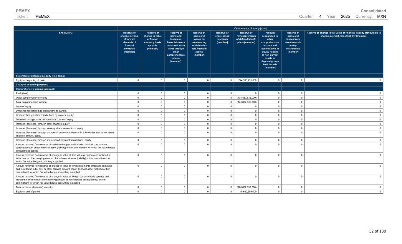 PEMEX Consolidated Ticker: PEMEX Quarter: 4 Year: 2025 Currency: MXN 52 of 130 Components of equity [axis] Sheet 2 of 3 Reserve of change in value of forward elements of forward contracts [member] Reserve of change in value of foreign currency basis spreads [member] Reserve of gains and losses on financial assets measured at fair value through other comprehensive income [member] Reserve of gains and losses on remeasuring available-for- sale financial assets [member] Reserve of share-based payments [member] Reserve of remeasurements of defined benefit plans [member] Amount recognised in other comprehensive income and accumulated in equity relating to non-current assets or disposal groups held for sale [member] Reserve of gains and losses from investments in equity instruments [member] Reserve of change in fair value of financial liability attributable to change in credit risk of liability [member] Statement of changes in equity [line items] Equity at beginning of period 0 0 0 0 0 224,538,231,000 0 0 0 Changes in equity [abstract] Comprehensive income [abstract] Profit (loss) 0 0 0 0 0 0 0 0 0 Other comprehensive income 0 0 0 0 0 (174,857,632,000) 0 0 0 Total comprehensive income 0 0 0 0 0 (174,857,632,000) 0 0 0 Issue of equity 0 0 0 0 0 0 0 0 0 Dividends recognised as distributions to owners 0 0 0 0 0 0 0 0 0 Increase through other contributions by owners, equity 0 0 0 0 0 0 0 0 0 Decrease through other distributions to owners, equity 0 0 0 0 0 0 0 0 0 Increase (decrease) through other changes, equity 0 0 0 0 0 0 0 0 0 Increase (decrease) through treasury share transactions, equity 0 0 0 0 0 0 0 0 0 Increase (decrease) through changes in ownership interests in subsidiaries that do not result in loss of control, equity 0 0 0 0 0 0 0 0 0 Increase (decrease) through share-based payment transactions, equity 0 0 0 0 0 0 0 0 0 Amount removed from reserve of cash flow hedges and included in initial cost or other carrying amount of non-financial asset (liability) or firm commitment for which fair value hedge accounting is applied 0 0 0 0 0 0 0 0 0 Amount removed from reserve of change in value of time value of options and included in initial cost or other carrying amount of non-financial asset (liability) or firm commitment for which fair value hedge accounting is applied 0 0 0 0 0 0 0 0 0 Amount removed from reserve of change in value of forward elements of forward contracts and included in initial cost or other carrying amount of non-financial asset (liability) or firm commitment for which fair value hedge accounting is applied 0 0 0 0 0 0 0 0 0 Amount removed from reserve of change in value of foreign currency basis spreads and included in initial cost or other carrying amount of non-financial asset (liability) or firm commitment for which fair value hedge accounting is applied 0 0 0 0 0 0 0 0 0 Total increase (decrease) in equity 0 0 0 0 0 (174,857,632,000) 0 0 0 Equity at end of period 0 0 0 0 0 49,680,599,000 0 0 0