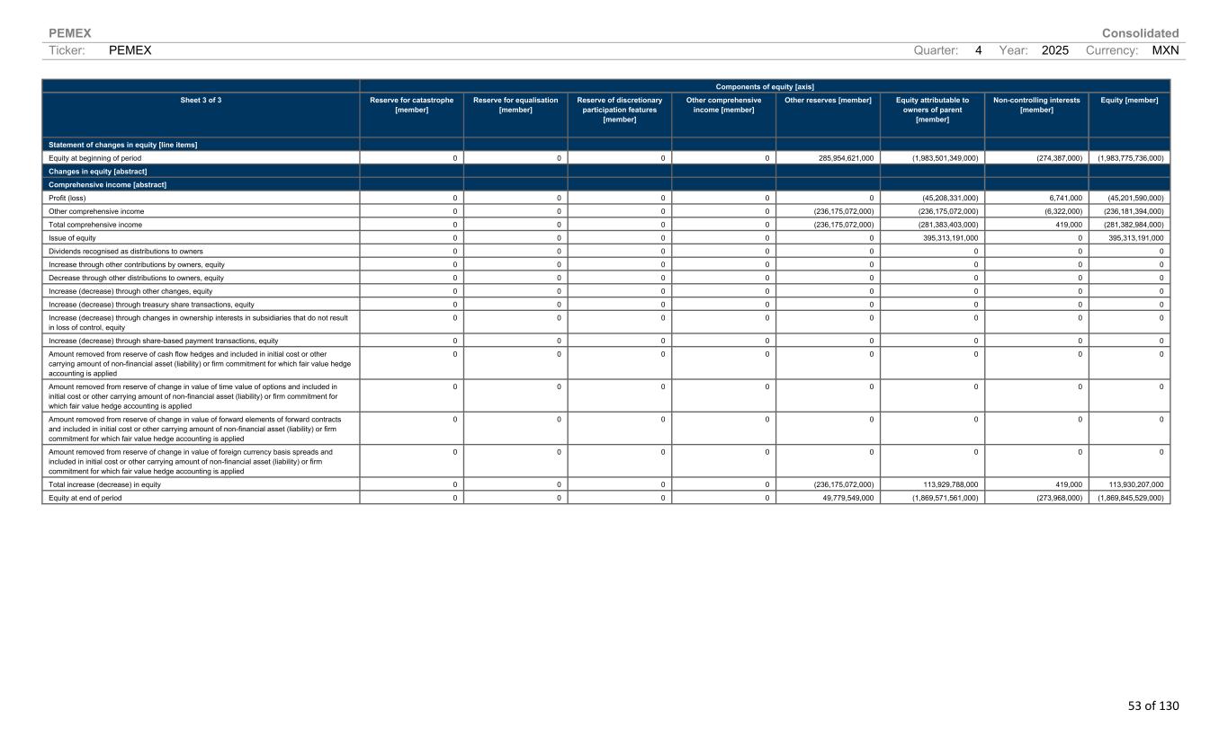 PEMEX Consolidated Ticker: PEMEX Quarter: 4 Year: 2025 Currency: MXN 53 of 130 Components of equity [axis] Sheet 3 of 3 Reserve for catastrophe [member] Reserve for equalisation [member] Reserve of discretionary participation features [member] Other comprehensive income [member] Other reserves [member] Equity attributable to owners of parent [member] Non-controlling interests [member] Equity [member] Statement of changes in equity [line items] Equity at beginning of period 0 0 0 0 285,954,621,000 (1,983,501,349,000) (274,387,000) (1,983,775,736,000) Changes in equity [abstract] Comprehensive income [abstract] Profit (loss) 0 0 0 0 0 (45,208,331,000) 6,741,000 (45,201,590,000) Other comprehensive income 0 0 0 0 (236,175,072,000) (236,175,072,000) (6,322,000) (236,181,394,000) Total comprehensive income 0 0 0 0 (236,175,072,000) (281,383,403,000) 419,000 (281,382,984,000) Issue of equity 0 0 0 0 0 395,313,191,000 0 395,313,191,000 Dividends recognised as distributions to owners 0 0 0 0 0 0 0 0 Increase through other contributions by owners, equity 0 0 0 0 0 0 0 0 Decrease through other distributions to owners, equity 0 0 0 0 0 0 0 0 Increase (decrease) through other changes, equity 0 0 0 0 0 0 0 0 Increase (decrease) through treasury share transactions, equity 0 0 0 0 0 0 0 0 Increase (decrease) through changes in ownership interests in subsidiaries that do not result in loss of control, equity 0 0 0 0 0 0 0 0 Increase (decrease) through share-based payment transactions, equity 0 0 0 0 0 0 0 0 Amount removed from reserve of cash flow hedges and included in initial cost or other carrying amount of non-financial asset (liability) or firm commitment for which fair value hedge accounting is applied 0 0 0 0 0 0 0 0 Amount removed from reserve of change in value of time value of options and included in initial cost or other carrying amount of non-financial asset (liability) or firm commitment for which fair value hedge accounting is applied 0 0 0 0 0 0 0 0 Amount removed from reserve of change in value of forward elements of forward contracts and included in initial cost or other carrying amount of non-financial asset (liability) or firm commitment for which fair value hedge accounting is applied 0 0 0 0 0 0 0 0 Amount removed from reserve of change in value of foreign currency basis spreads and included in initial cost or other carrying amount of non-financial asset (liability) or firm commitment for which fair value hedge accounting is applied 0 0 0 0 0 0 0 0 Total increase (decrease) in equity 0 0 0 0 (236,175,072,000) 113,929,788,000 419,000 113,930,207,000 Equity at end of period 0 0 0 0 49,779,549,000 (1,869,571,561,000) (273,968,000) (1,869,845,529,000)