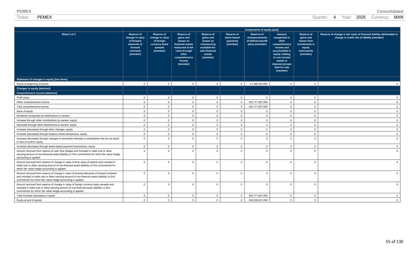 PEMEX Consolidated Ticker: PEMEX Quarter: 4 Year: 2025 Currency: MXN 55 of 130 Components of equity [axis] Sheet 2 of 3 Reserve of change in value of forward elements of forward contracts [member] Reserve of change in value of foreign currency basis spreads [member] Reserve of gains and losses on financial assets measured at fair value through other comprehensive income [member] Reserve of gains and losses on remeasuring available-for- sale financial assets [member] Reserve of share-based payments [member] Reserve of remeasurements of defined benefit plans [member] Amount recognised in other comprehensive income and accumulated in equity relating to non-current assets or disposal groups held for sale [member] Reserve of gains and losses from investments in equity instruments [member] Reserve of change in fair value of financial liability attributable to change in credit risk of liability [member] Statement of changes in equity [line items] Equity at beginning of period 0 0 0 0 0 21,366,404,000 0 0 0 Changes in equity [abstract] Comprehensive income [abstract] Profit (loss) 0 0 0 0 0 0 0 0 0 Other comprehensive income 0 0 0 0 0 203,171,827,000 0 0 0 Total comprehensive income 0 0 0 0 0 203,171,827,000 0 0 0 Issue of equity 0 0 0 0 0 0 0 0 0 Dividends recognised as distributions to owners 0 0 0 0 0 0 0 0 0 Increase through other contributions by owners, equity 0 0 0 0 0 0 0 0 0 Decrease through other distributions to owners, equity 0 0 0 0 0 0 0 0 0 Increase (decrease) through other changes, equity 0 0 0 0 0 0 0 0 0 Increase (decrease) through treasury share transactions, equity 0 0 0 0 0 0 0 0 0 Increase (decrease) through changes in ownership interests in subsidiaries that do not result in loss of control, equity 0 0 0 0 0 0 0 0 0 Increase (decrease) through share-based payment transactions, equity 0 0 0 0 0 0 0 0 0 Amount removed from reserve of cash flow hedges and included in initial cost or other carrying amount of non-financial asset (liability) or firm commitment for which fair value hedge accounting is applied 0 0 0 0 0 0 0 0 0 Amount removed from reserve of change in value of time value of options and included in initial cost or other carrying amount of non-financial asset (liability) or firm commitment for which fair value hedge accounting is applied 0 0 0 0 0 0 0 0 0 Amount removed from reserve of change in value of forward elements of forward contracts and included in initial cost or other carrying amount of non-financial asset (liability) or firm commitment for which fair value hedge accounting is applied 0 0 0 0 0 0 0 0 0 Amount removed from reserve of change in value of foreign currency basis spreads and included in initial cost or other carrying amount of non-financial asset (liability) or firm commitment for which fair value hedge accounting is applied 0 0 0 0 0 0 0 0 0 Total increase (decrease) in equity 0 0 0 0 0 203,171,827,000 0 0 0 Equity at end of period 0 0 0 0 0 224,538,231,000 0 0 0