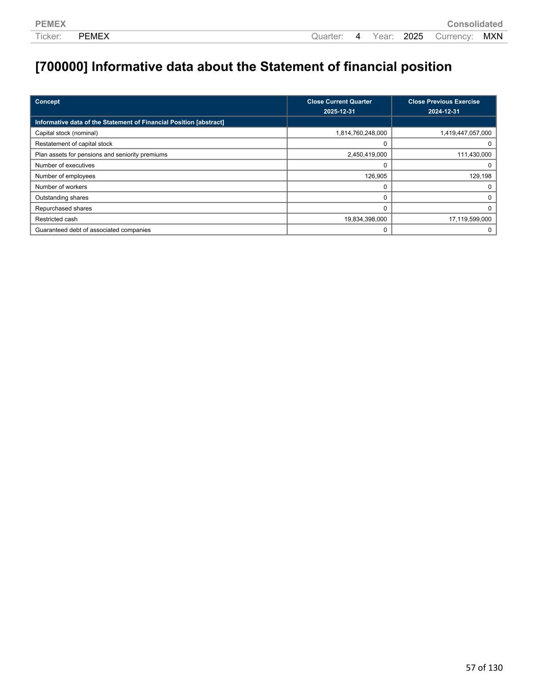 PEMEX Consolidated Ticker: PEMEX Quarter: 4 Year: 2025 Currency: MXN 57 of 130 [700000] Informative data about the Statement of financial position Concept Close Current Quarter 2025-12-31 Close Previous Exercise 2024-12-31 Informative data of the Statement of Financial Position [abstract] Capital stock (nominal) 1,814,760,248,000 1,419,447,057,000 Restatement of capital stock 0 0 Plan assets for pensions and seniority premiums 2,450,419,000 111,430,000 Number of executives 0 0 Number of employees 126,905 129,198 Number of workers 0 0 Outstanding shares 0 0 Repurchased shares 0 0 Restricted cash 19,834,398,000 17,119,599,000 Guaranteed debt of associated companies 0 0